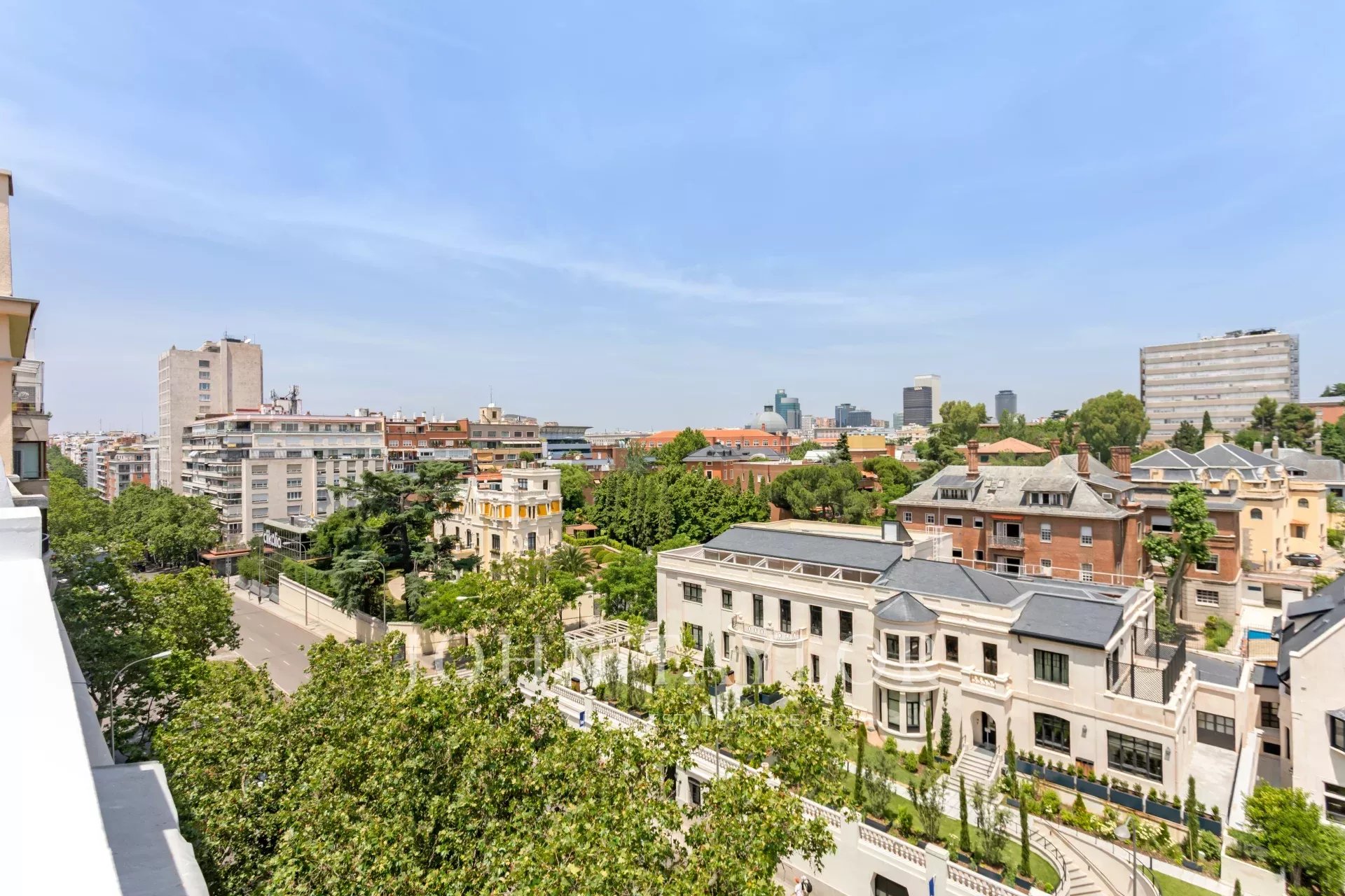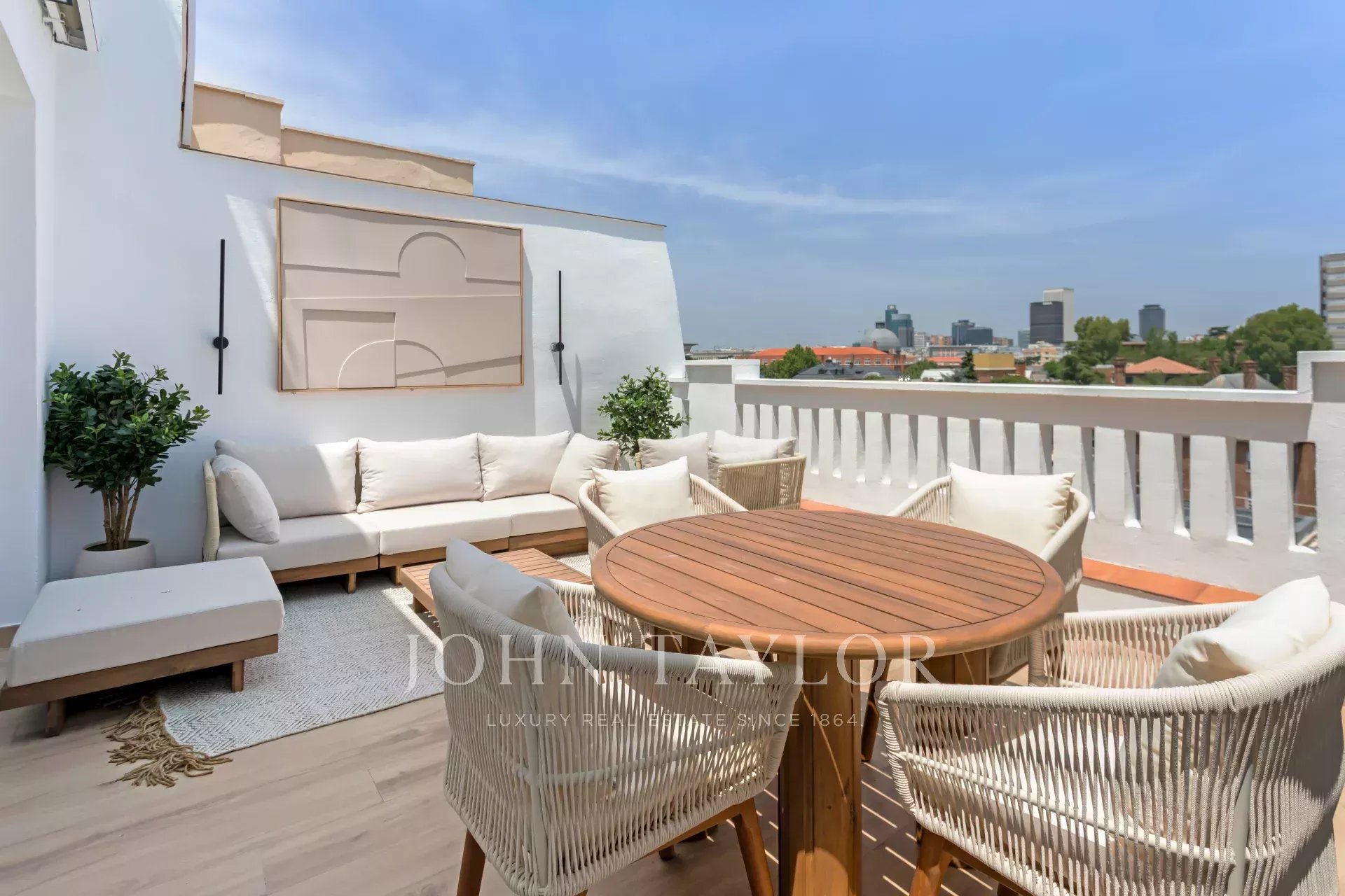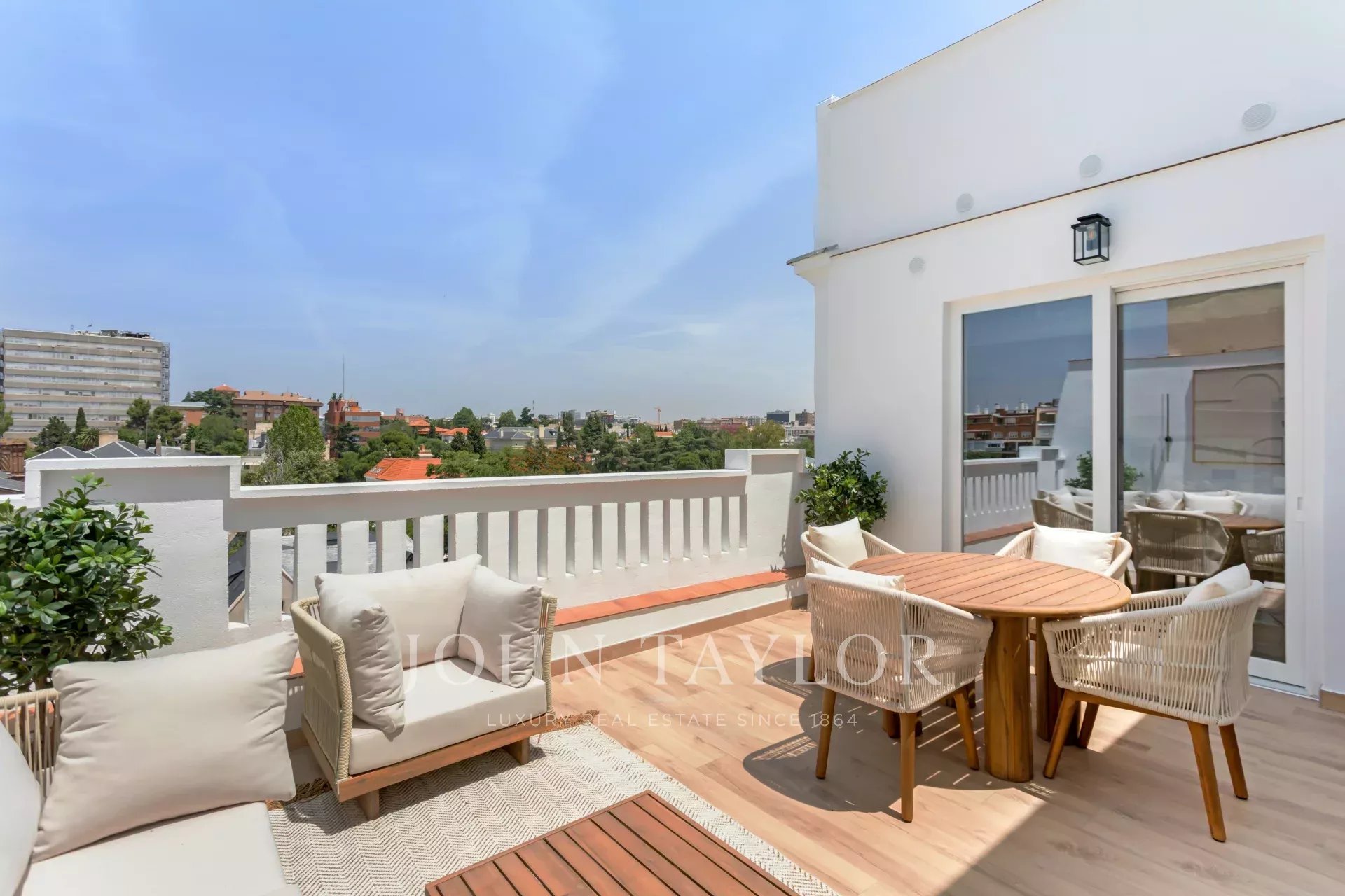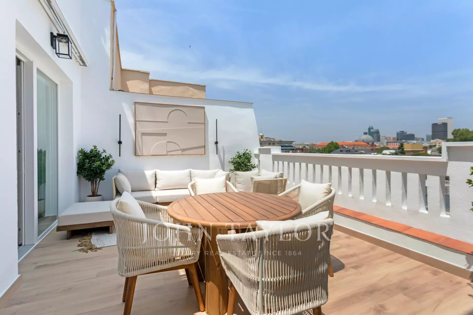 La terraza tiene forma cuadrada, una superficie de 20 m² y disfruta de hermosas vistas panorámicas hacia el norte de la capital.