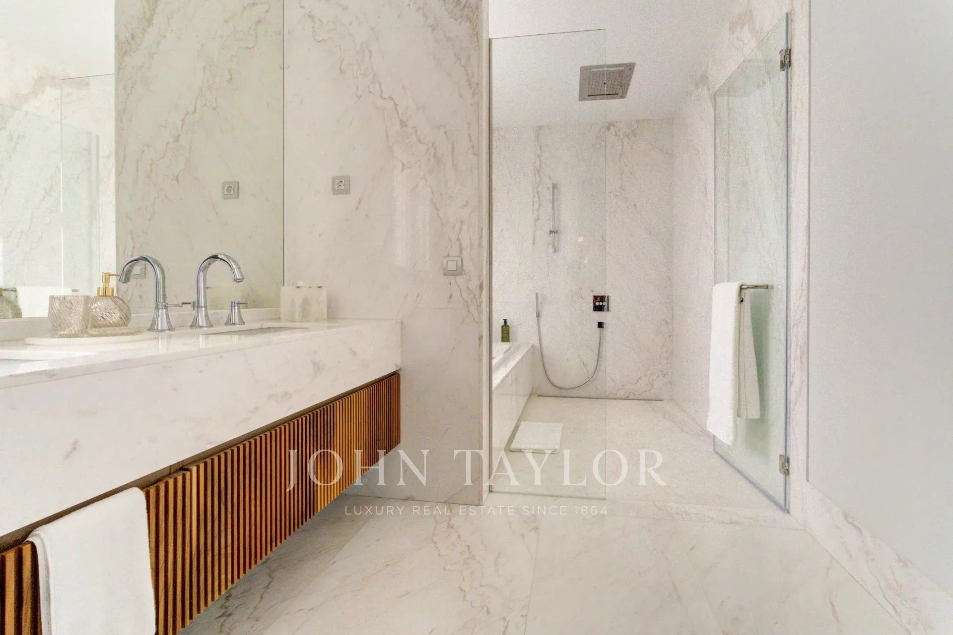 Esta imponente y única propiedad destaca sobre todo por su espectacular terraza de 56m², que preside la zona social y que se baña de luz gracias a su orientación sur. Una terraza para disfrutar al máximo, perfectamente conectada con el salón y comedor. Junto al mismo se encuentra la cocina, completamente equipada, con gran isla central y lavadero independiente. En esta zona encontramos también un aseo de invitados.