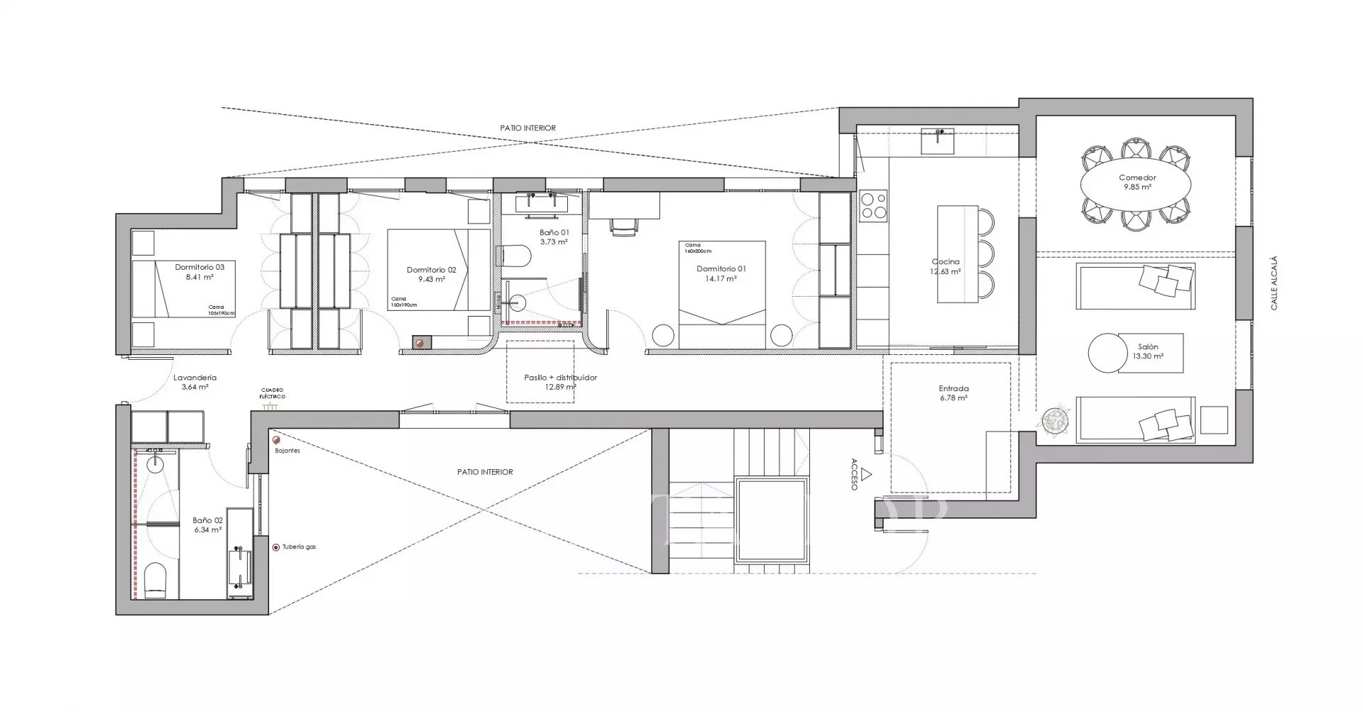 En el proyecto de reforma (opcional) se podría conseguir una distribución funcional con tres dormitorios, dos baños, aseo de invitados, salón, comedor, cocina y lavandería.