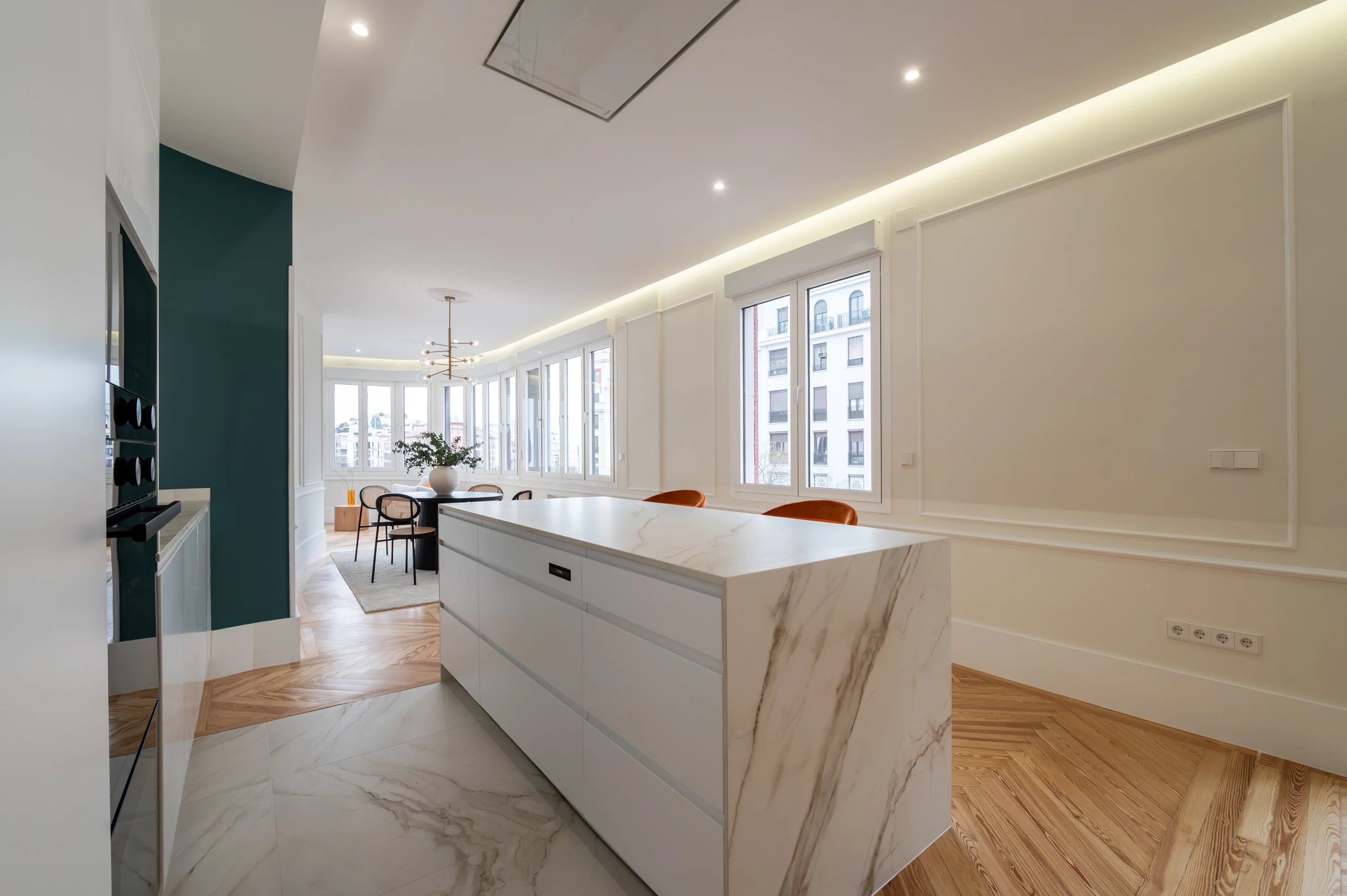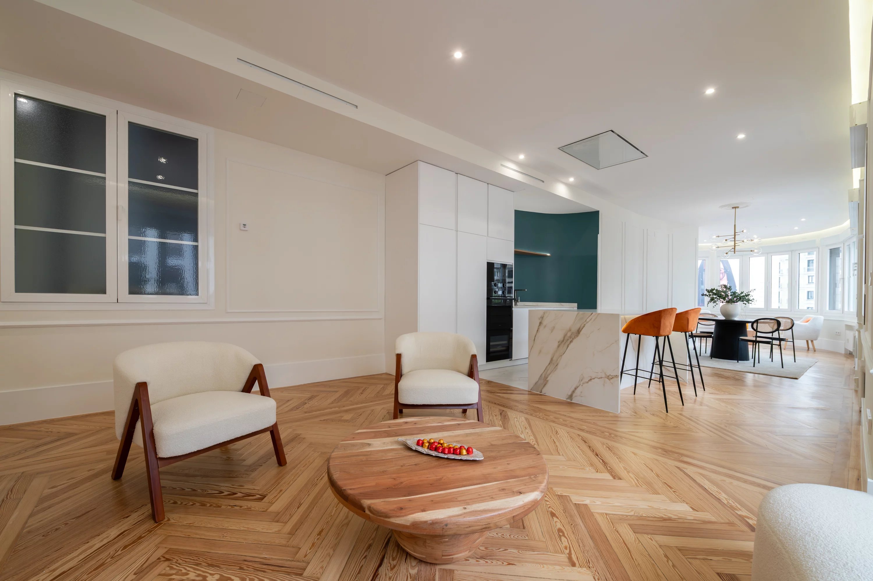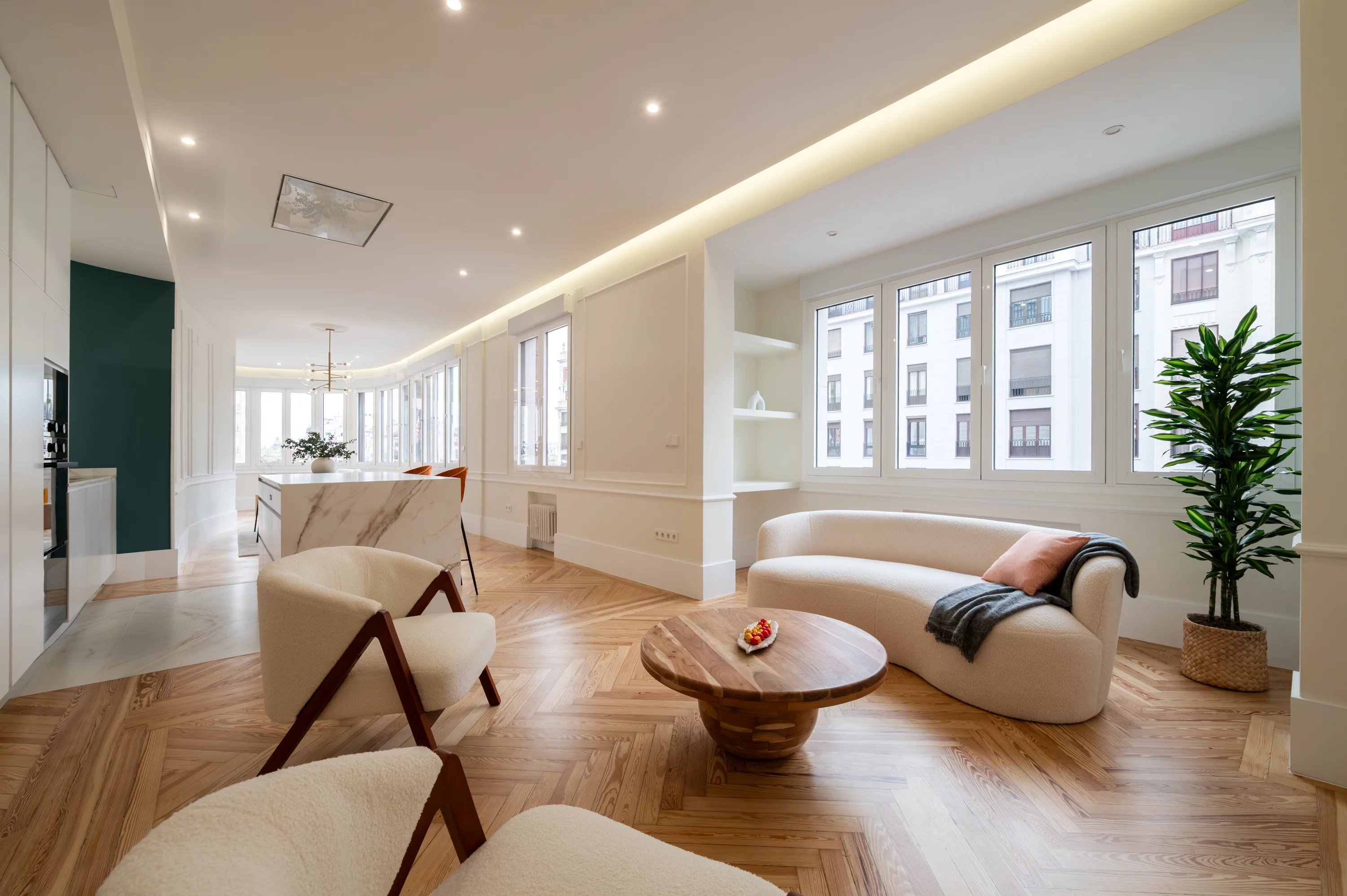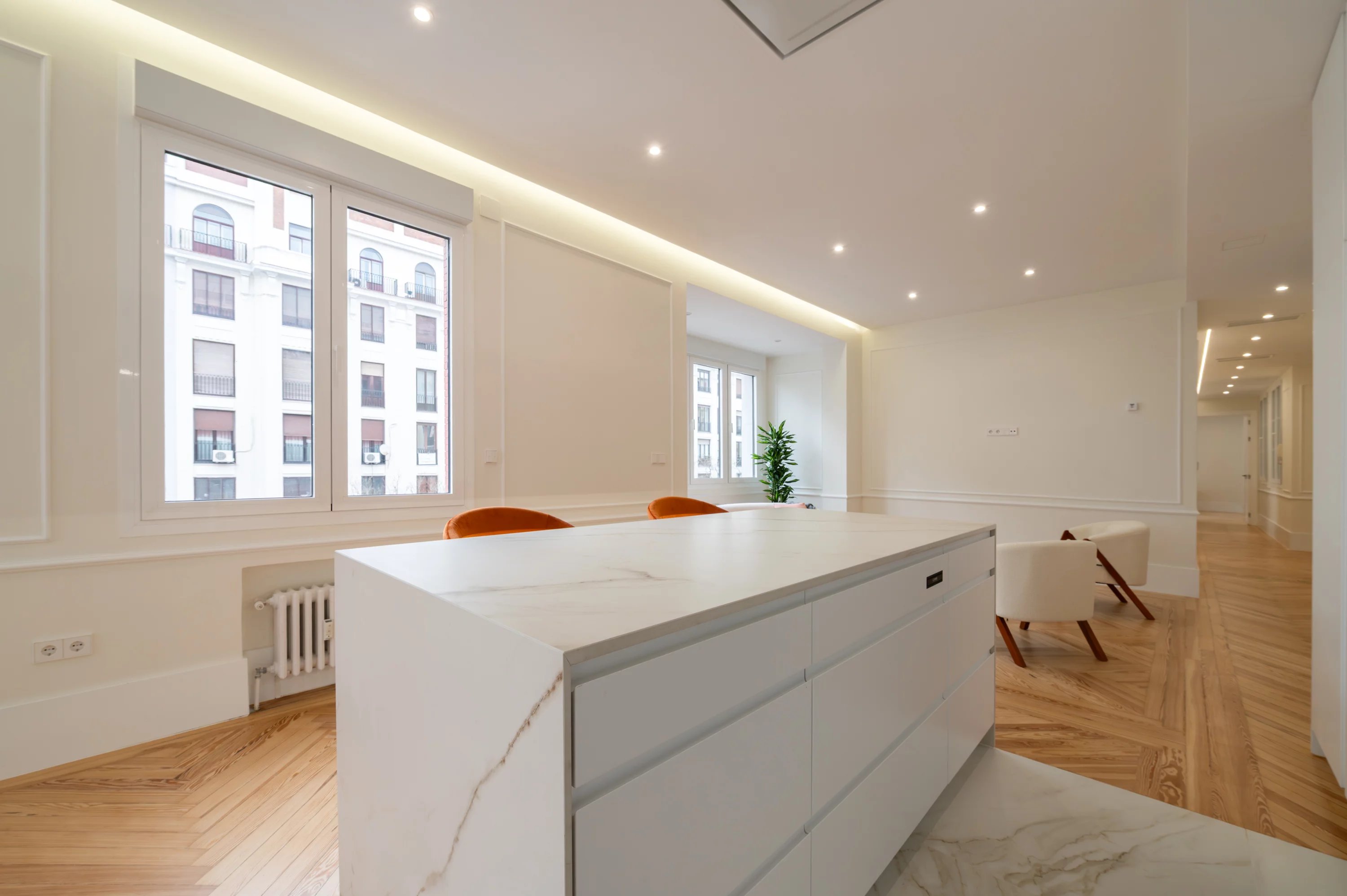El salón principal, espacioso y luminoso, se convierte en el lugar ideal para disfrutar de las vistas urbanas y del dinamismo de Madrid, mientras que la cocina, completamente equipada, ofrece un espacio práctico y elegante para el día a día.