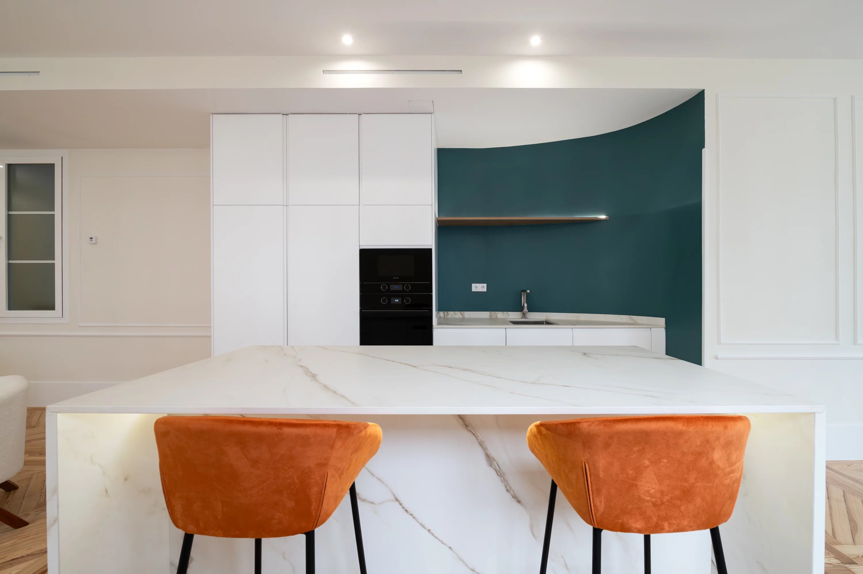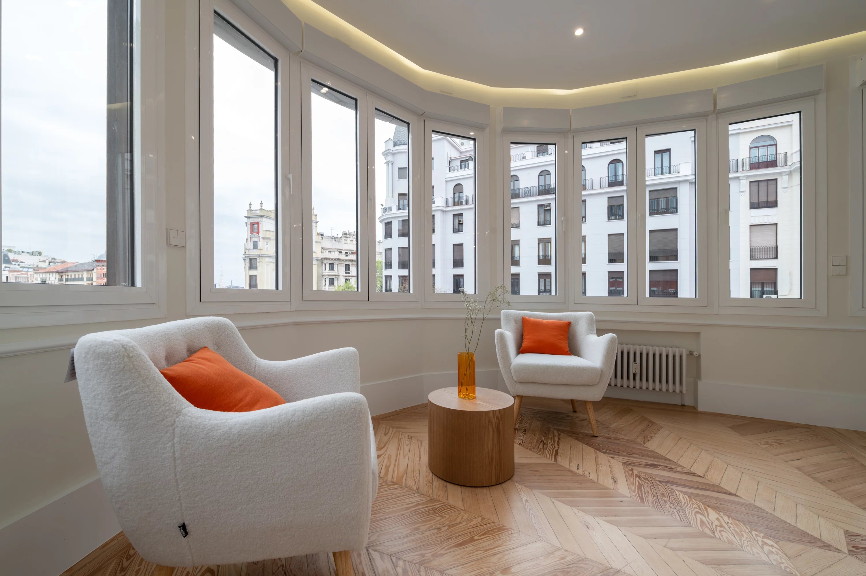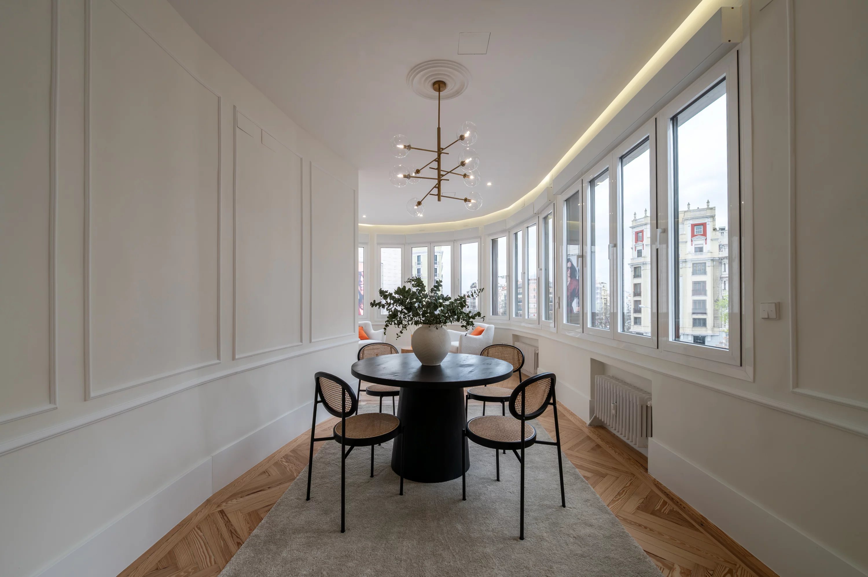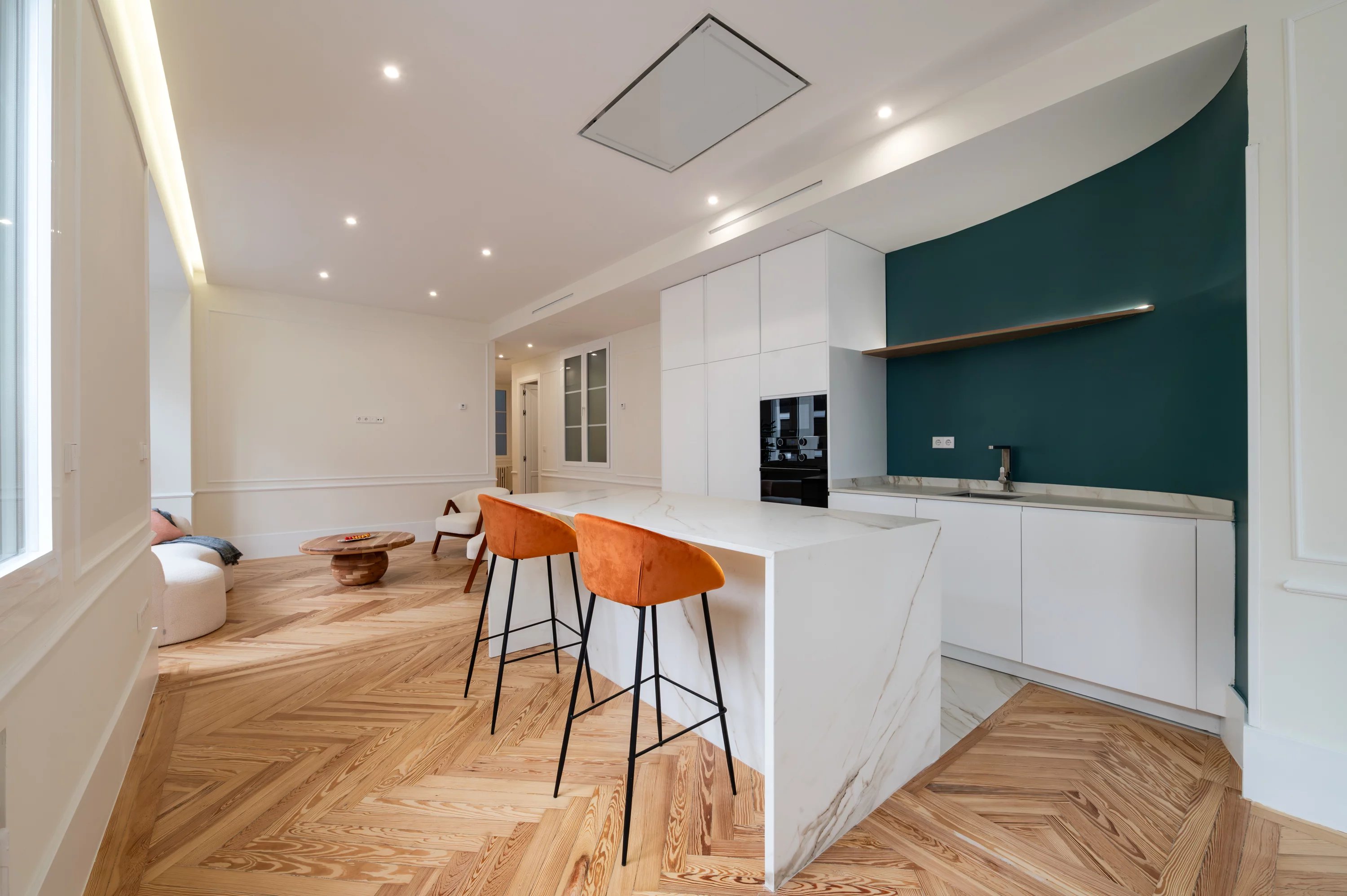 El salón principal, espacioso y luminoso, se convierte en el lugar ideal para disfrutar de las vistas urbanas y del dinamismo de Madrid, mientras que la cocina, completamente equipada, ofrece un espacio práctico y elegante para el día a día.