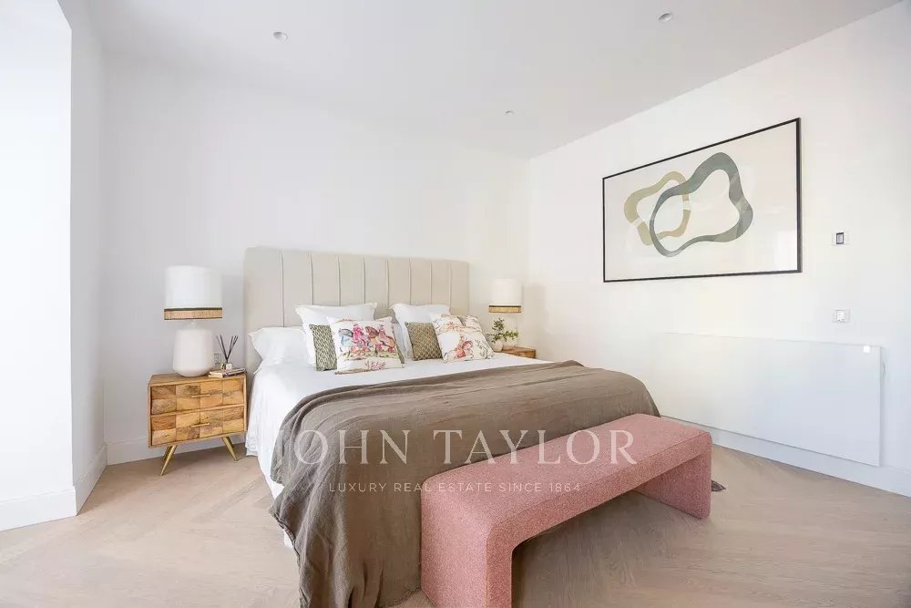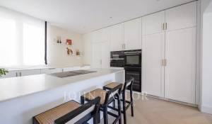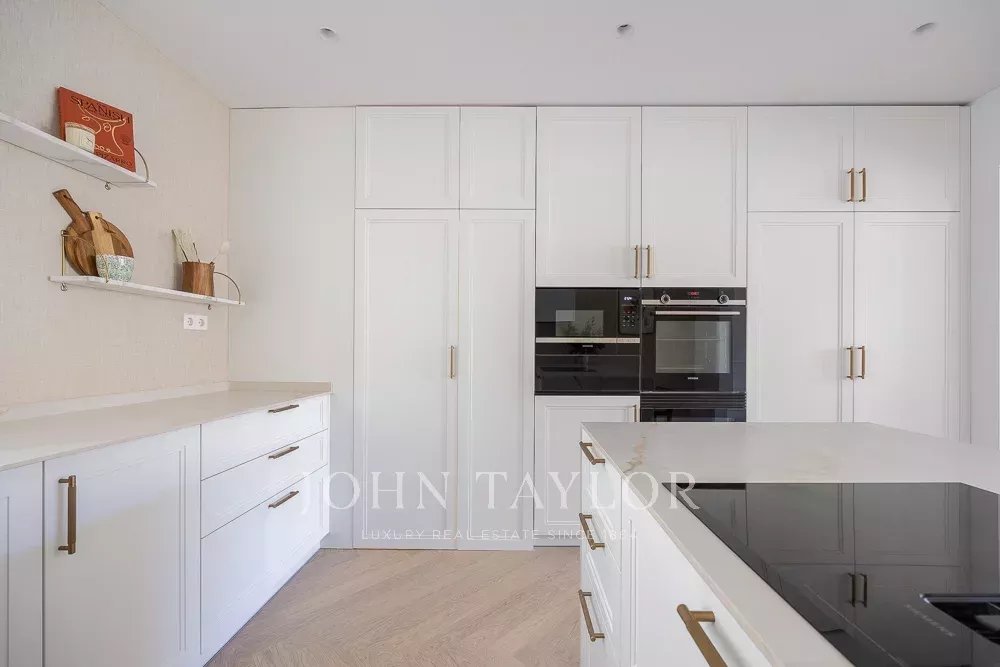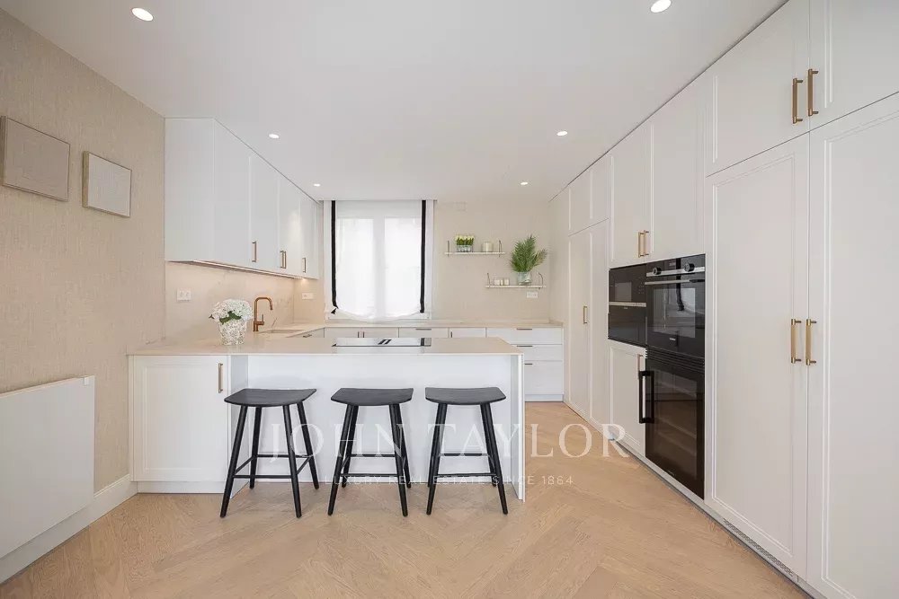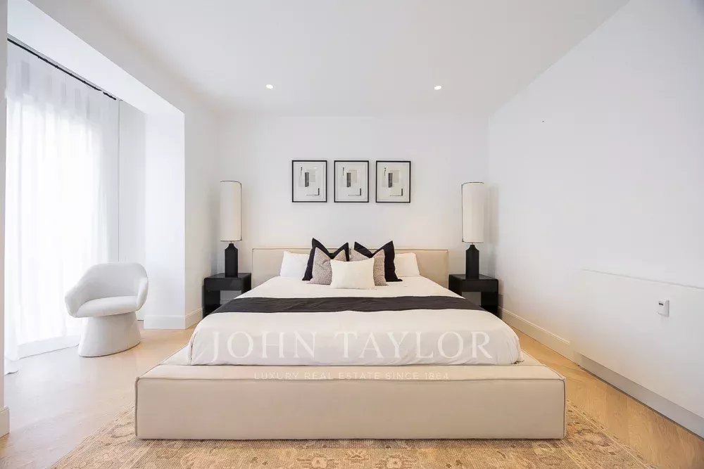 La zona privada incluye tres dormitorios, todos con cuarto de baño en suite, además de otro cuarto que se puede usar como despacho o dormitorio individual. La habitación principal ofrece gran amplitud de espacios y vestidor, y miran a un amplio patio de manzana, dotándola de excelente luz natural.