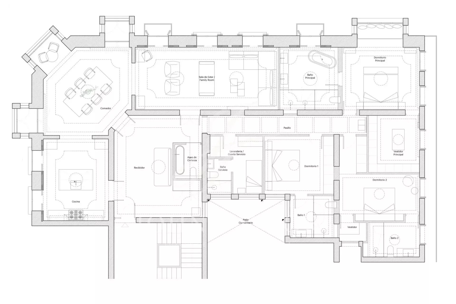 Una posible distribución sería hacer 3 dormitorios de gran tamaño con baños en suite y 1 dormitorio de servicio. En esta configuración quedaría un gran comedor en el chaflán, cocina exterior de 20 m2 y un amplio salón también exterior.