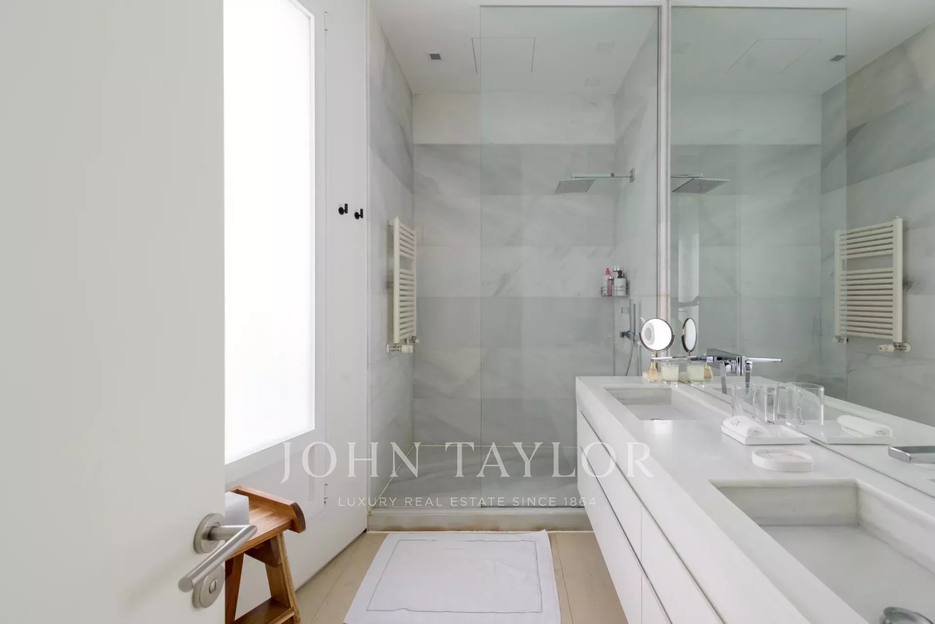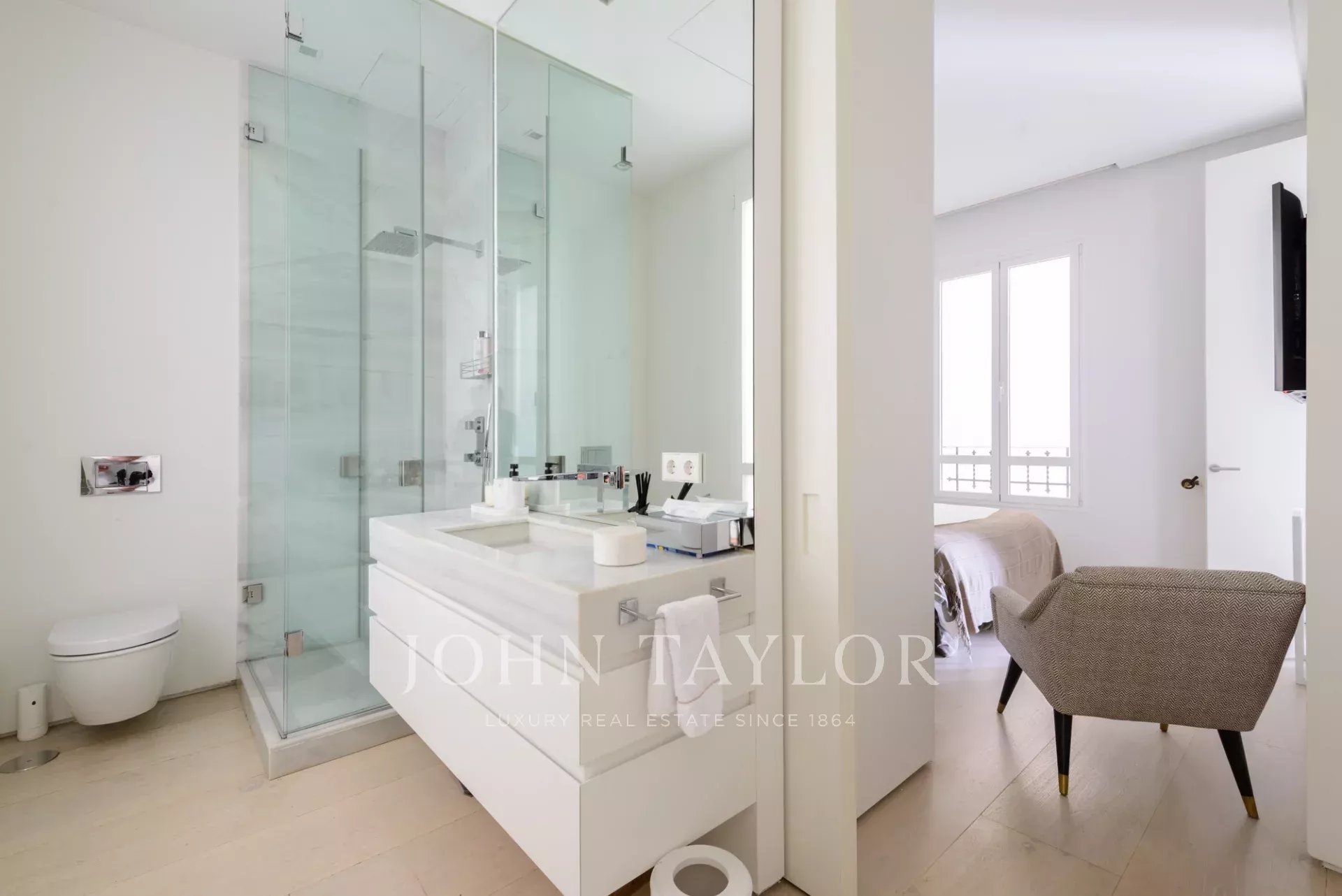La habitación principal es una suite completa, con un amplio vestidor y grandes ventanales. El baño en suite es un espacio con personalidad, con doble lavabo de mármol y una enorme ducha de alta potencia.