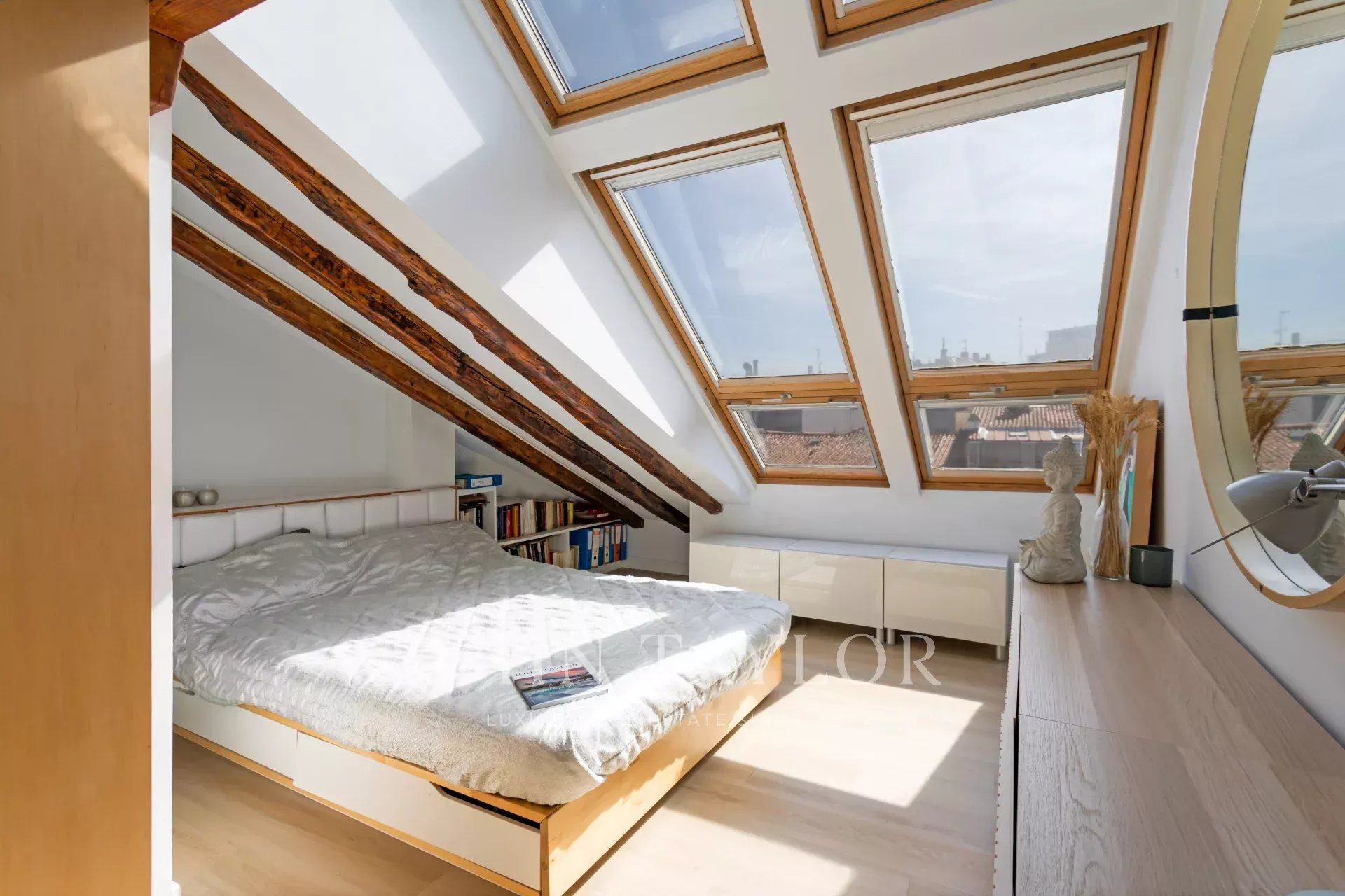 El salón y el dormitorio cuentan con ventanas en el techo que dan a la calle Alcalá, desde donde se pueden admirar preciosos edificios clásicos y parte del Parque del Retiro. Este es un ático para los amantes del sol y la luz natural.