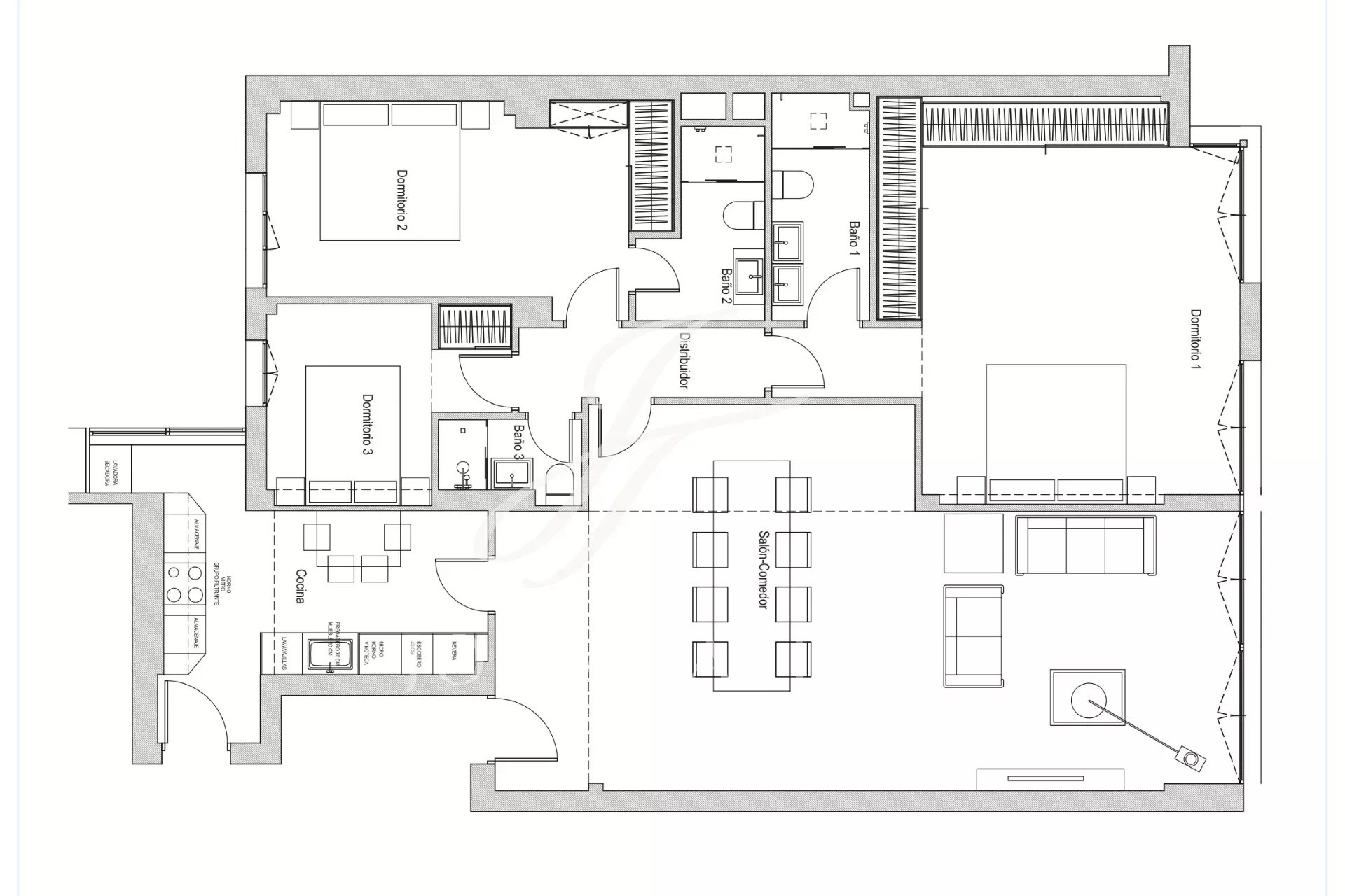 La vivienda consta de un gran área social de más de 50m², con luminosas y amplias zonas de estar y comedor. Junto al mismo y a través de puertas correderas accedemos a la cocina, completamente equipada y con isla, además de zona separada para la lavadora y secadora.