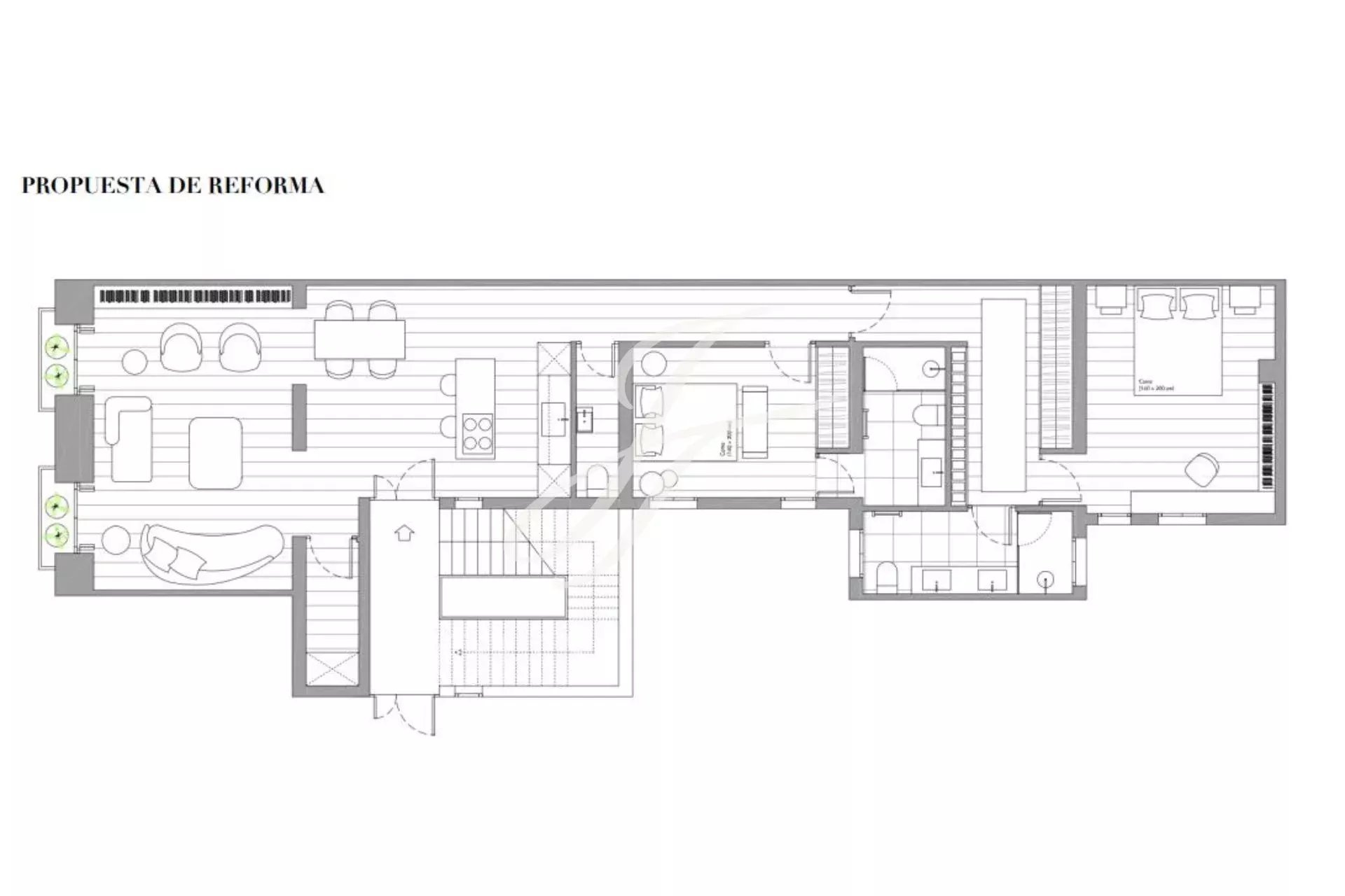 Se trata de 154m² construidos. El salón es luminoso con sus dos balcones a la calle. Junto encontramos la zona de comedor con la cocina abierta recién reformada y integralmente equipada. En la zona de descanso, encontramos un primero dormitorio con cama individual, con un baño completo separado, el dormitorio principal con su baño completo en suite y por fin un tercero dormitorio con otro baño en suite.