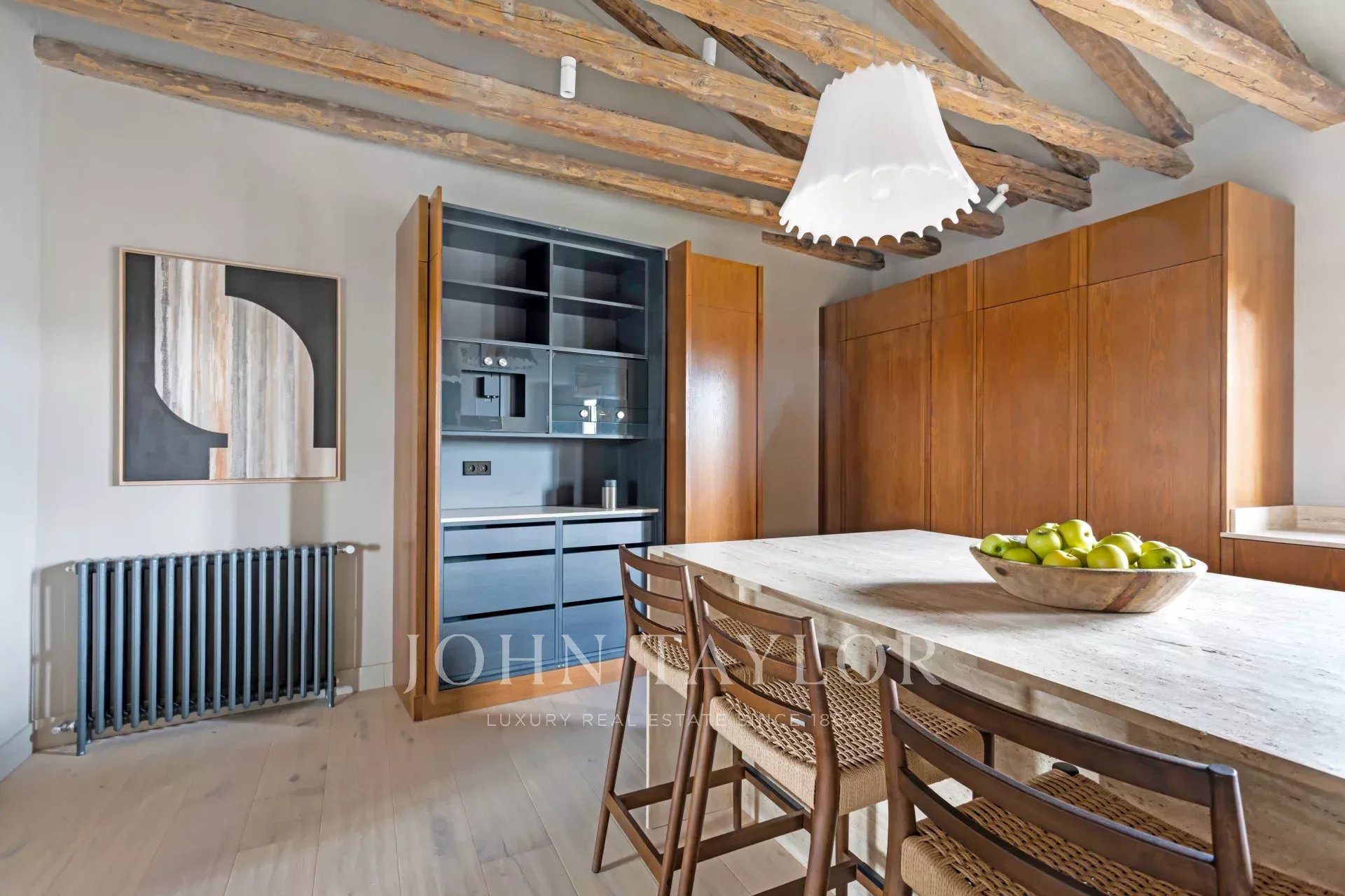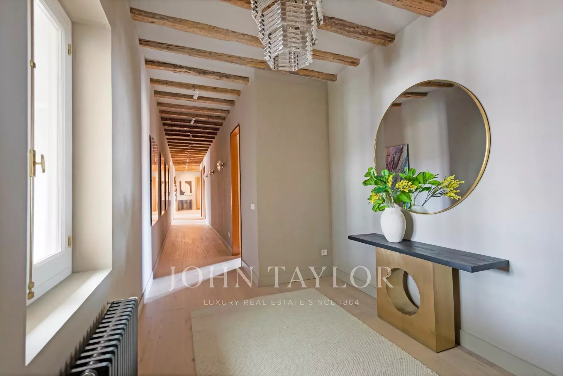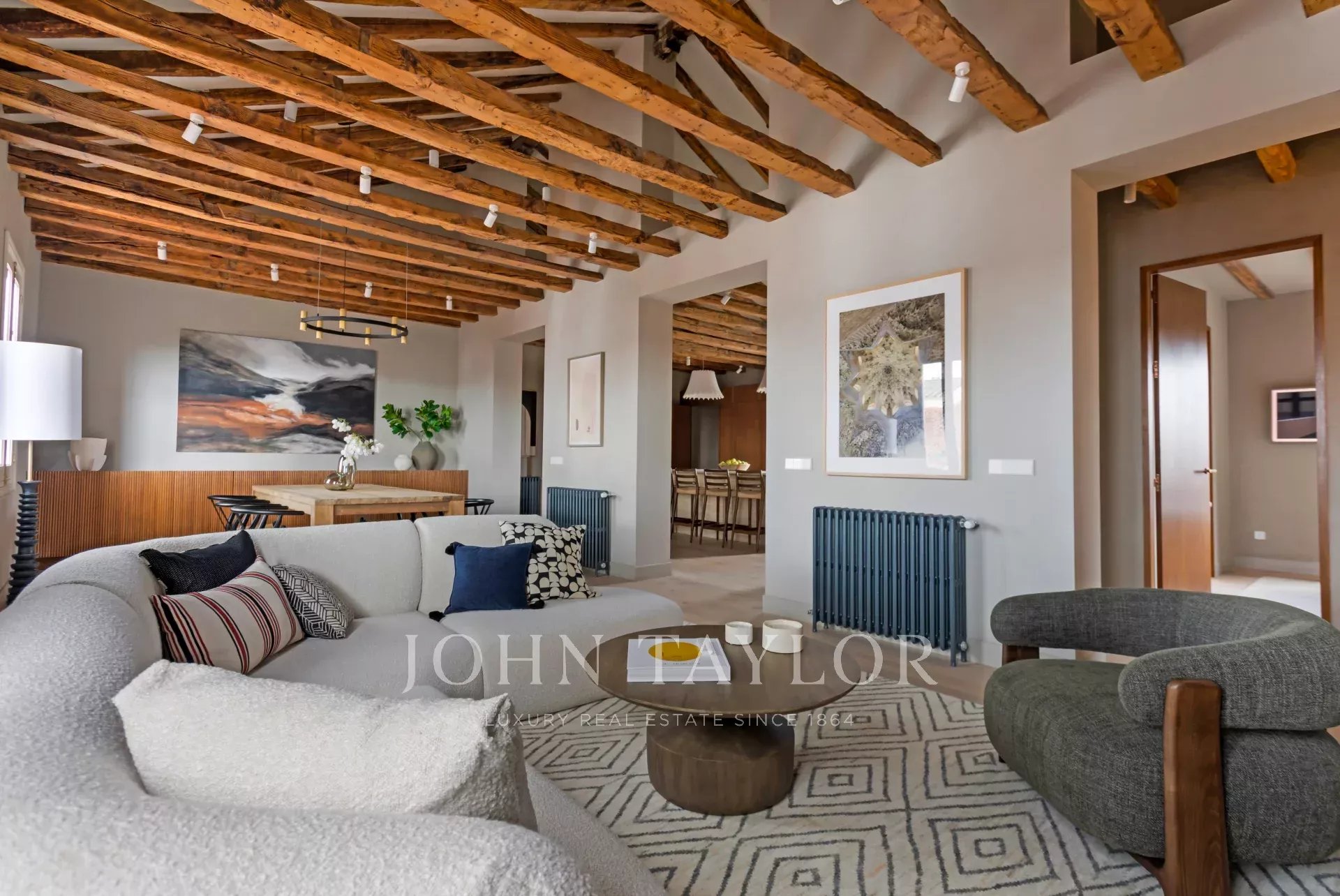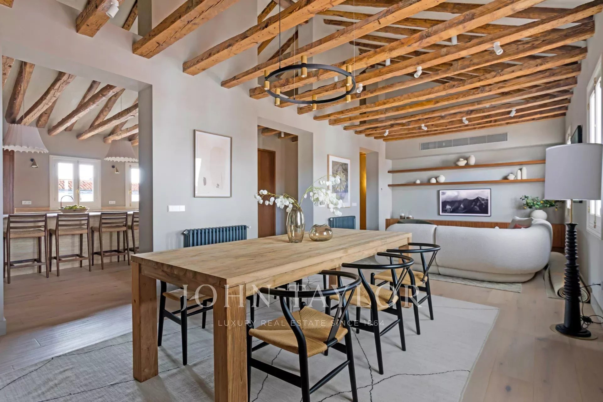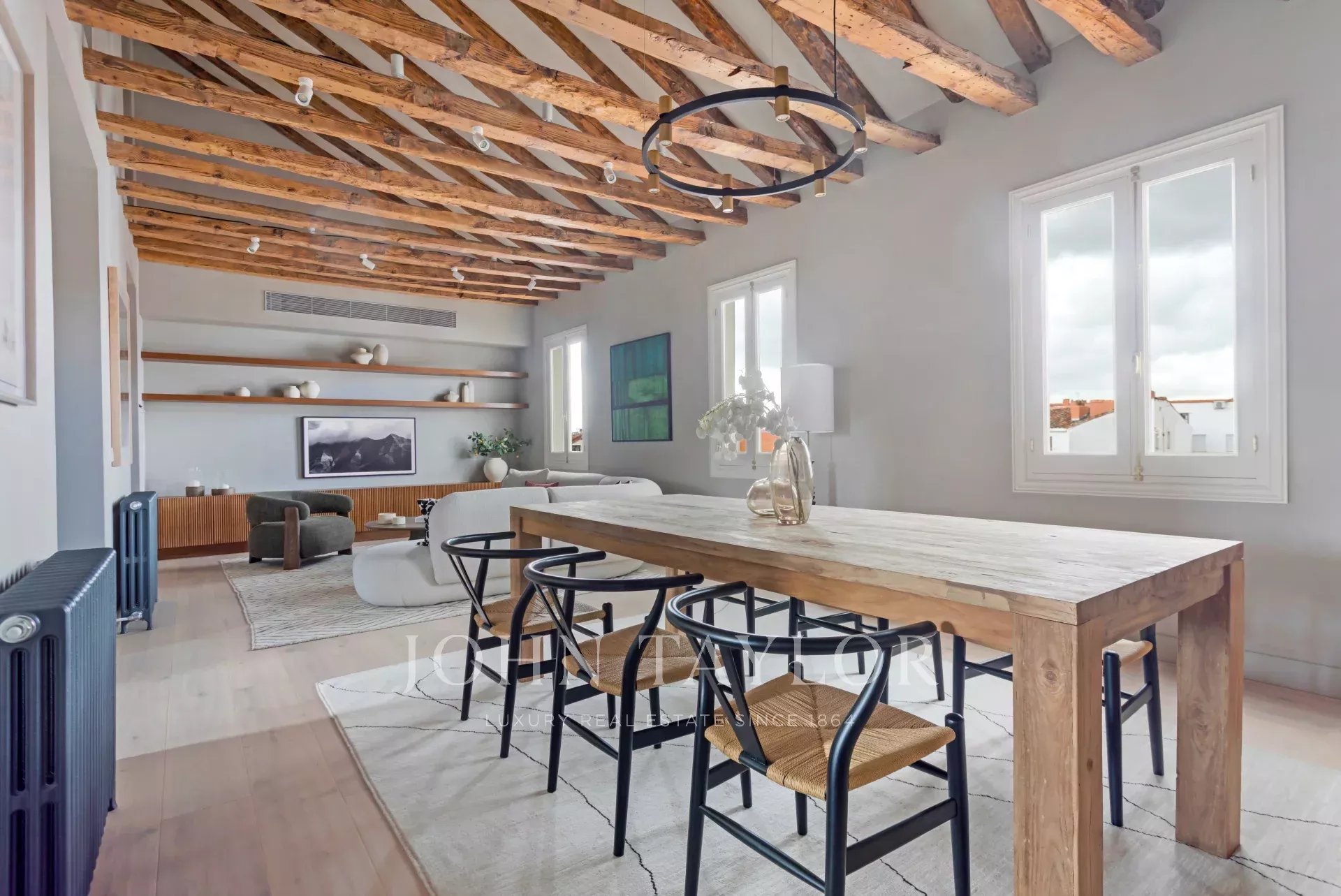 Consta de tres dormitorios con vestidores y baños completos en suite, además de una lavandería y un aseo de cortesía. Esta exclusiva propiedad esta totalmente reformada y amueblada con un exquisito diseño interior que combina armoniosamente la elegancia contemporánea de estilo loft con la sofisticación atemporal : paredes texturizadas, vigas originales, suelo de roble lavado y ventanas clásicas de madera en toda la vivienda.
