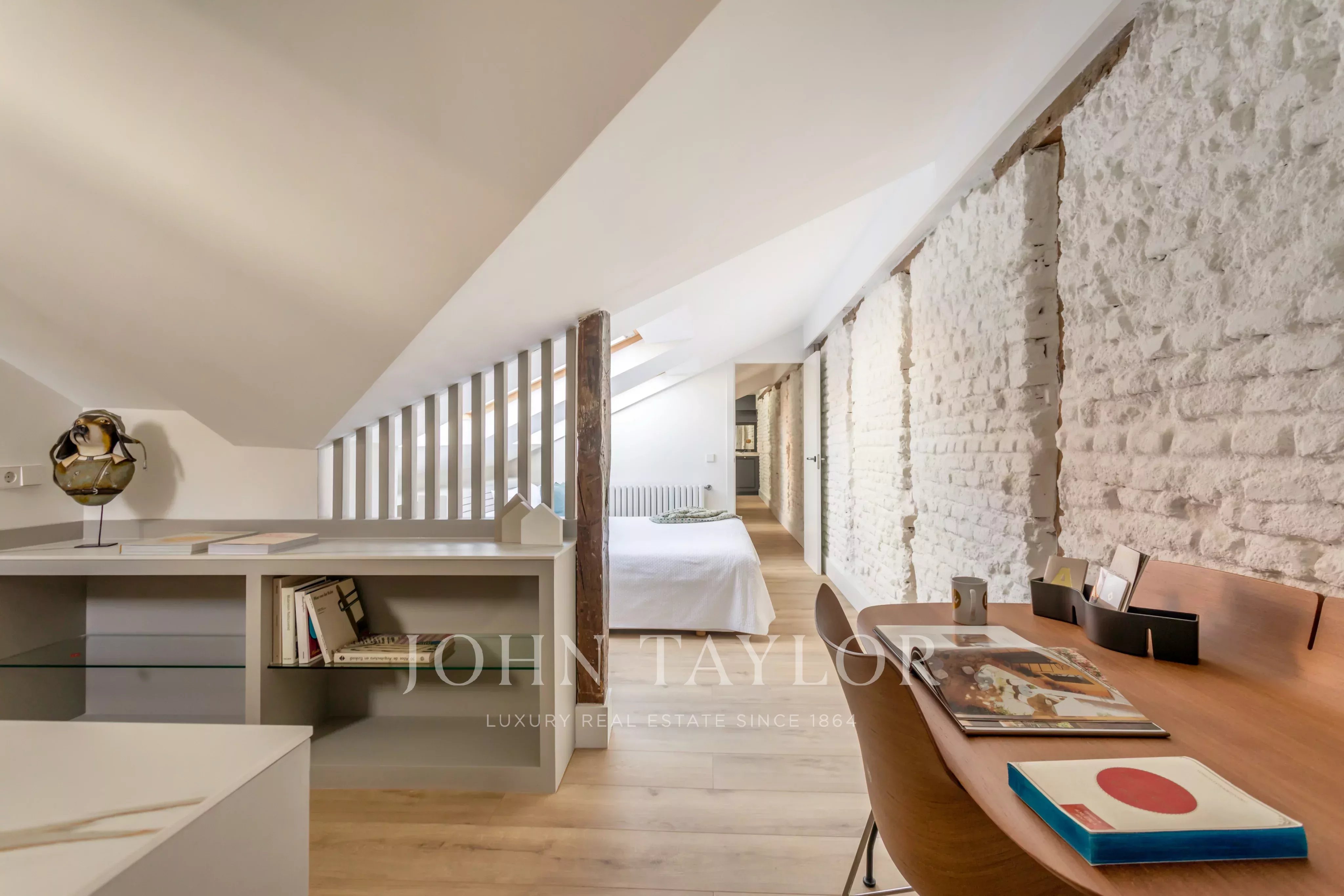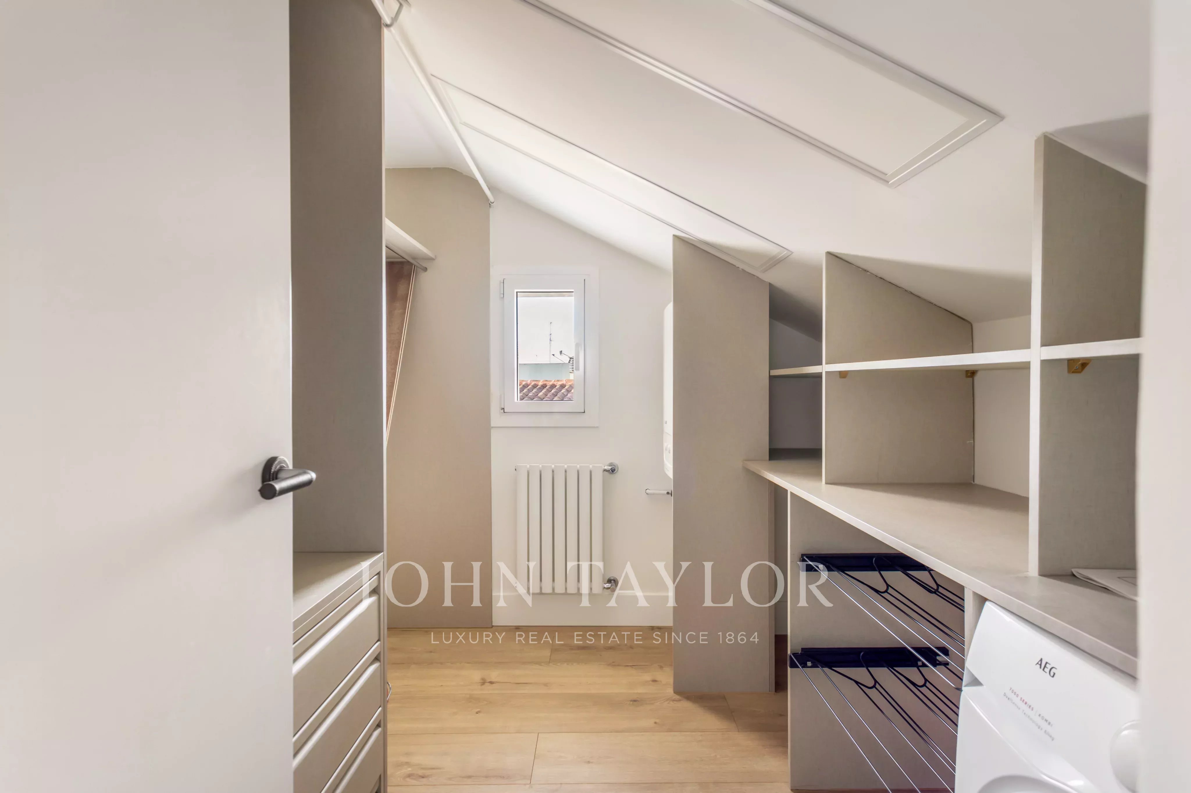 Ubicada en una quinta planta exterior, la propiedad ofrece 143 m² cuidadosamente diseñados, donde destacan sus techos abuhardillados, que aportan carácter, amplitud y una personalidad única. El edificio, de principios del siglo XX, conserva su esencia señorial y cuenta con ascensor, un valor añadido en este tipo de fincas históricas.