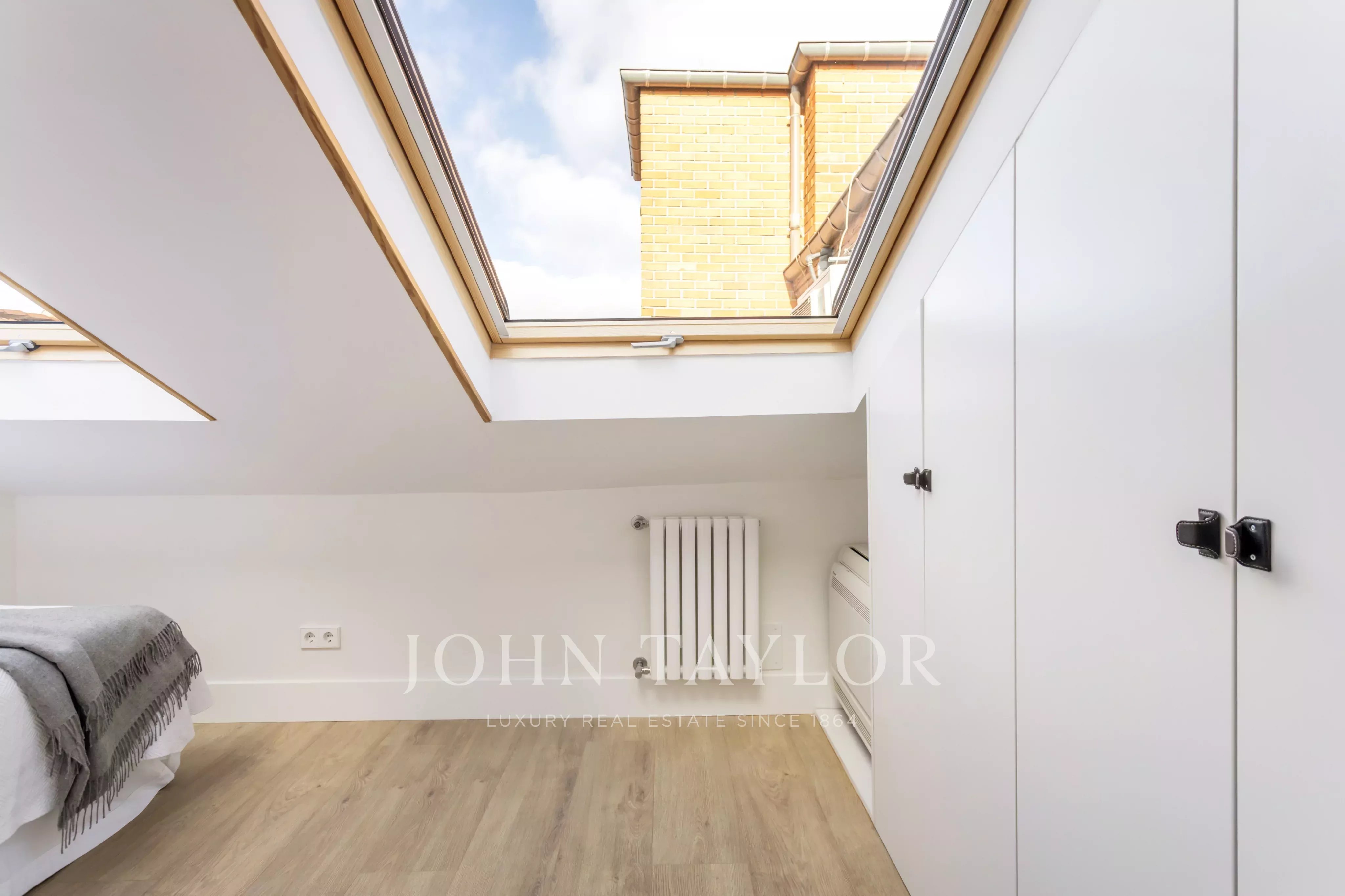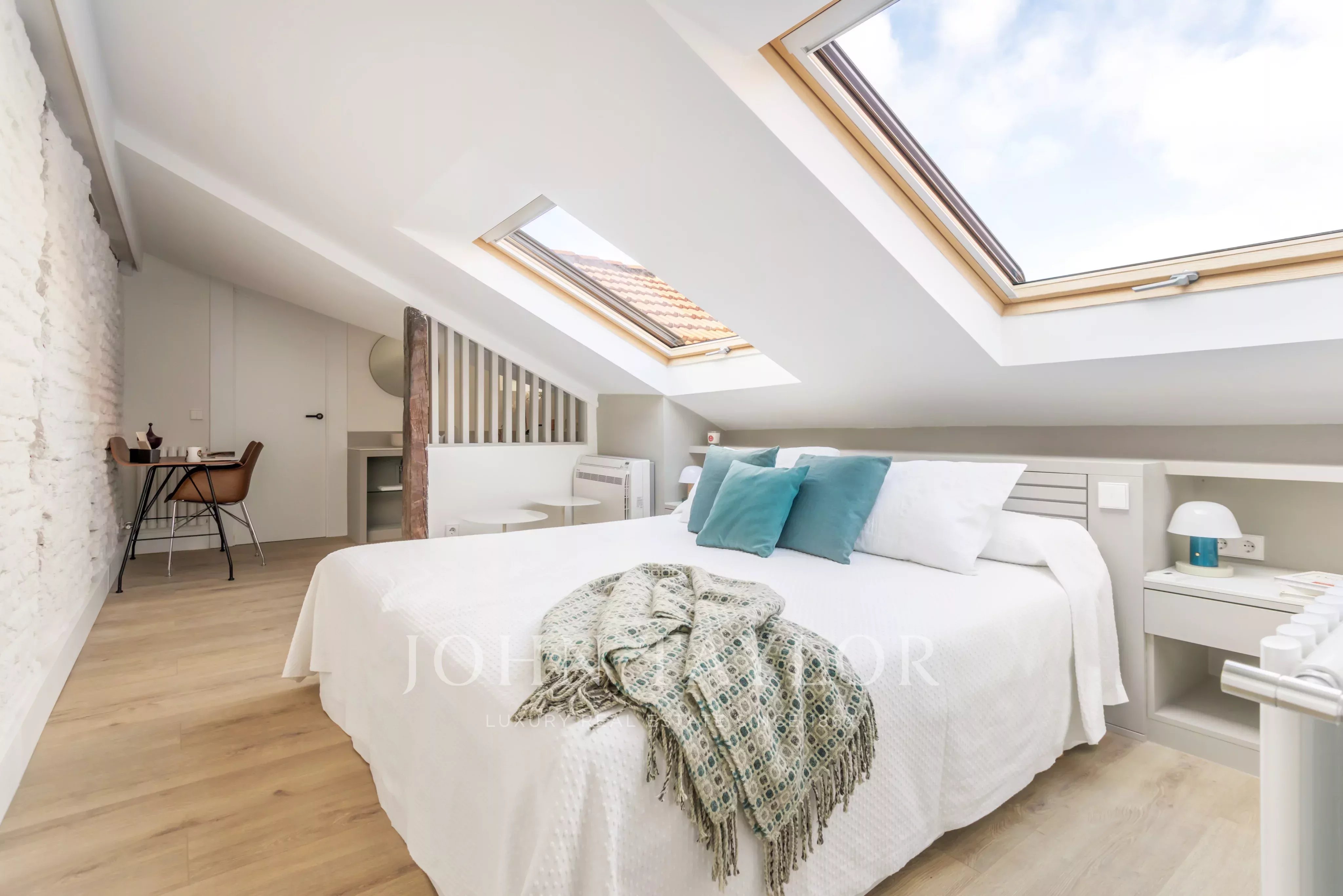 La vivienda dispone de dos dormitorios y dos baños, con una distribución equilibrada y funcional. La reciente reforma incorpora persianas automáticas y sistemas de apertura motorizada en todas las ventanas tipo Velux, garantizando confort, eficiencia y un manejo intuitivo de la luz natural en todos los espacios.