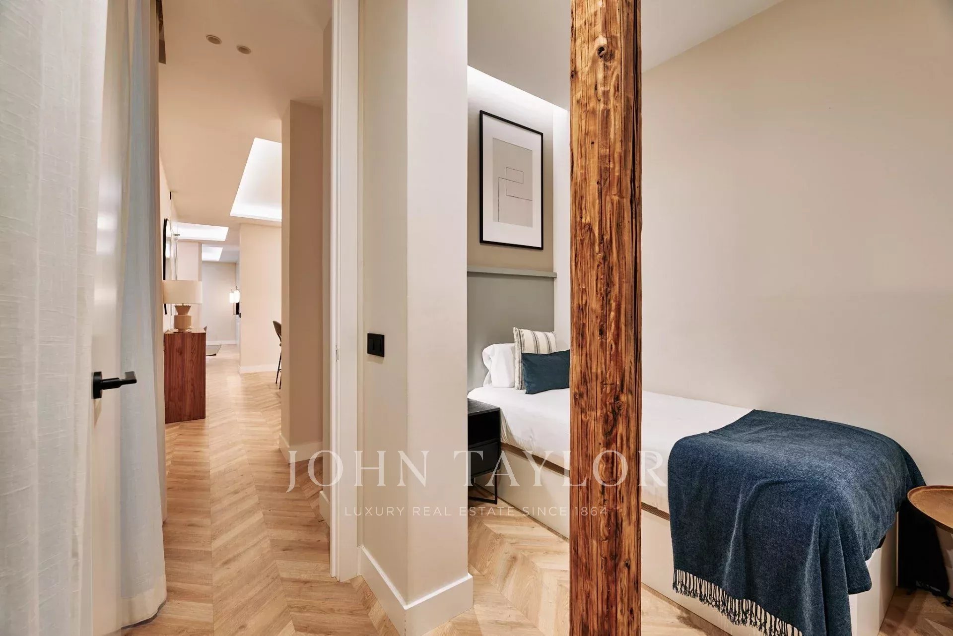 La vivienda dispone de tres espaciosas habitaciones y tres baños completos, dos de ellos en suite, proporcionando privacidad y comodidad en cada estancia. La distribución ha sido concebida para optimizar la entrada de luz natural, complementada por una cuidada iluminación LED que realza los acabados en madera y el mobiliario de diseño hecho a medida.