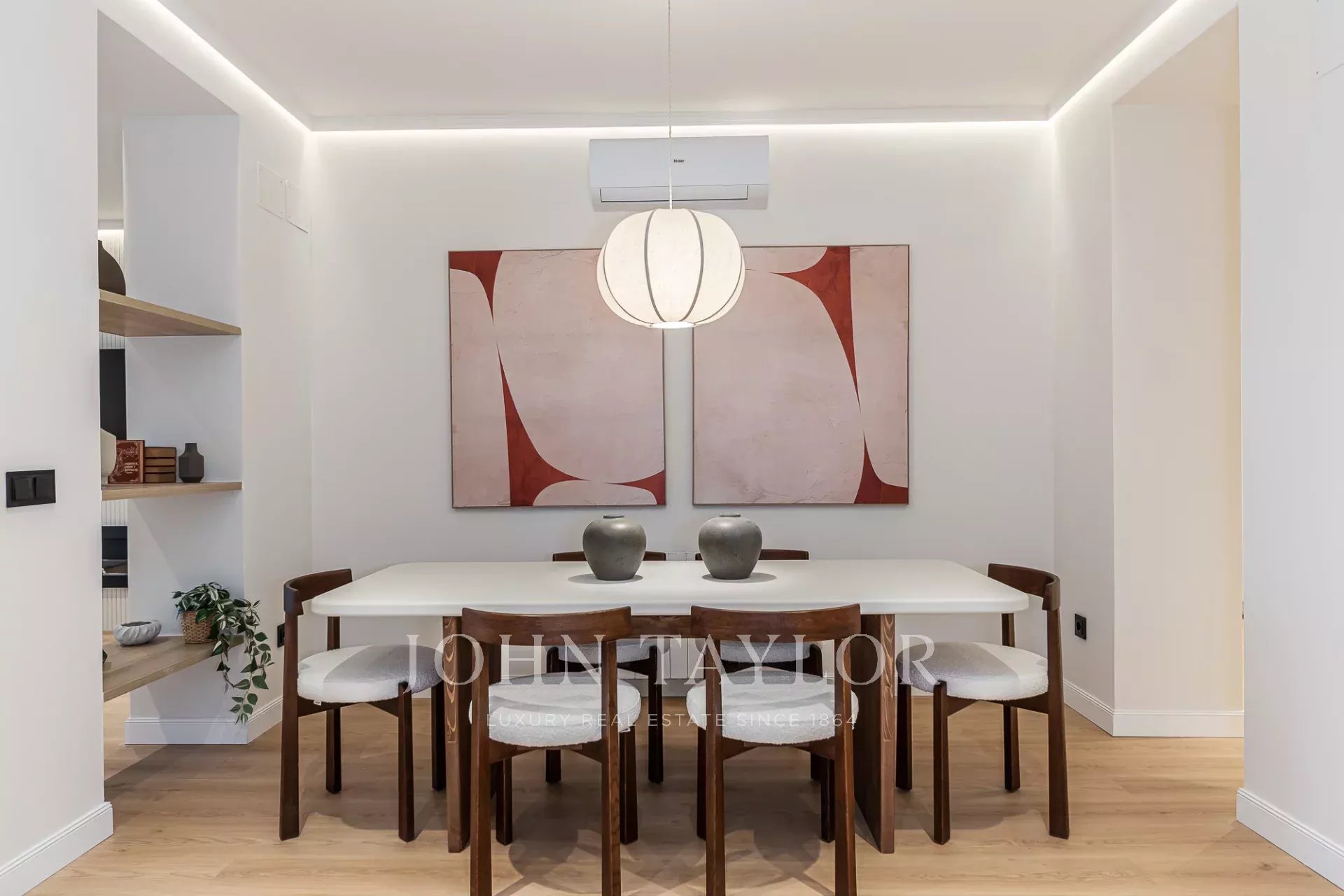 Anexo al salón, un comedor de generosas proporciones ofrece el marco perfecto para celebraciones íntimas o largas sobremesas en un entorno acogedor y elegante.