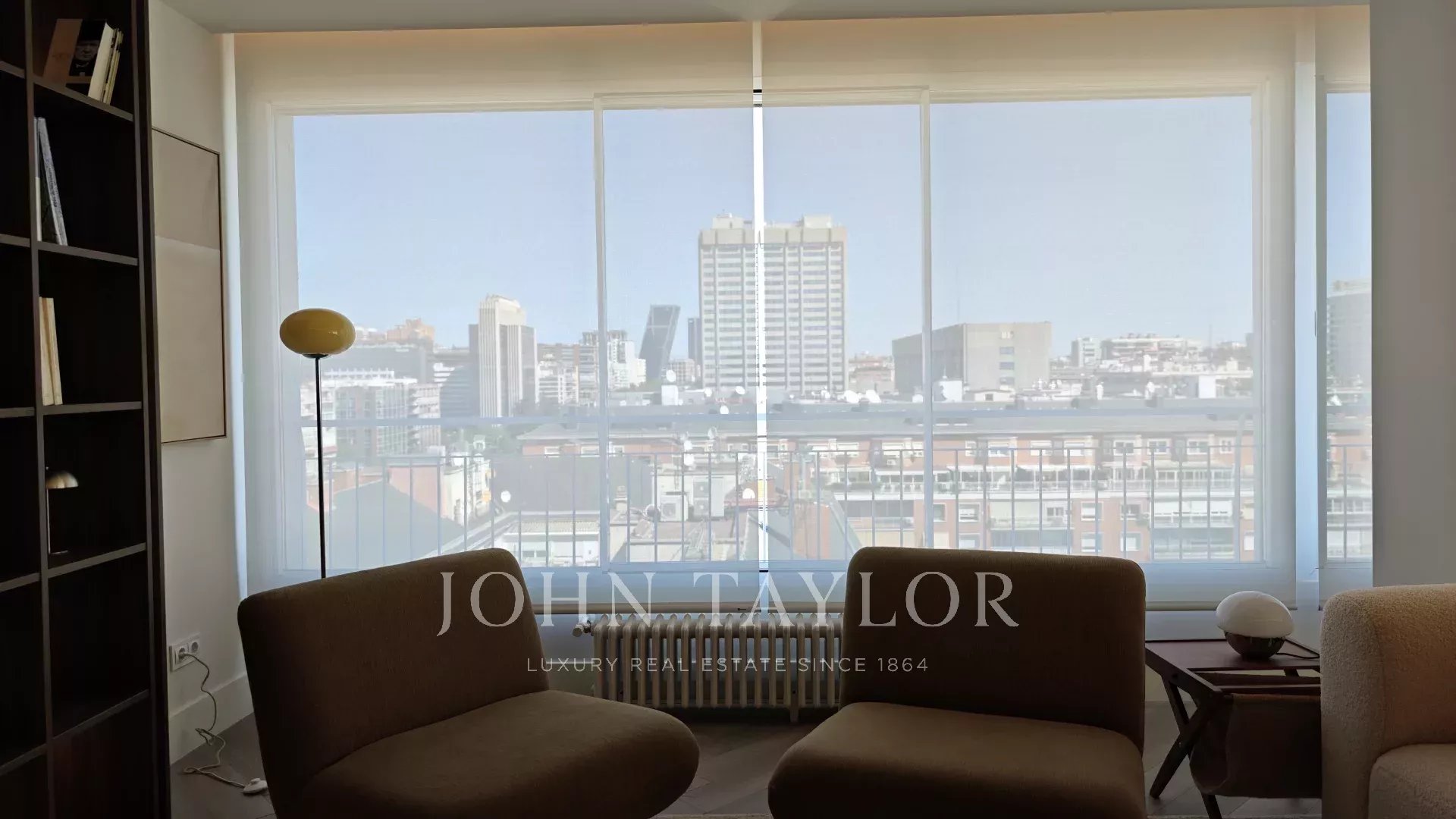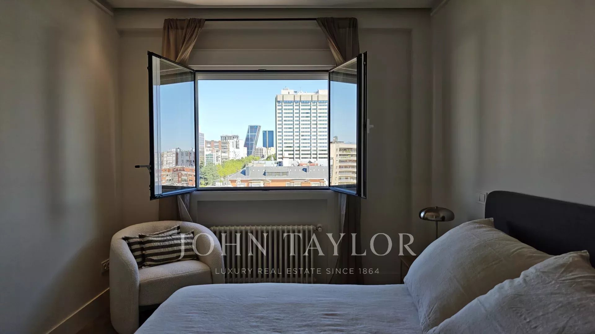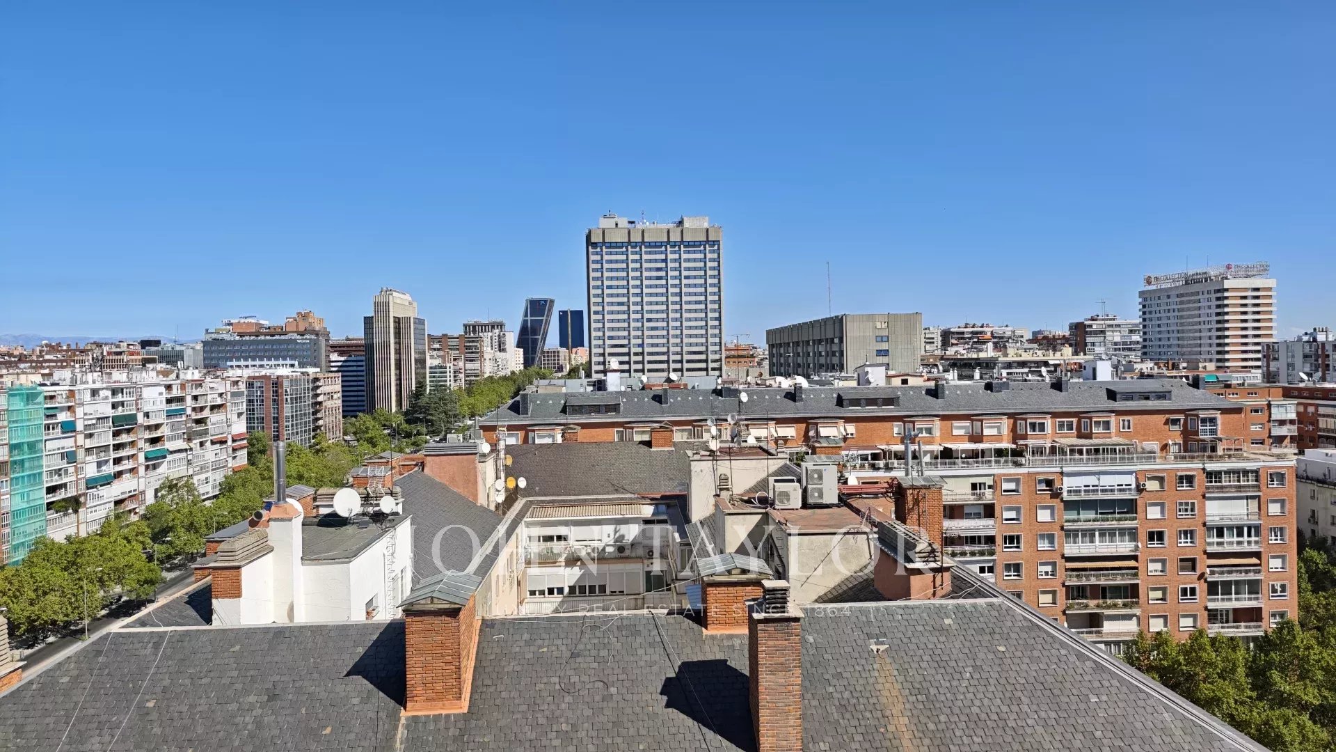 Las vistas son protagonistas: desde sus ventanales se contempla la Sierra de Madrid y la Plaza de Castilla, bañadas por la luz que entra durante todo el día gracias a su orientación norte y al ángulo este del comedor en esquina.
