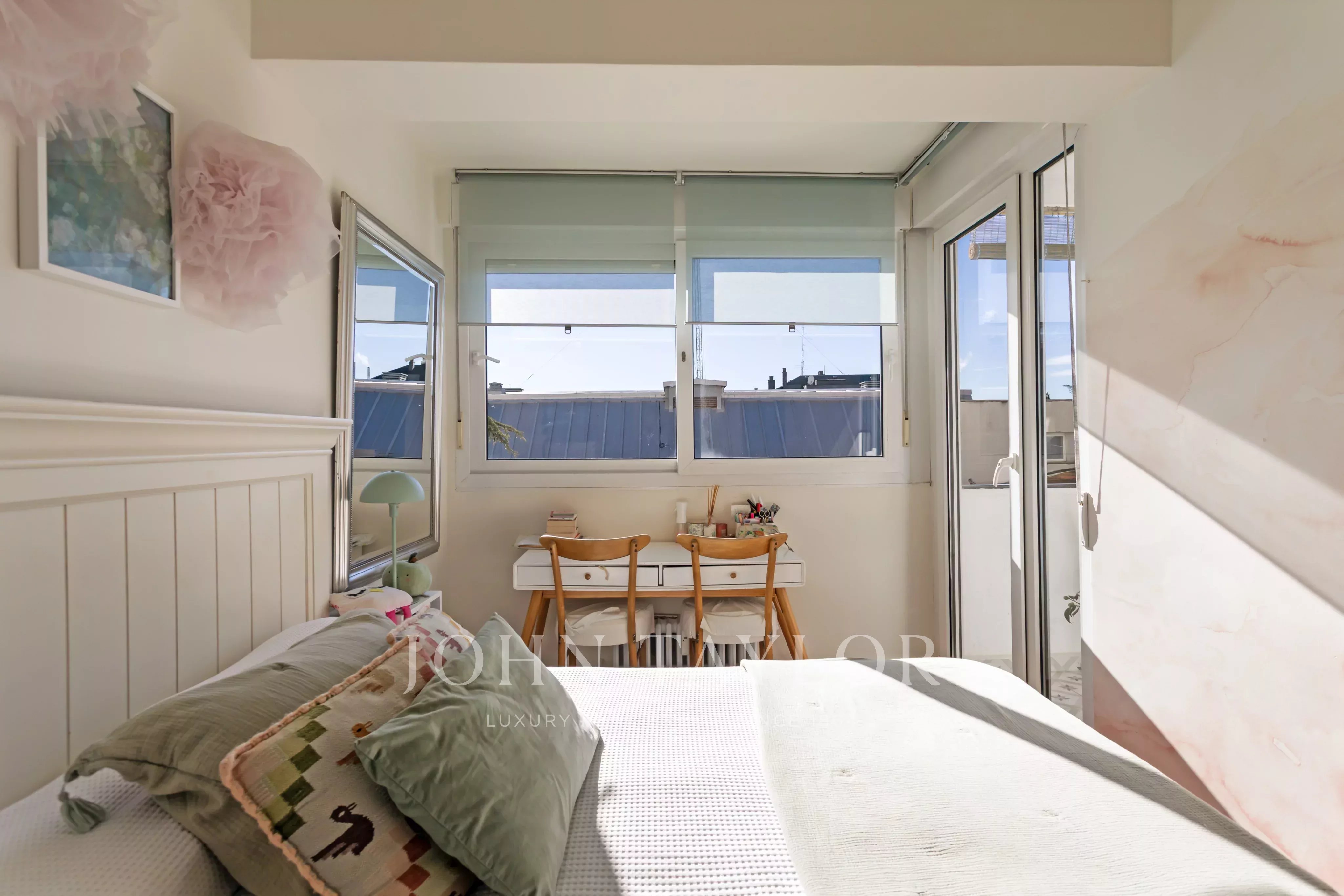 La zona de descanso se compone de dos alegres y luminosos dormitorios, uno de ellos con terraza orientada al sur, un baño con plato de ducha y el dormitorio principal, amplio y elegante, destaca por su privacidad y funcionalidad con baño incorporado de elegante diseño.