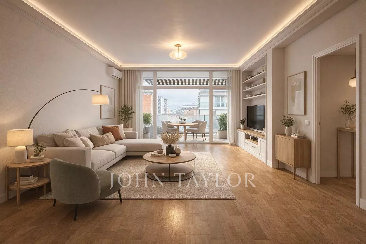 El salón, independiente y de generosas dimensiones, se separa del recibidor mediante una puerta acristalada, permitiendo el paso de la luz natural hasta la entrada de la vivienda. Su distribución rectangular maximiza el aprovechamiento del espacio e incorpora chimenea y aire acondicionado. Desde el salón se accede a una terraza exterior con espectaculares vistas abiertas al Bernabéu.
