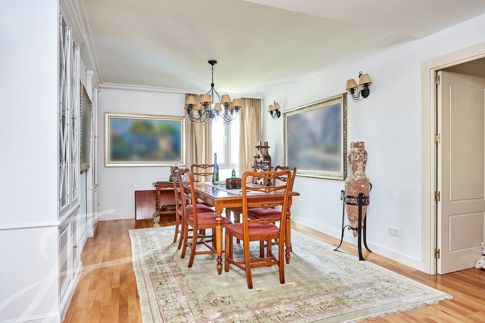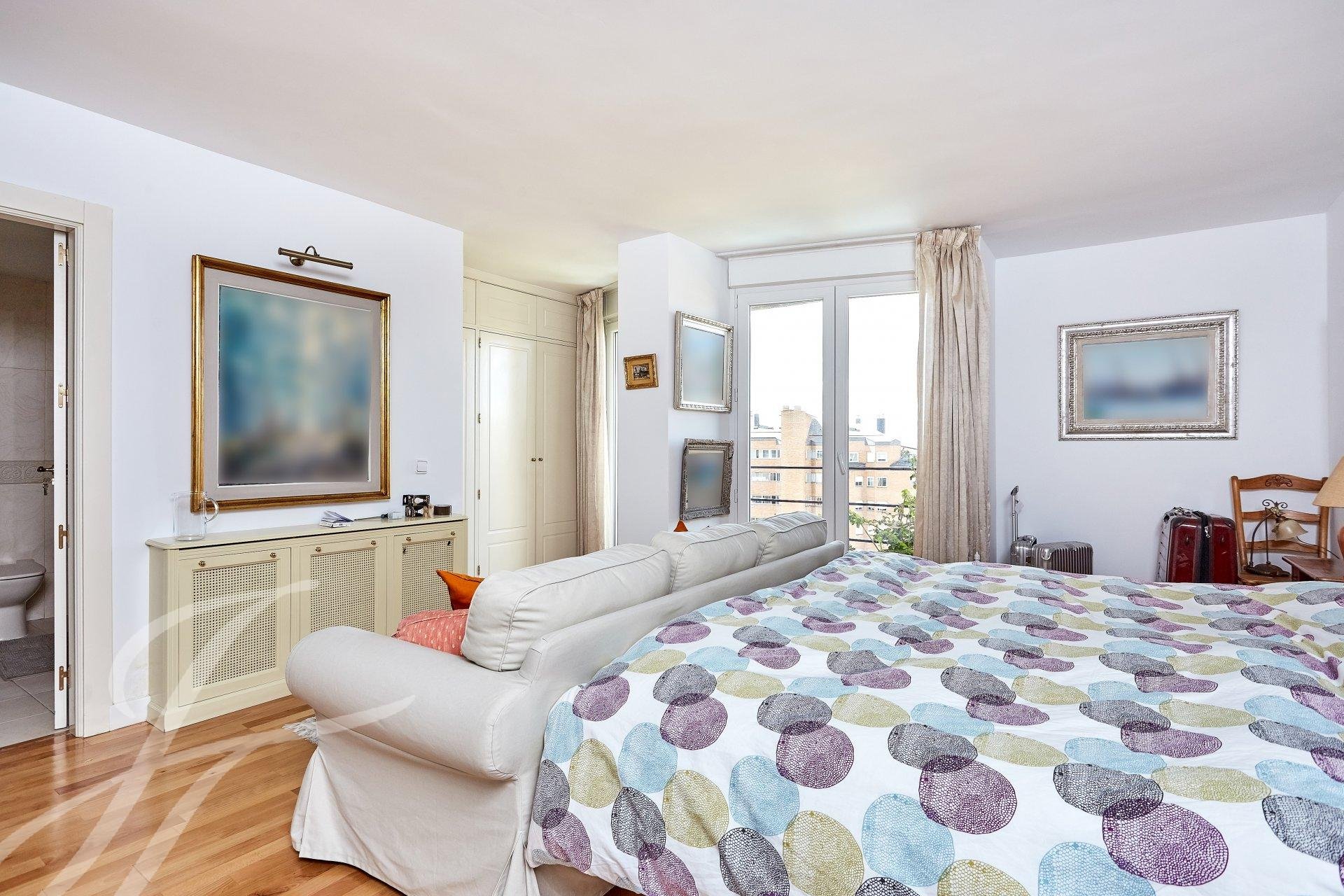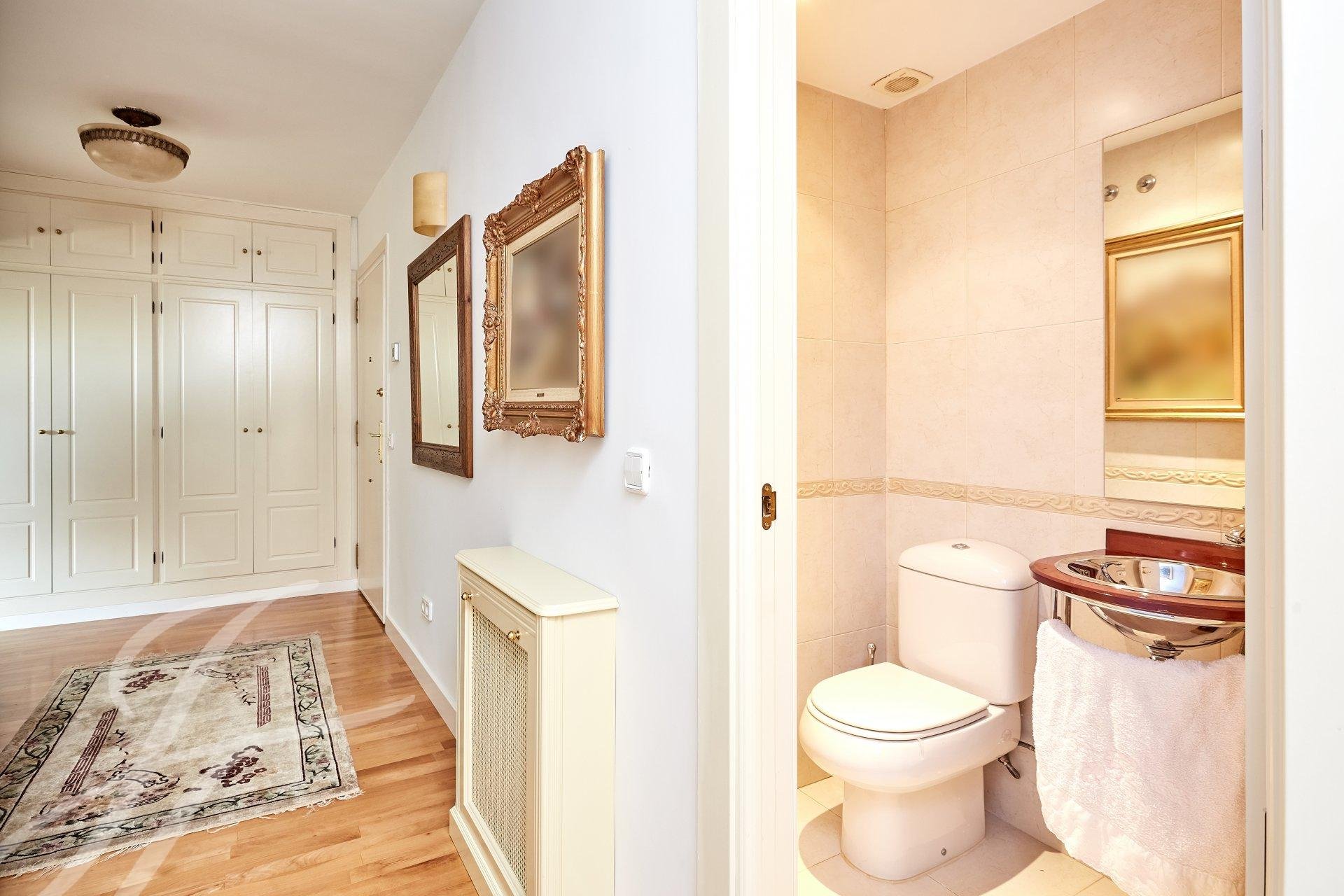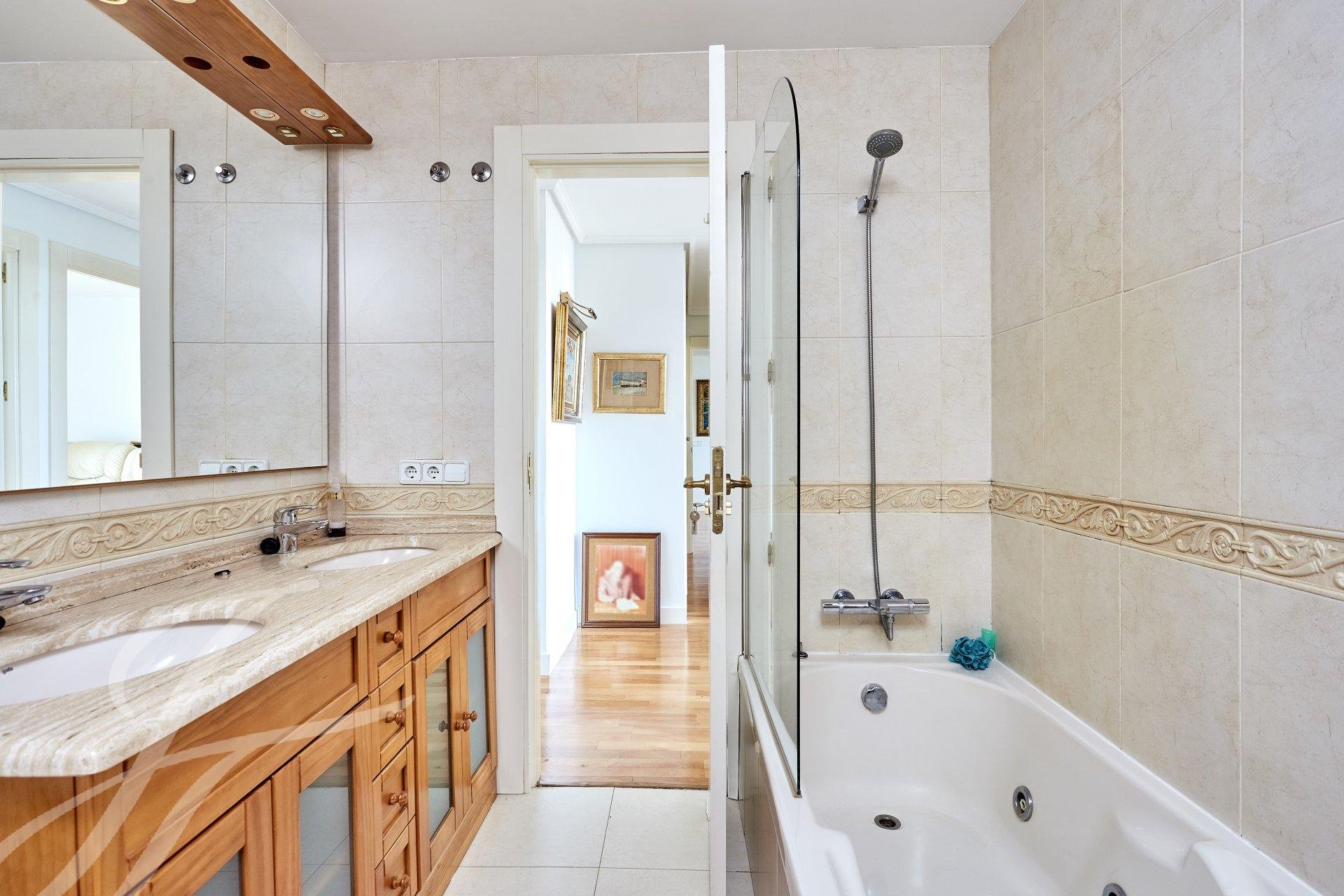 Accedemos a la propiedad mediante un luminoso hall con aseo de cortesía, que da acceso a una habitación que en la actualidad se usa como despacho personal. Nos adentramos en un amplio salón con tres ambientes dotado de amplios ventanales, uno de ellos con chimenea. A destacar excelentes vistas y luminosidad en estas estancias, debido a su orientación Sur. Avanzamos hacia el área de descanso, donde encontramos el dormitorio principal (originalmente dos) con vestidor, cuarto de baño de mármol en suite y una pequeña terraza además de dos dormitorios con salida a otra terraza a los que da servicio un cuarto de baño.