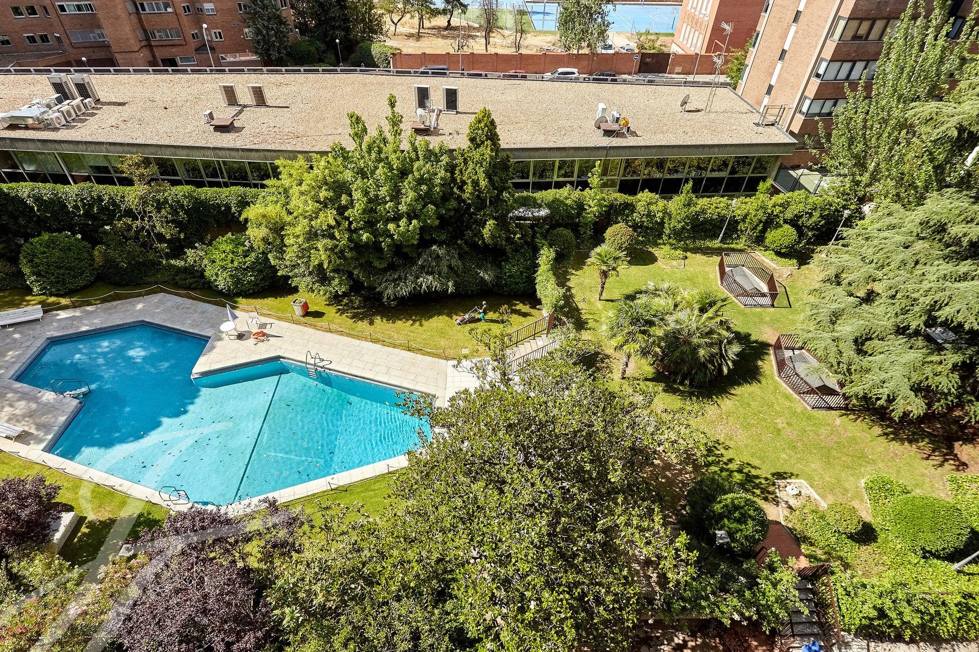 La vivienda esta situada en la sexta planta de una estupenda finca con amplias zonas comunitarias compuestas por dos piscinas, gimnasio con sauna y vestuarios, peluquería, sala de reuniones, parque infantil y amplias zonas ajardinadas, además cuenta con seguridad 24h los siete días de la semana. La propiedad tiene una superficie de 394 m² construidos con zonas comunes de los que 266 m² corresponden a vivienda.