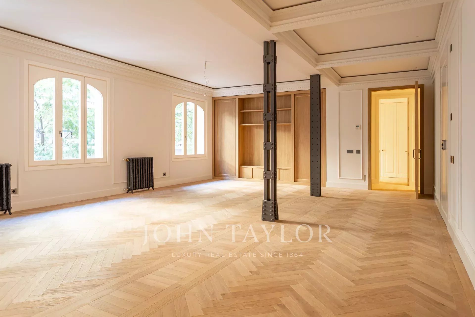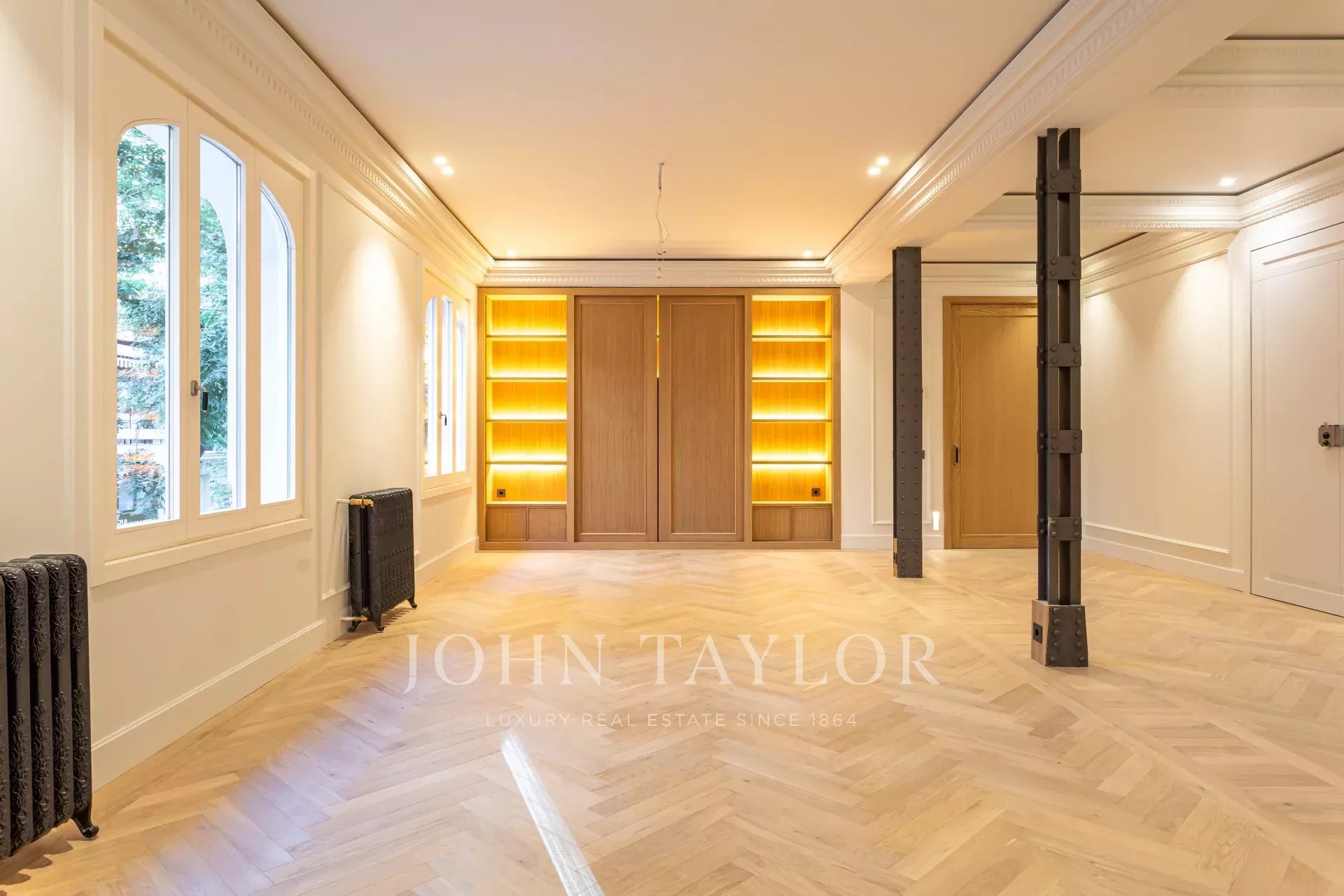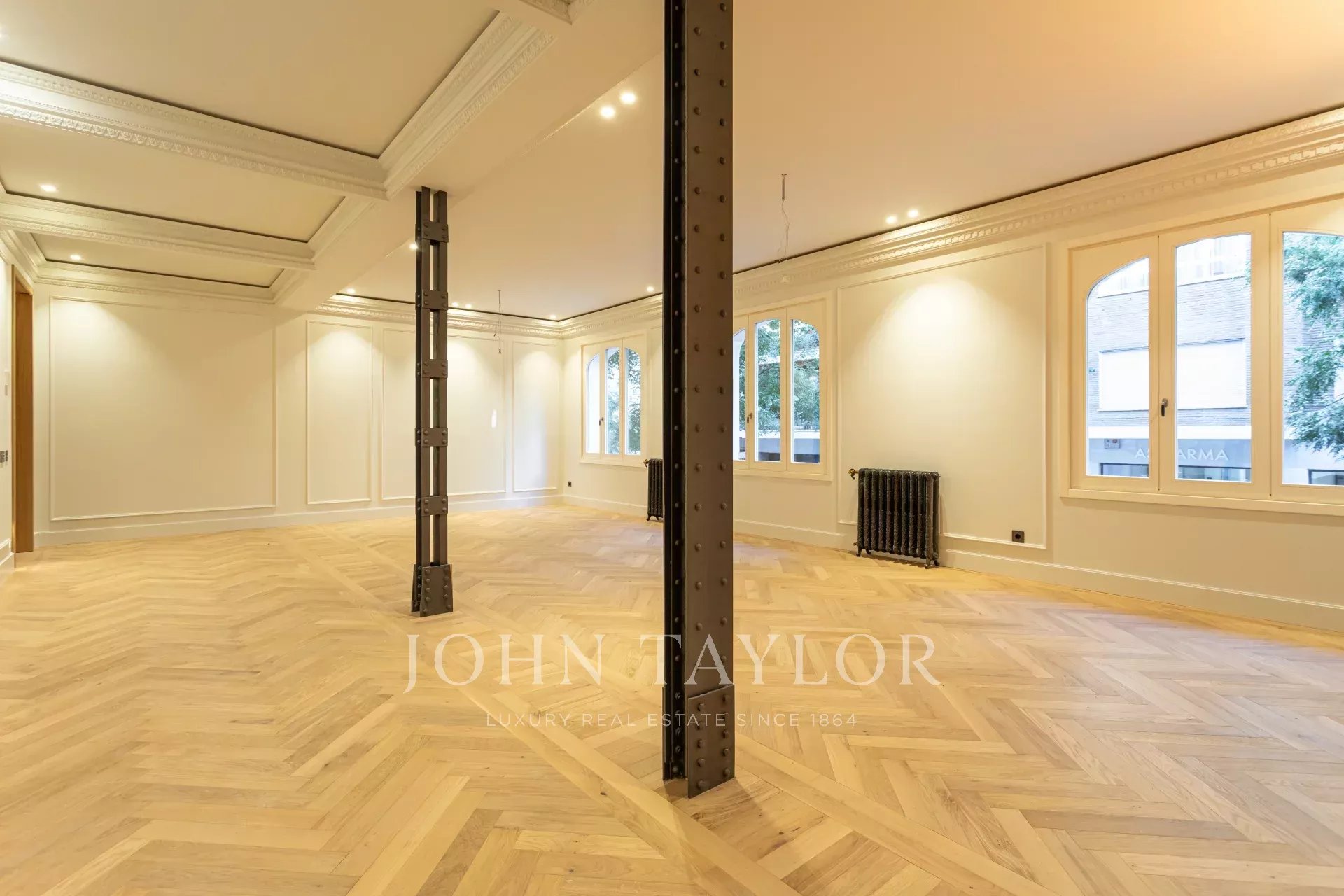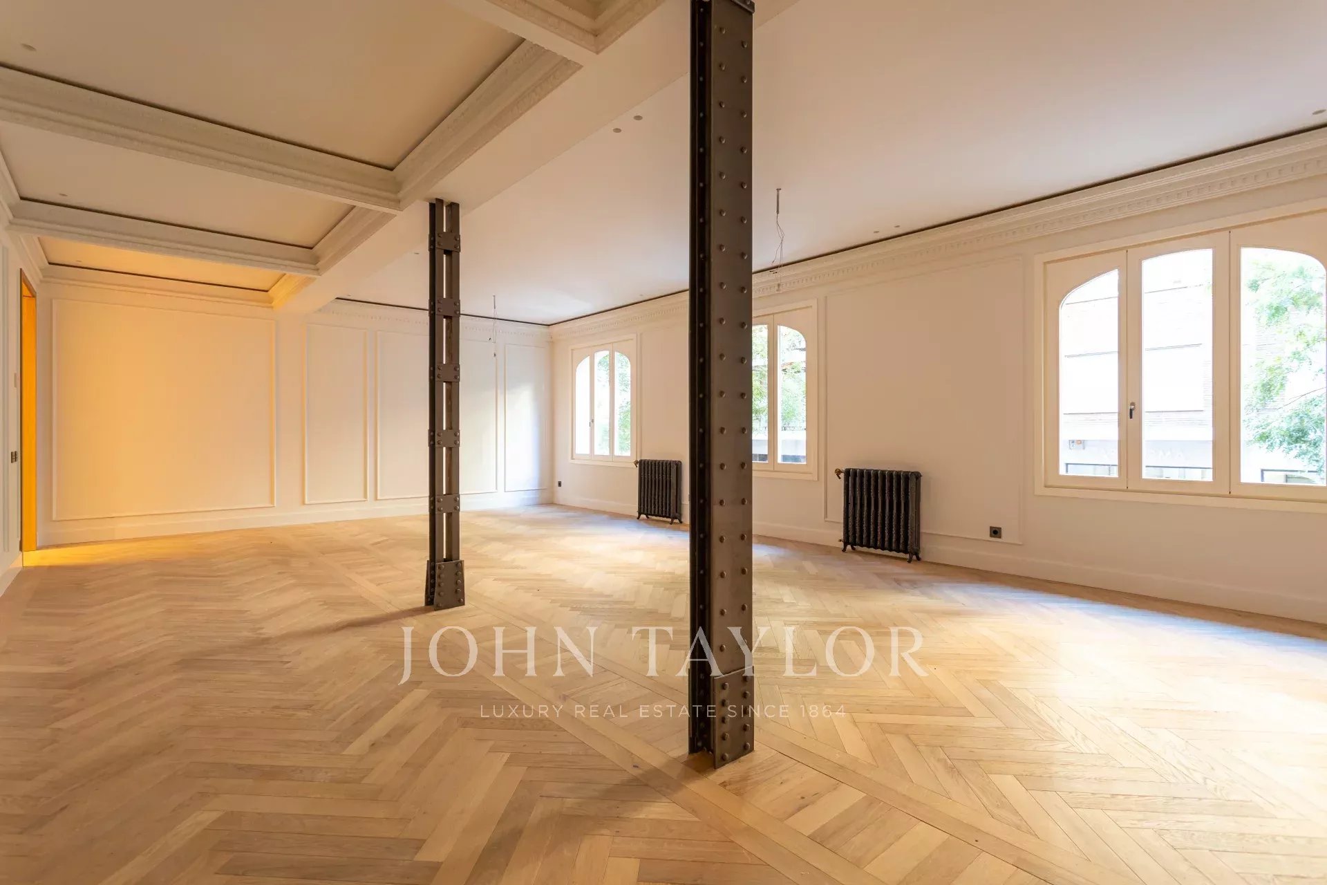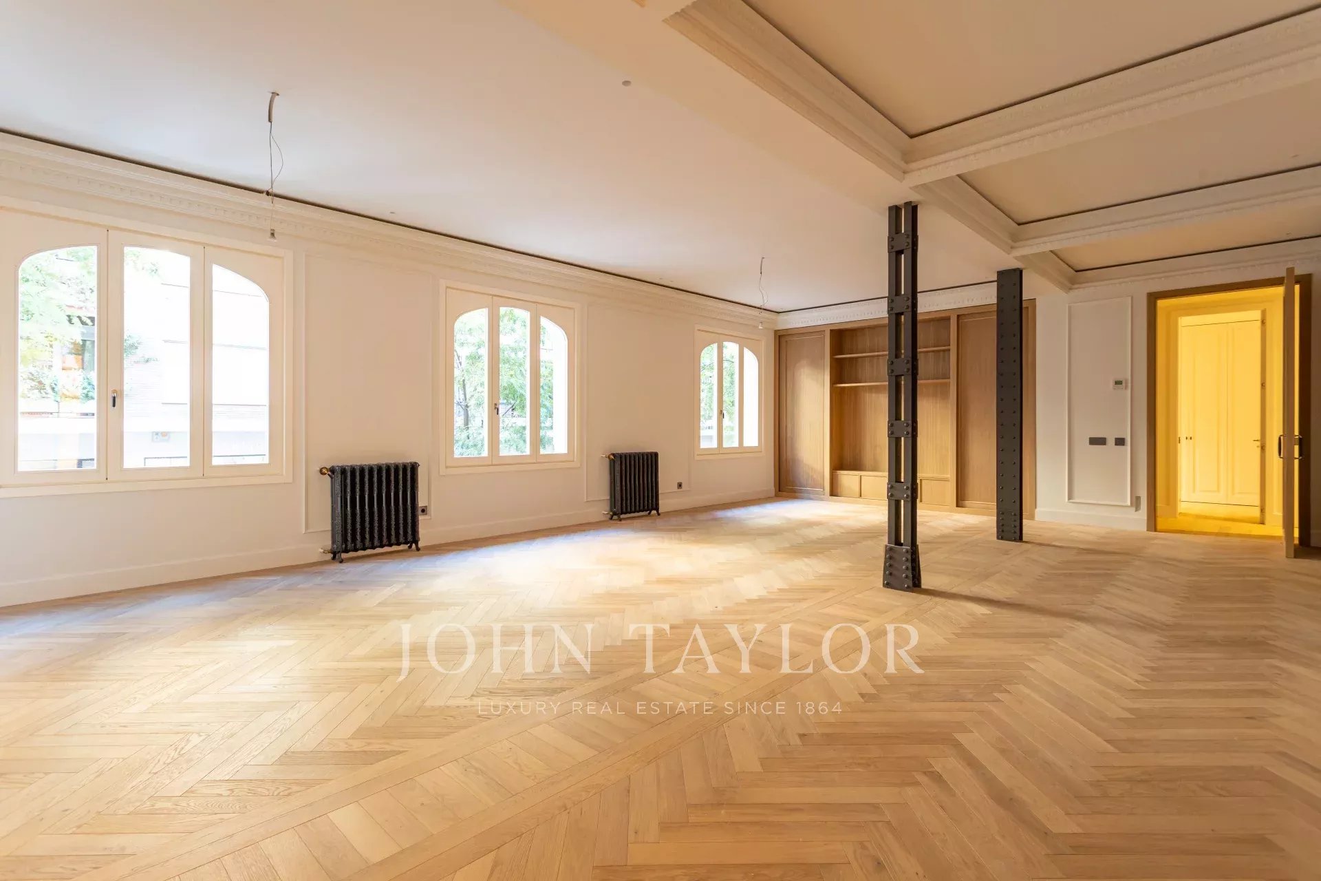 Localizado en una calle tranquila en una de las zonas más cotizadas del barrio de Almagro. El piso tiene 253 m² y ocupa toda la primera planta de un edificio clásico de principios del siglo XX con 4 grandes ventanales al exterior. Las ventanas interiores dan a un amplio patio de manzana donde fluye muy bien la luz.