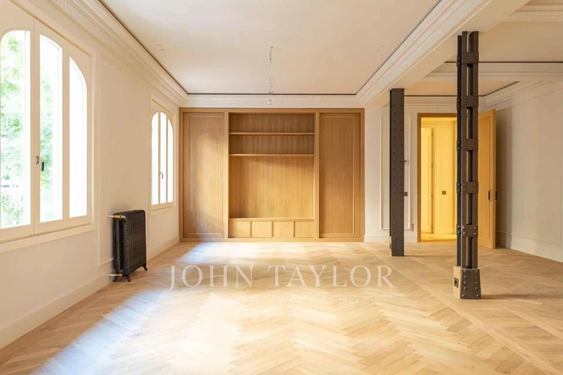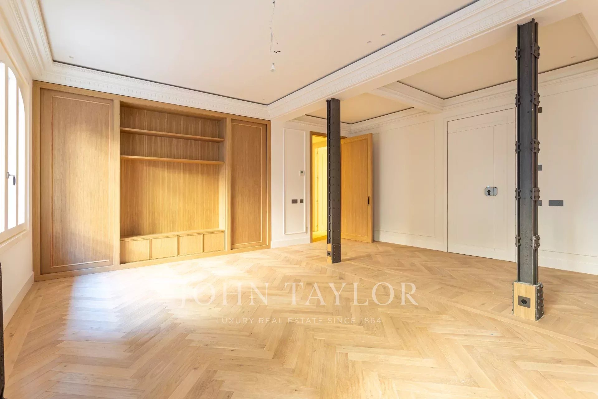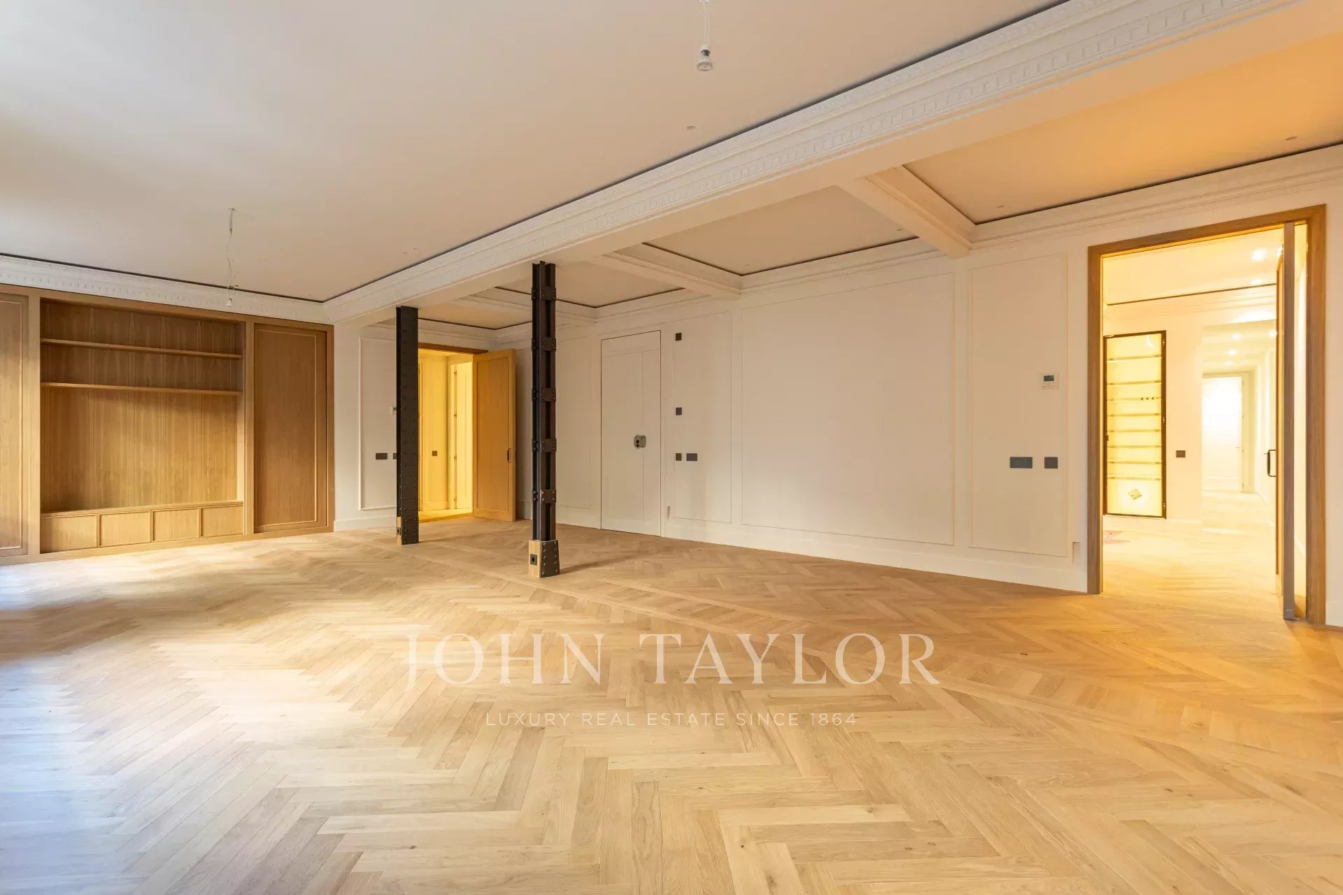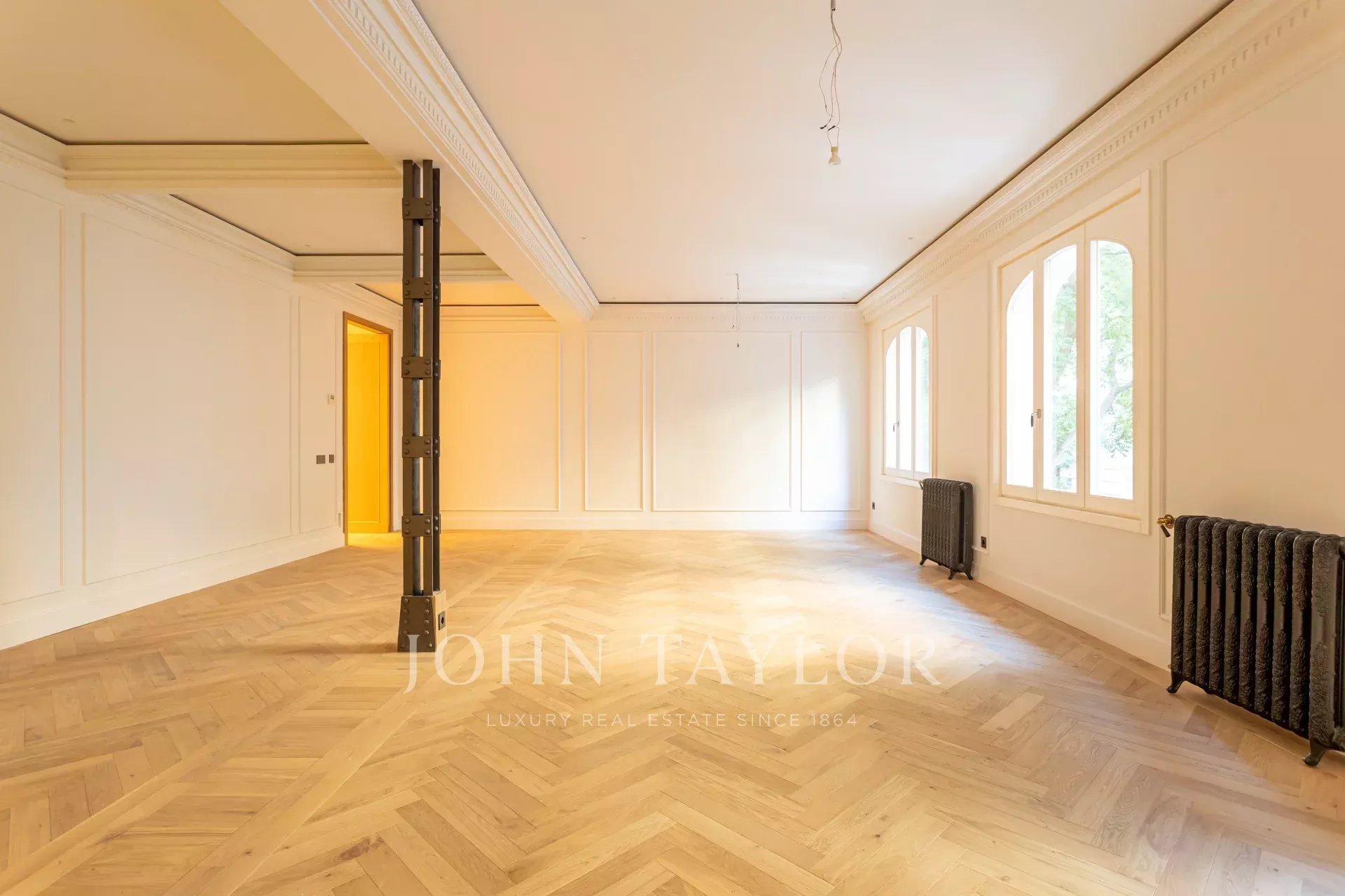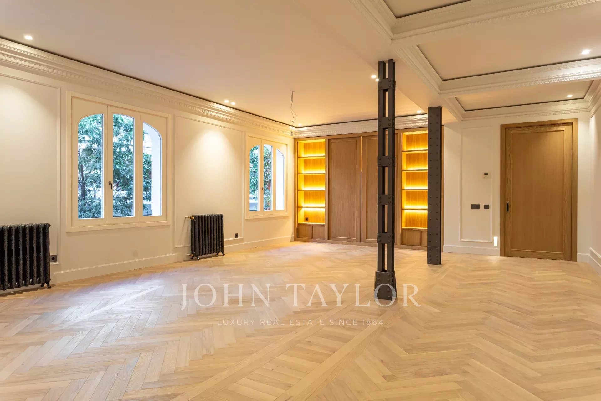 Localizado en una calle tranquila en una de las zonas más cotizadas del barrio de Almagro. El piso tiene 253 m² y ocupa toda la primera planta de un edificio clásico de principios del siglo XX con 4 grandes ventanales al exterior. Las ventanas interiores dan a un amplio patio de manzana donde fluye muy bien la luz.