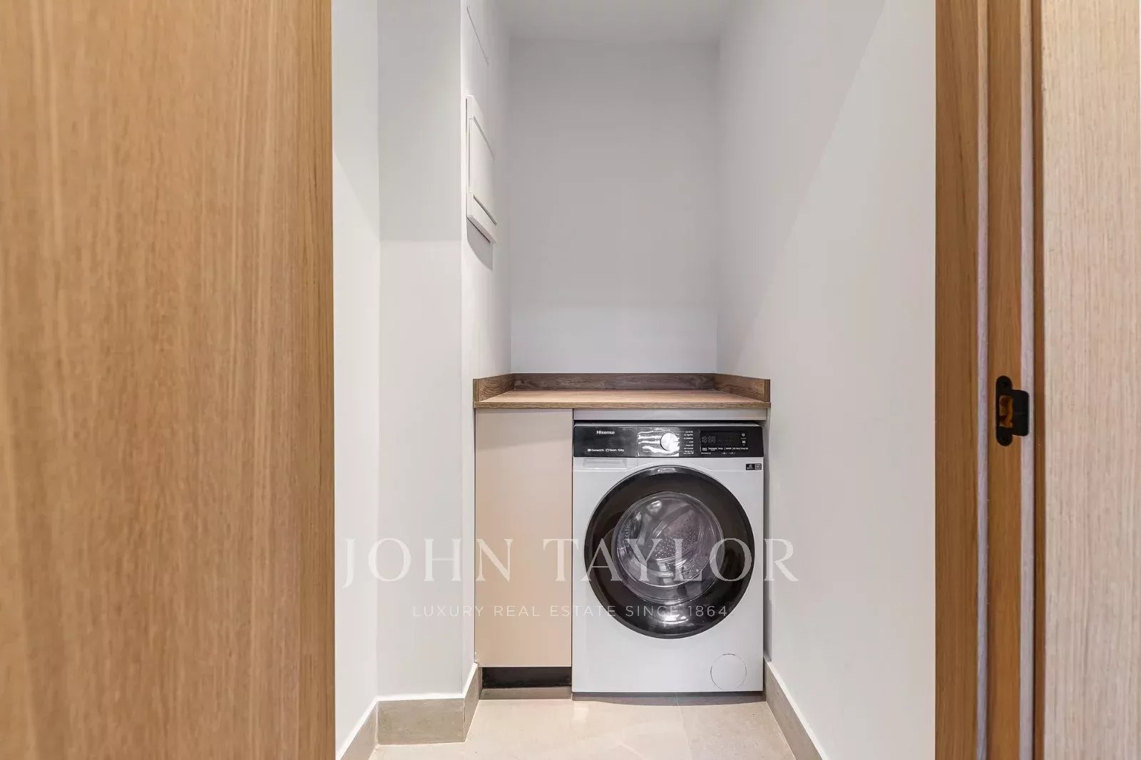 La cocina, independiente y perfectamente integrada en el conjunto de la vivienda, está equipada con electrodomésticos de alta gama y da acceso a una práctica zona de lavandería.