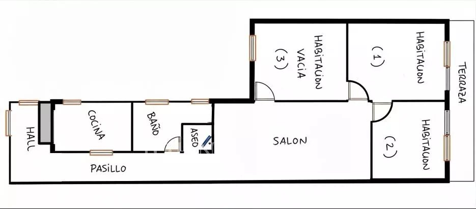 La vivienda cuenta con 3 dormitorios amplios, una distribución muy demandada para esta superficie. Todos los dormitorios tienen ventana: dos con orientación SUR a la calle y uno al patio interior. Las tres habitaciones disponen de cerradura individual, y dos de ellas se entregan amuebladas con camas con arcón y colchones de alta calidad.