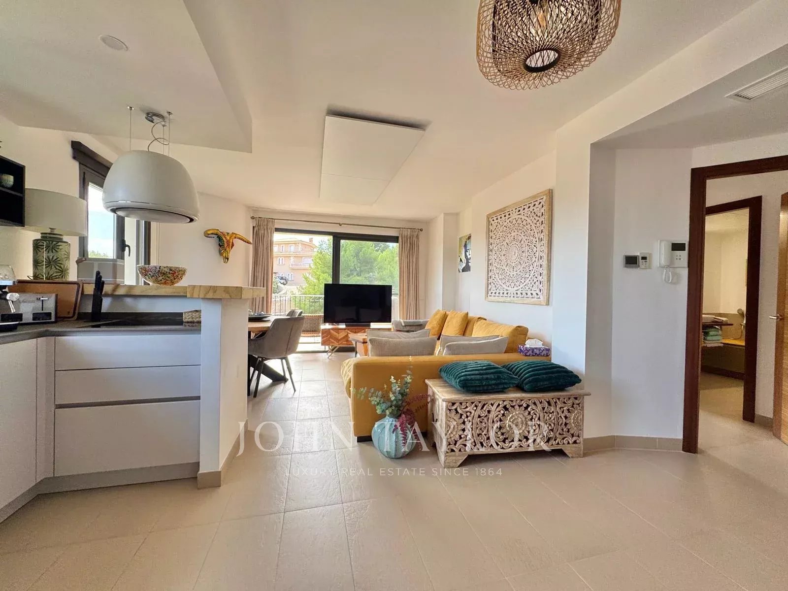 En la última planta de un elegante edificio con ascensor se encuentra este espectacular ático, un verdadero refugio de paz y estilo en uno de los rincones más deseados del suroeste mallorquín. Desde el primer momento, la comodidad está garantizada gracias a las dos plazas de aparcamiento privadas situadas justo frente a la puerta de entrada, bajo un práctico porche. Al entrar, la vivienda sorprende por su luminosidad y su cuidada distribución. El amplio dormitorio principal ofrece un baño en suite y unas vistas abiertas que invitan a soñar, creando un ambiente de descanso absoluto. En el extremo opuesto del apartamento, se ubica un segundo dormitorio doble, ideal para invitados o familiares, lo que asegura privacidad y confort. Además, dispone de una tercera estancia que puede utilizarse como dormitorio individual, despacho o sala polivalente, acompañada de un segundo baño con ducha. La cocina, de concepto abierto, destaca por su diseño moderno y funcional, equipada con electrodomésticos de alta gama y una elegante encimera de piedra natural. Se integra con fluidez en la zona de estar, un salón-comedor bañado por la luz natural, que conecta directamente con la terraza principal y se convierte en el corazón del hogar.