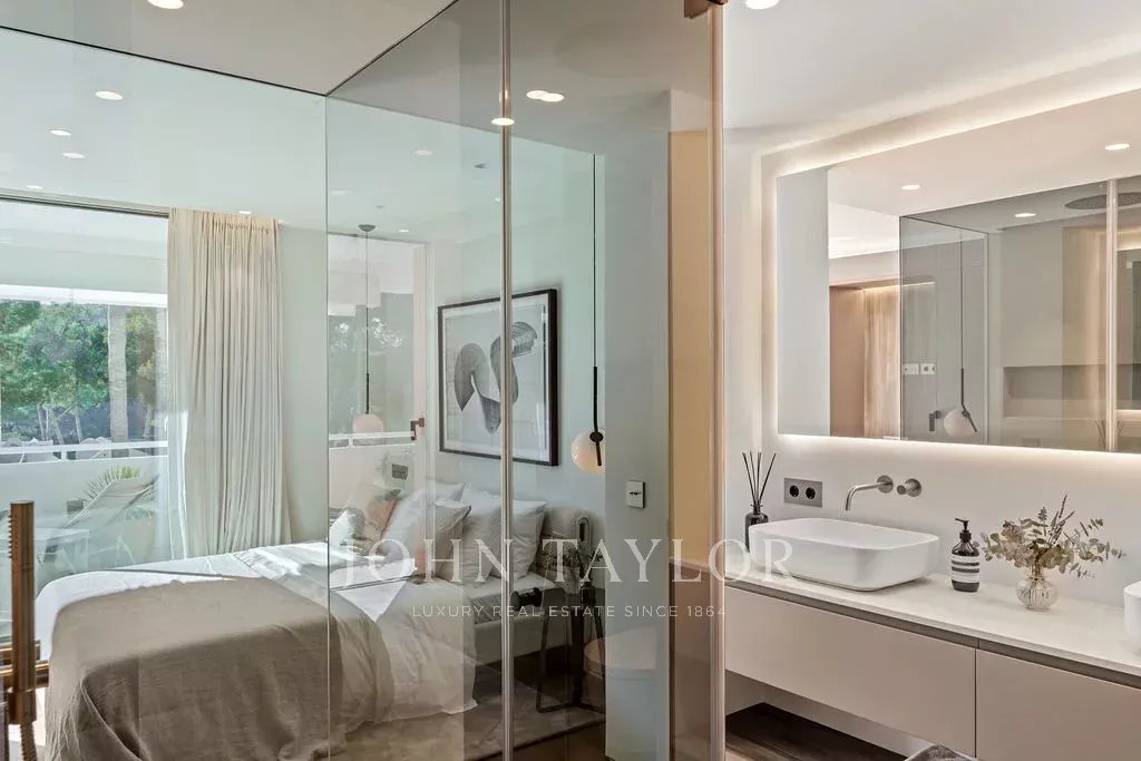 Este apartamento a la venta en Bendinat es una verdadera joya en una de las zonas residenciales más exclusivas y seguras de Mallorca. Cada detalle ha sido cuidadosamente seleccionado y diseñado para ofrecer el máximo lujo y comodidad a sus futuros propietarios. La seguridad es una prioridad, con un sistema de cámaras y alarmas a medida para brindar tranquilidad total. Ofrece 3 dormitorios y 2 cuartos de baño. Las ventanas y puertas de cristal correderas de piso a techo son de Cortiza, una marca reconocida por su calidad y estilo minimalista. Además, se han instalado puertas y cubiertas a medida para la maquinaria en la terraza. En cuanto al interior, la cocina y los armarios han sido diseñados por una prestigiosa empresa carpintera de Mallorca, garantizando calidad y funcionalidad. Lo mismo ocurre con los muebles de baño, los espejos de madera, las puertas interiores y la cocina exterior. El apartamento cuenta con electrodomésticos de alta gama, como los aparatos eléctricos SMEG en la cocina y los de lavandería BOSCH. El mobiliario incluye piezas de marcas reconocidas como Poliform y Barzaghi, junto con diseños personalizados de Francia. Para el entretenimiento, se ha instalado un sistema de música Bang & Olufsen y un televisor LG, con todas las habitaciones preparadas para televisores adicionales. Los espacios interiores están iluminados con elegantes luces de decoración de FLOS, mientras que las áreas exteriores cuentan con mobiliario de RODA y DEDON. Los detalles adicionales incluyen suelos de madera, piedra natural Gris Sarzi, cortinas de lino a medida y accesorios de baño de la marca Iconico. Desde interruptores eléctricos hasta grifos y manijas de puertas, todo ha sido seleccionado con atención al detalle y calidad excepcional. En resumen, este apartamento representa la combinación perfecta de lujo, seguridad y estilo en uno de los destinos más codiciados de Mallorca.