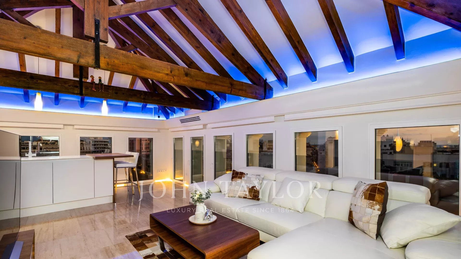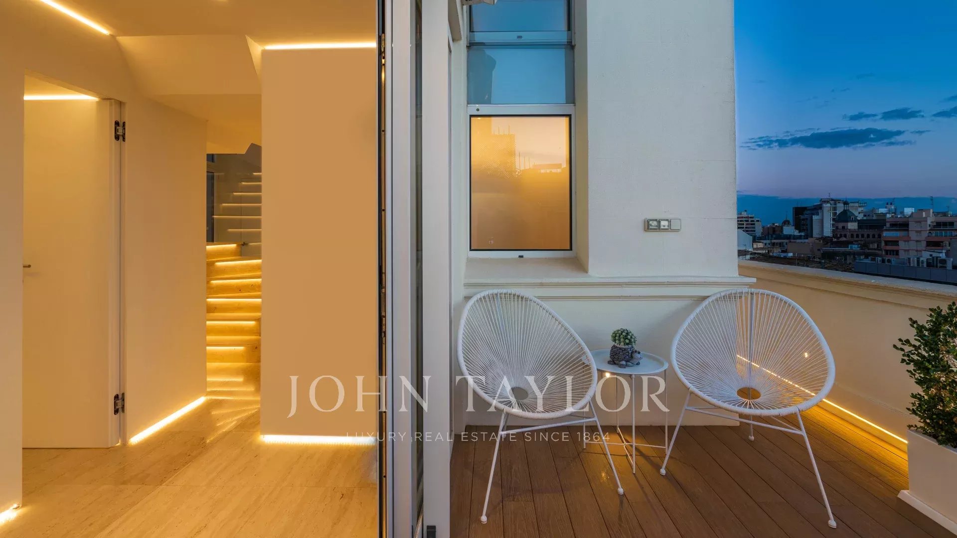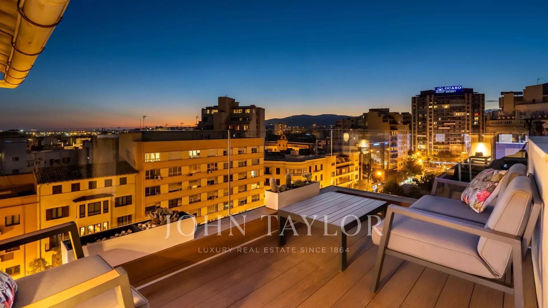 Este singular ático dúplex ha sido objeto de una completa reforma durante el año 2021. Ubicado en lo alto de uno de los edificios más emblemáticos de las Avenidas, ofrece unas vistas abrumadoras sobre la ciudad y hacia el mar. En la planta inferior hay dos dormitorios, dos baños, aseo de invitados y acceso a una de las dos terrazas. En la planta superior se encuentra la cocina, el salón y el comedor con ventanas envolventes con vistas de 360º, techos con vigas de madera y acceso directo a la segunda terraza. Con calefacción por suelo radiante en toda la casa, aire acondicionado central y la instalación domótica asegura la comodidad y la facilidad de gestionar la propiedad vía teléfono, iPad u ordenador. La propiedad se vende completamente amueblada e incluye dos plazas de garaje.