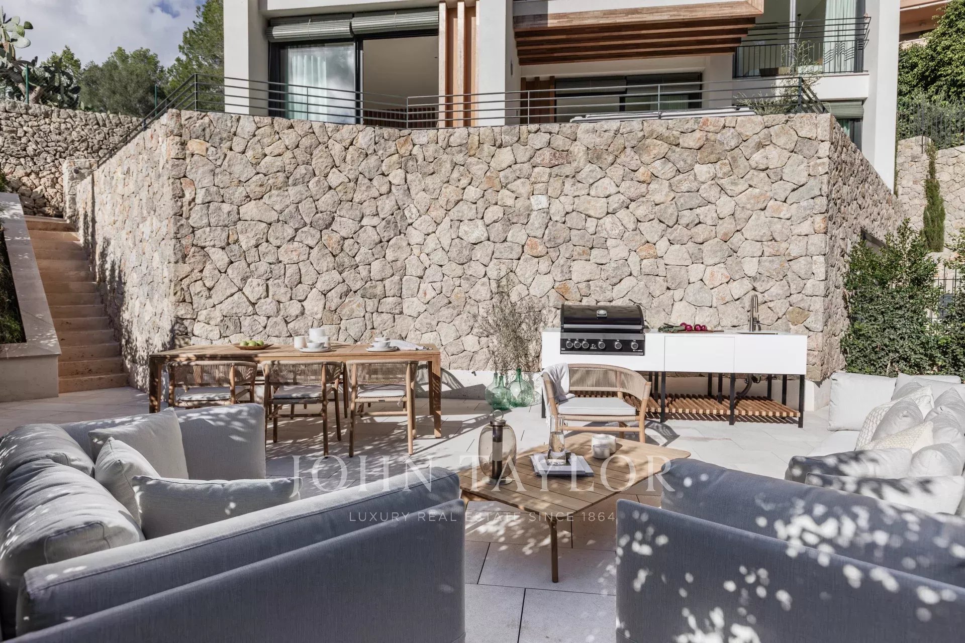 Totalmente amueblado con piezas italianas a medida de Barzaghi Salotti y Ethimo, cada espacio refleja una artesanía excepcional. Toda la carpintería, incluyendo cocinas, armarios y baños, ha sido realizada a mano por artesanos mallorquines, garantizando precisión y calidad.