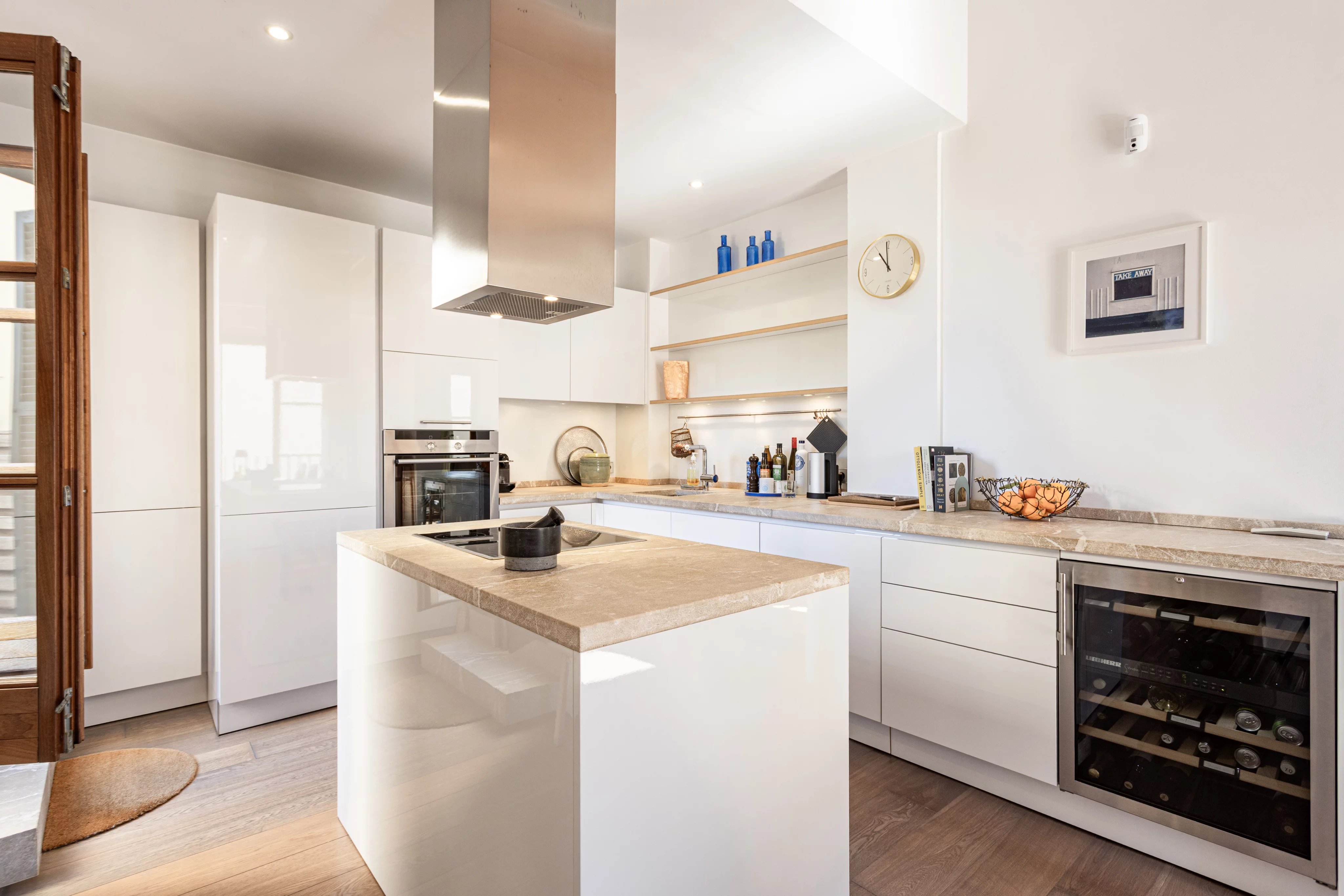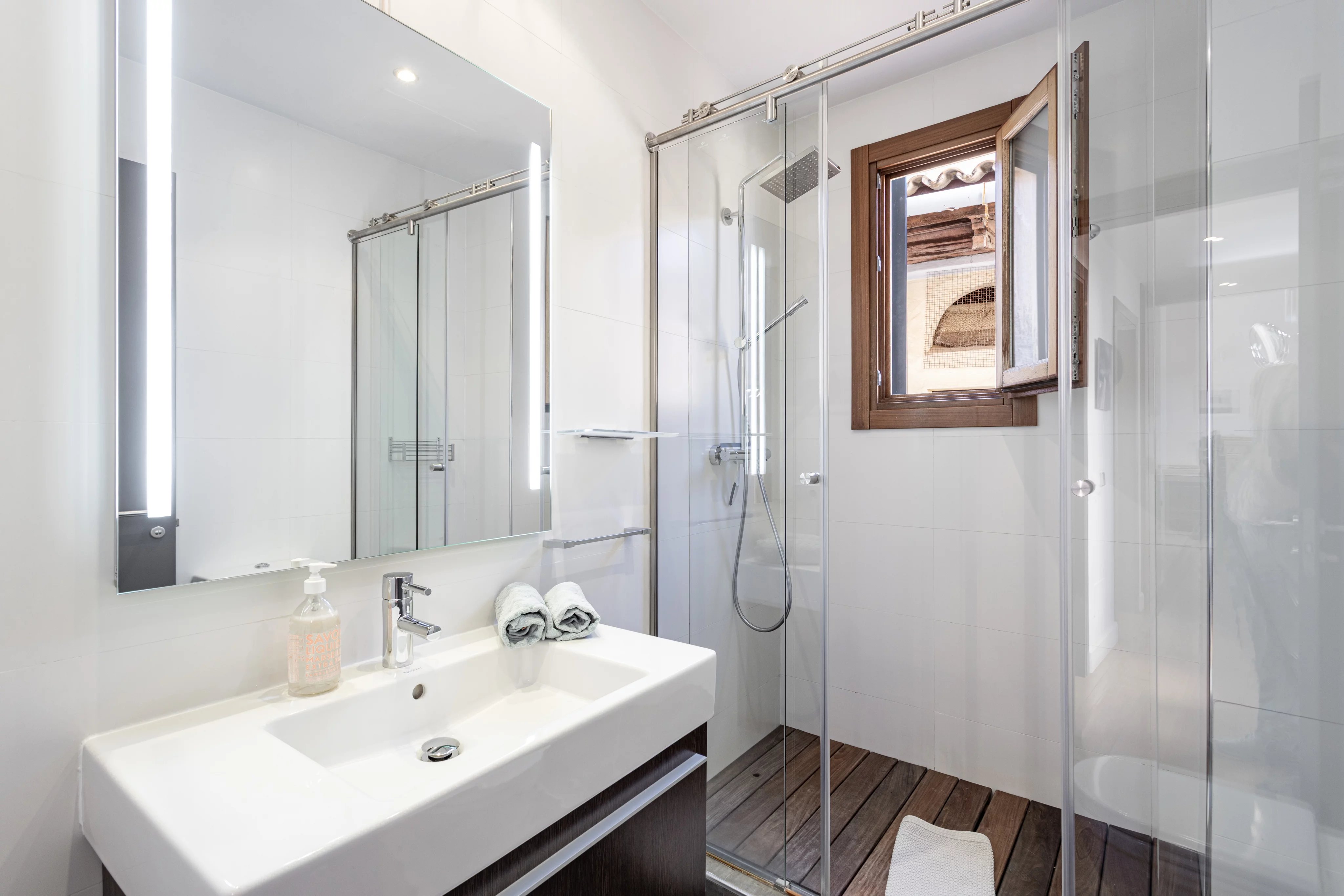 La zona de noche está claramente separada. La suite principal se sitúa en un extremo de la vivienda, con baño en suite discretamente integrado tras una puerta oculta en un armario, mientras que las dos habitaciones de invitados se encuentran en el lado opuesto.