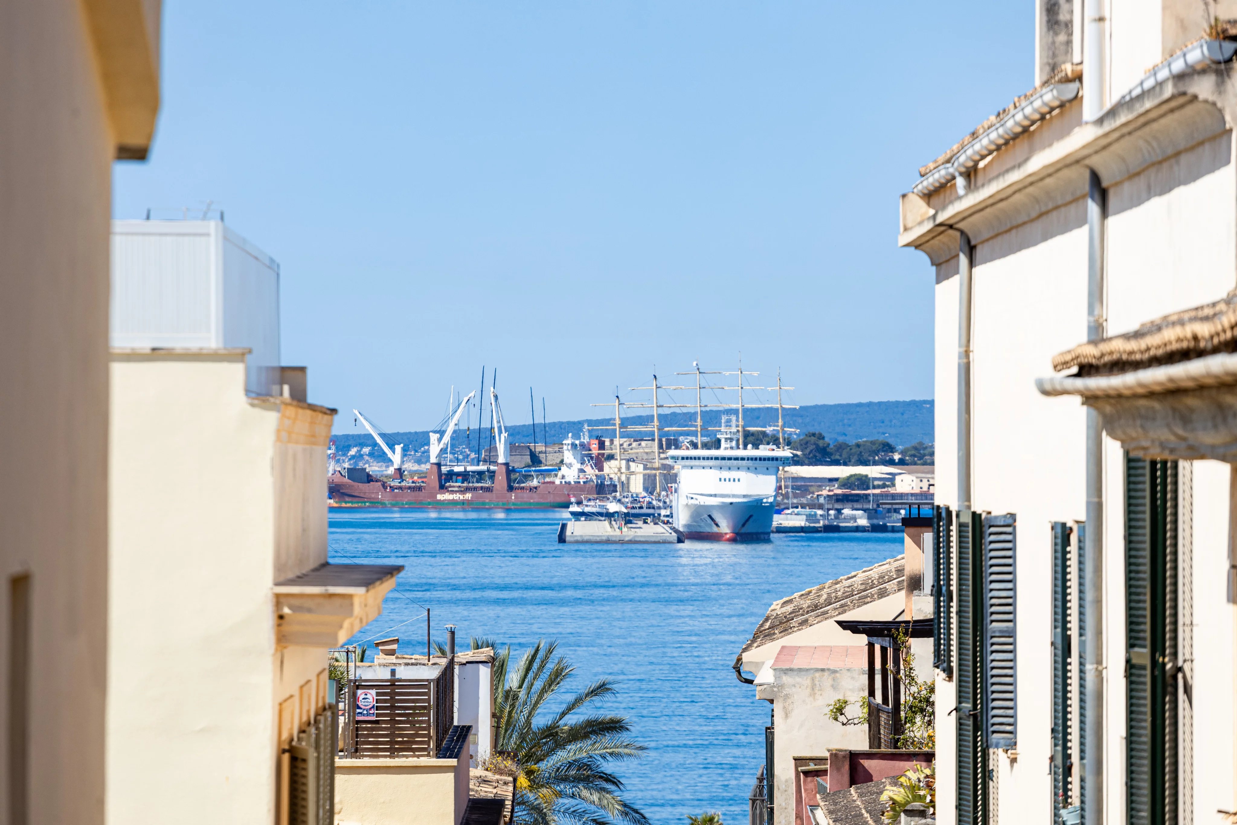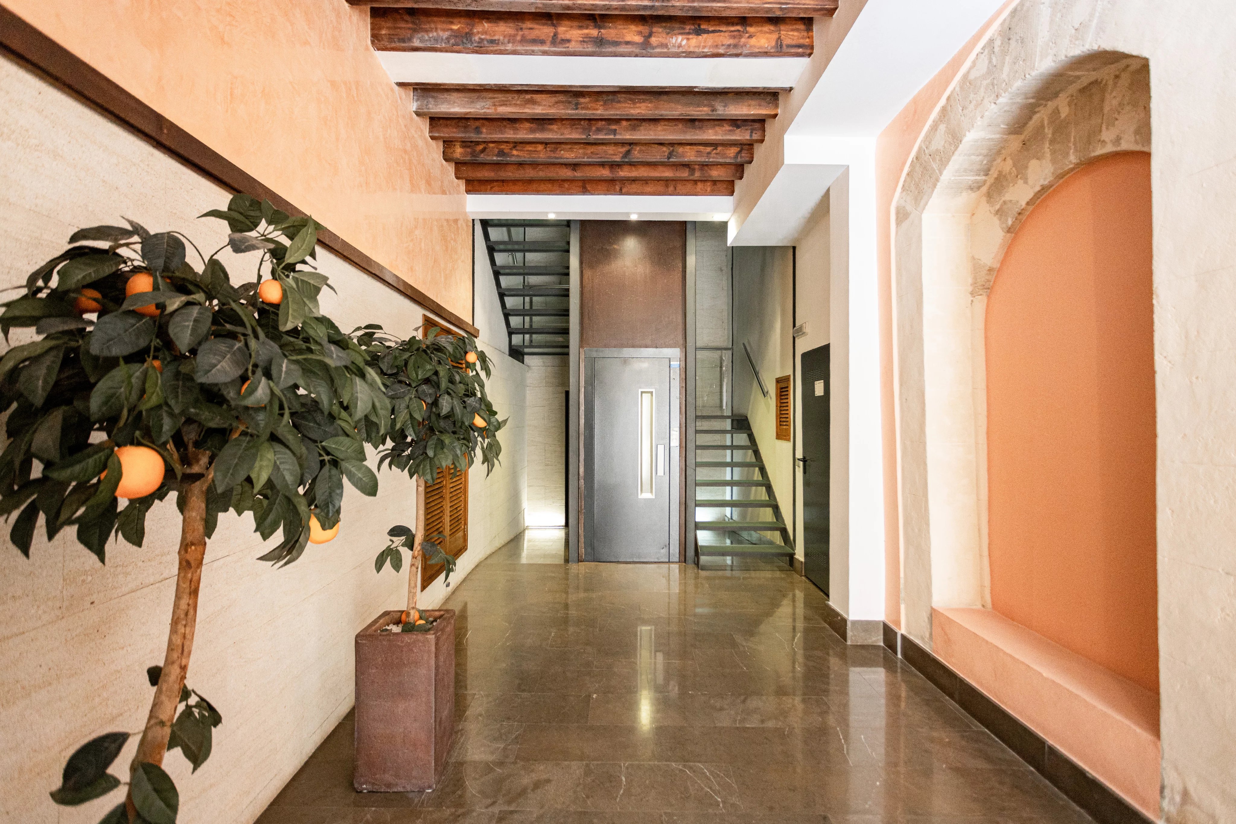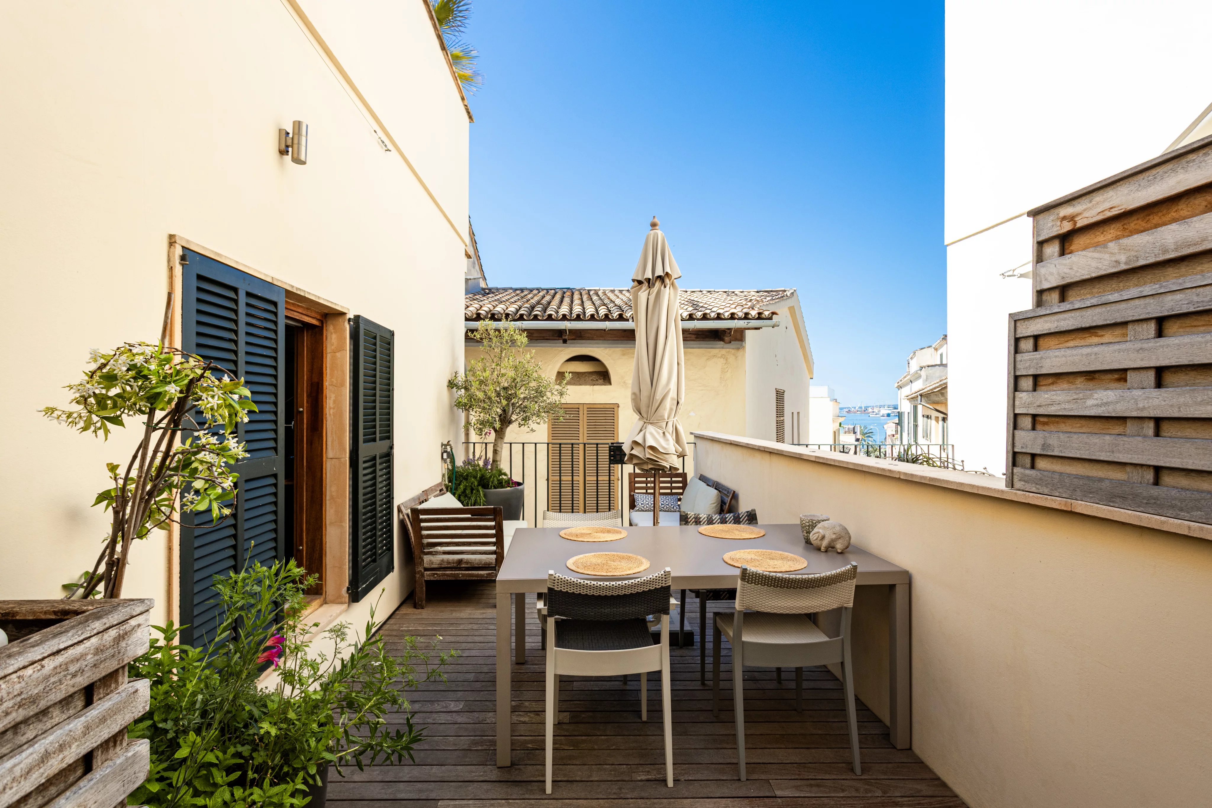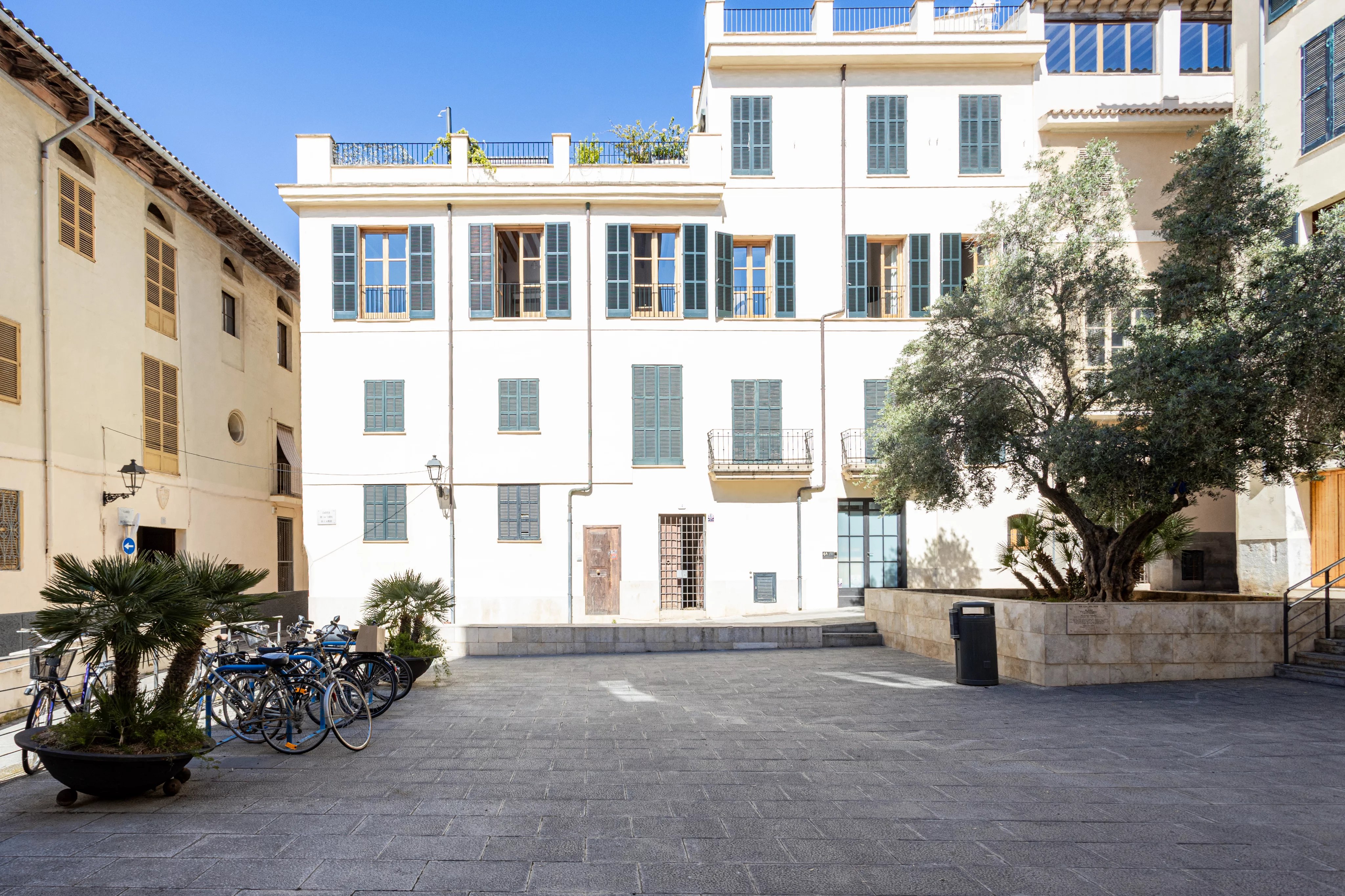 En el corazón de Calatrava, una de las zonas más demandadas del casco antiguo de Palma, esta propiedad ocupa una posición en esquina sobre una amplia plaza, lo que le aporta una sensación poco habitual en el centro histórico: luz abierta, privacidad y ausencia de edificios directamente frente a las ventanas, con el teatro al otro lado de la plaza.