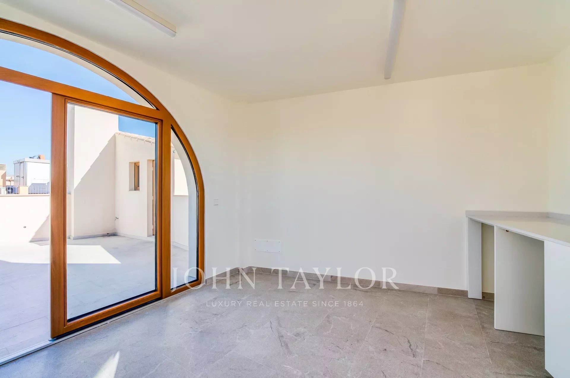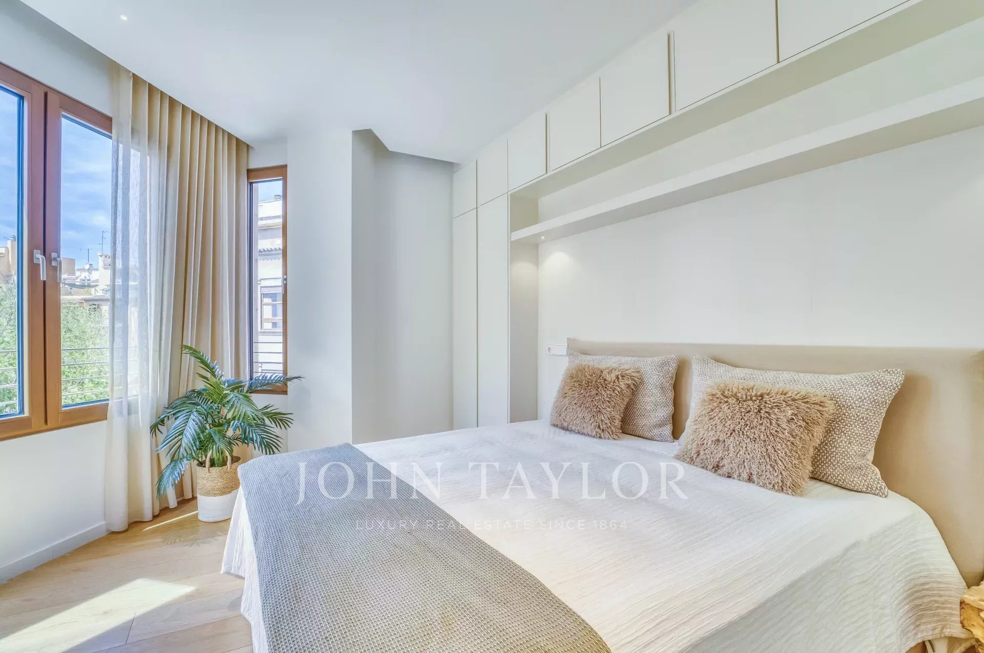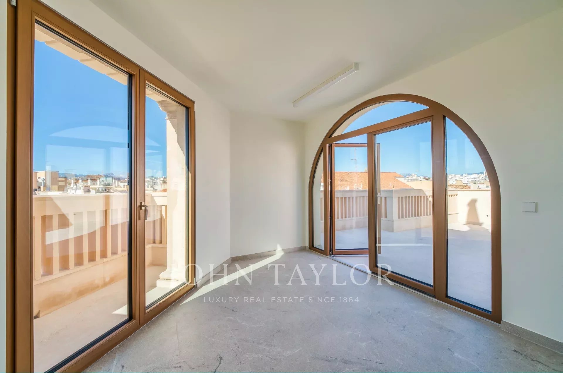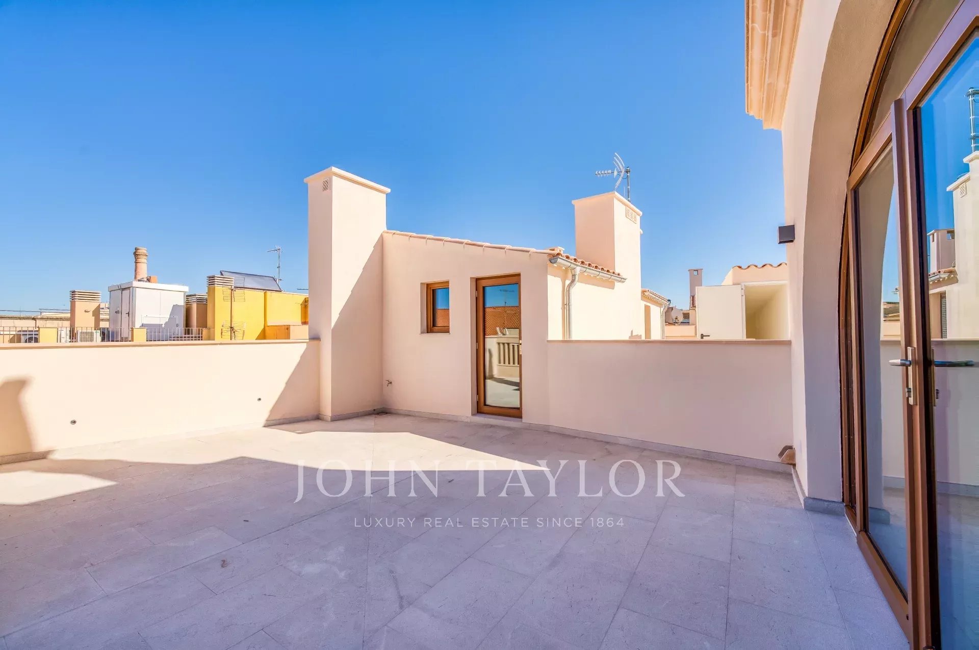 Situado en una tranquila plaza en el corazón del Casco Antiguo de Palma, este lujoso ático dúplex de nueva construcción consta de dos dormitorios, tres baños (dos en suite) y un aseo de cortesía, una zona de lavandería y una terraza solárium espectacular. Mientras que el acceso ofrece una espaciosa planta abierta para la cocina-comedor y sala de estar, los dormitorios de la planta inferior crean una tranquila zona de privacidad. Los grandes ventanales hechos a medida, los suelos de madera y los cálidos tonos del interior crean un ambiente acogedor en todas las estancias. Lo más destacado del apartamento es la terraza privada, que es accesible directamente a través del apartamento. Desde aquí, podrá disfrutar de vistas panorámicas al casco antiguo y al mar. Para su comodidad personal, todo el ático está equipado con calefacción por suelo radiante, aire acondicionado y sistema domótico. Existe la posibilidad de adquirir una plaza de garaje en el mismo edificio.