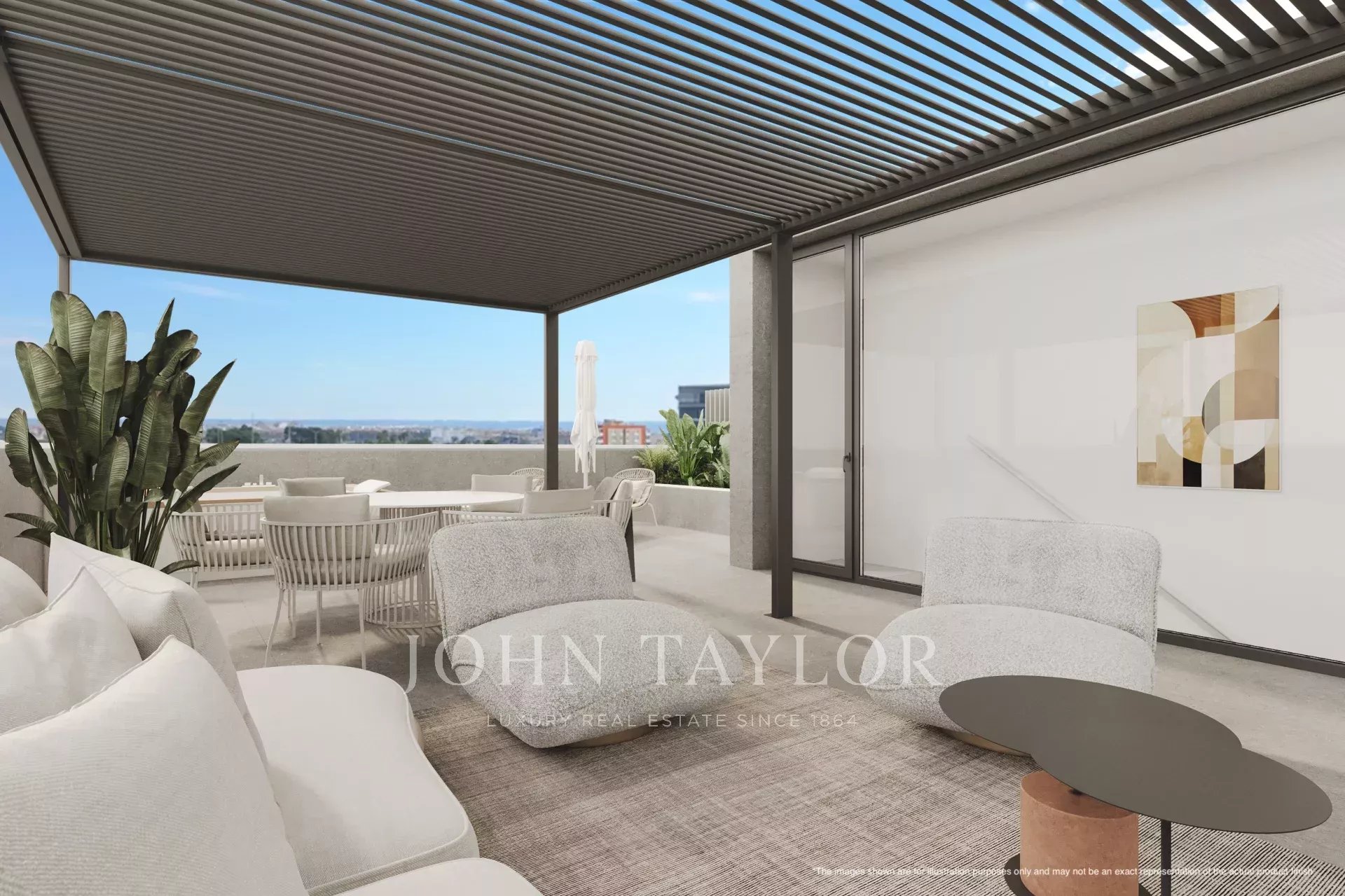 Este ático en la 4ª planta ofrece una cocina americana totalmente equipada, comedor y sala de estar con 2 dormitorios y 2 baños (1 en suite). La escalera interior le lleva a la magnífica terraza de 103 m² que ofrece un amplio espacio para crear un salón exterior, comedor y zona de entretenimiento. Con una superficie total construida de 270 m² y una superficie habitable interior de 98 m², le espera un ambiente cómodo y elegante. Hay tres diseños de interior para elegir: Adagio, Arta y Raw.