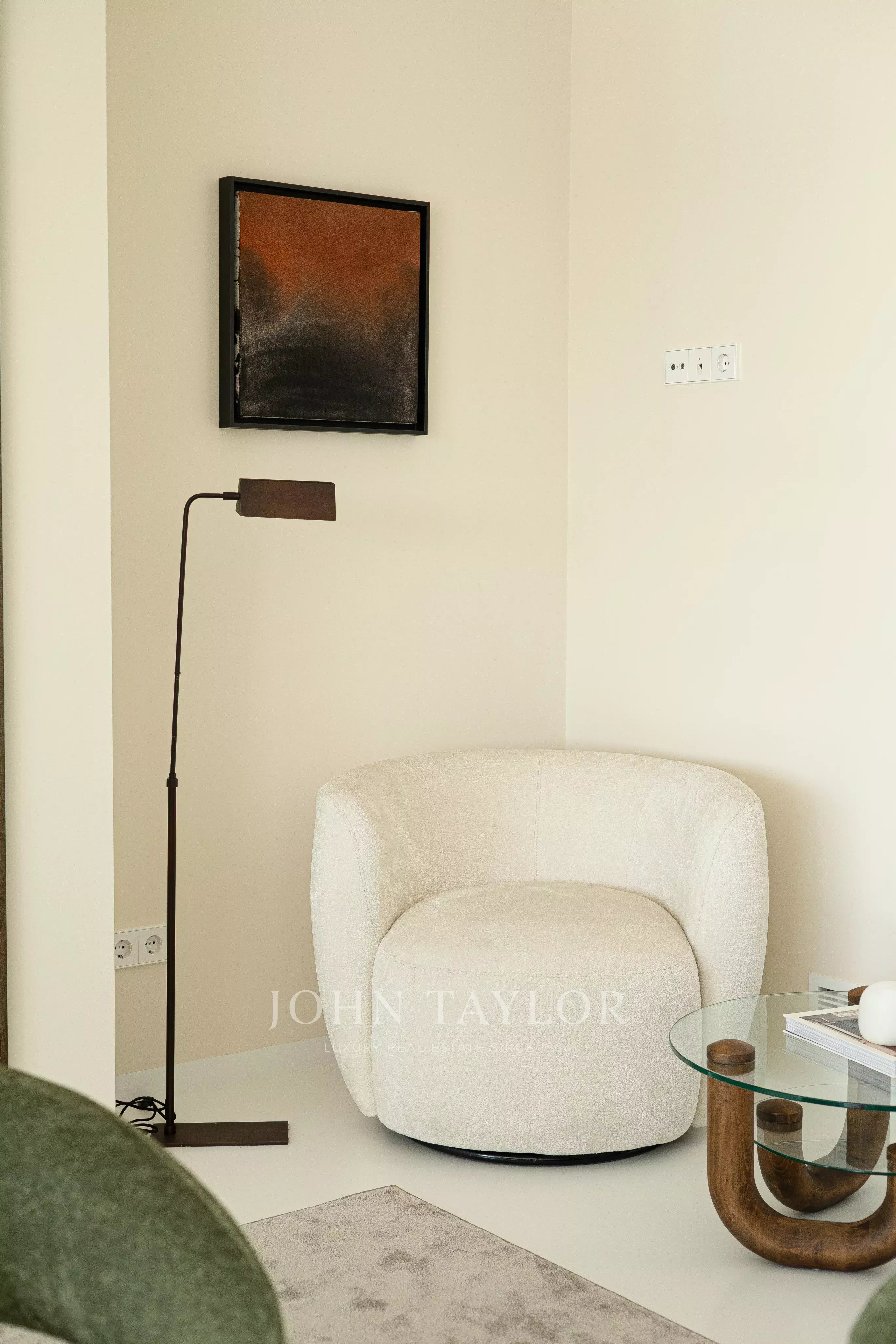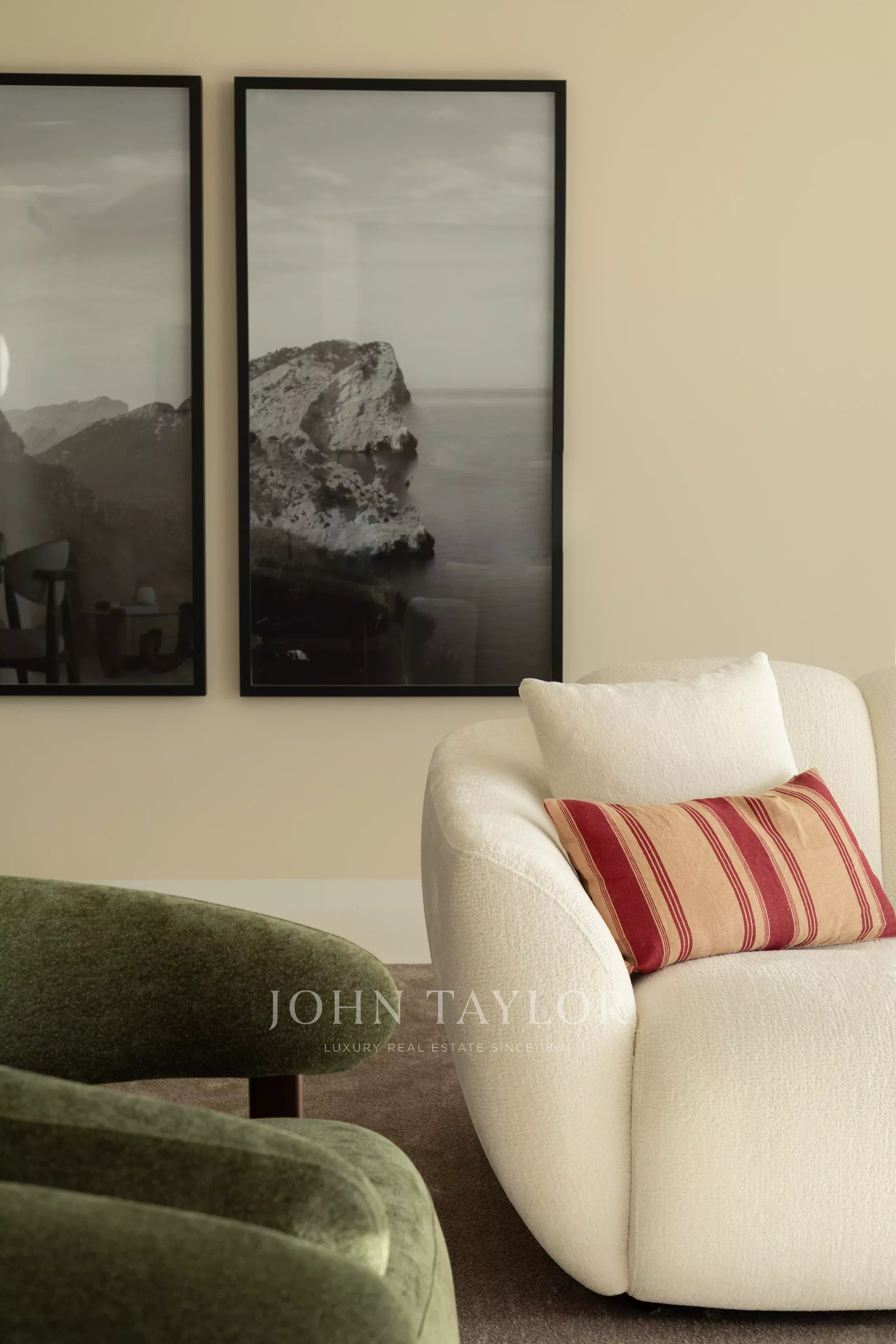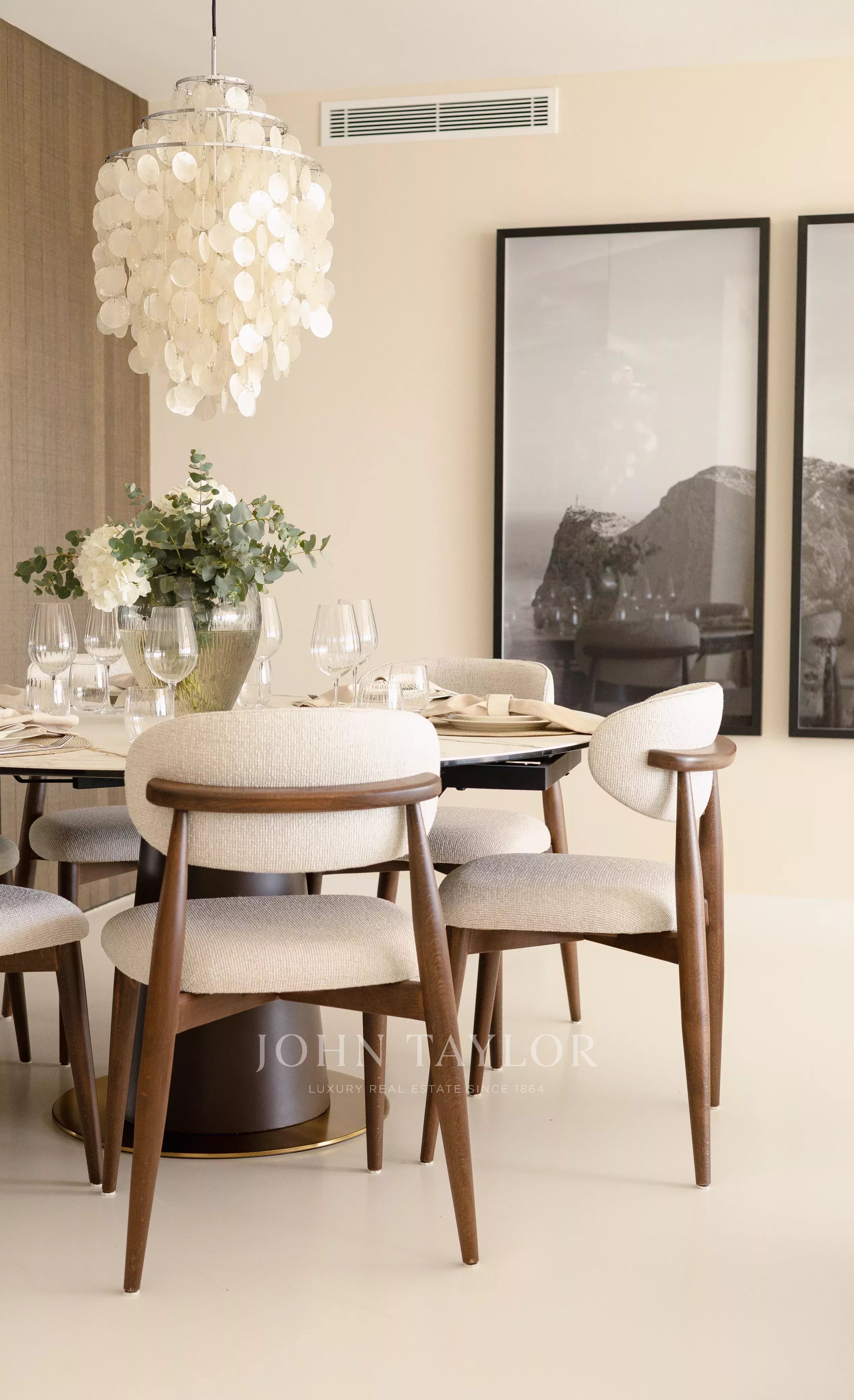 La cocina a medida, totalmente equipada con electrodomésticos AEG, fluye sin esfuerzo hacia el comedor y la zona de estar, completa con una acogedora chimenea. La terraza exterior no podría ser un mejor lugar para entretenerse, disfrutar del sol o simplemente relajarse, y rodea el apartamento.