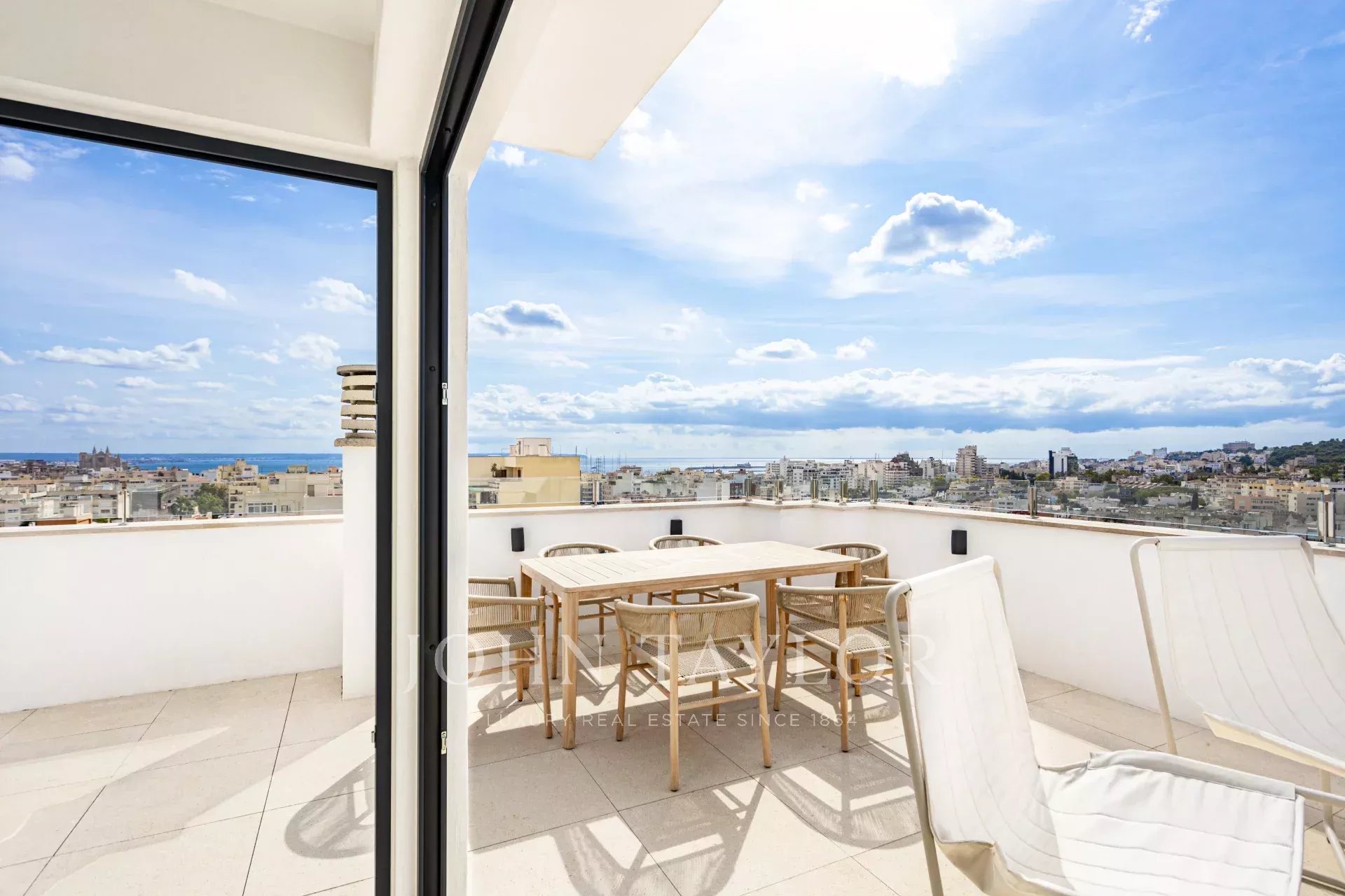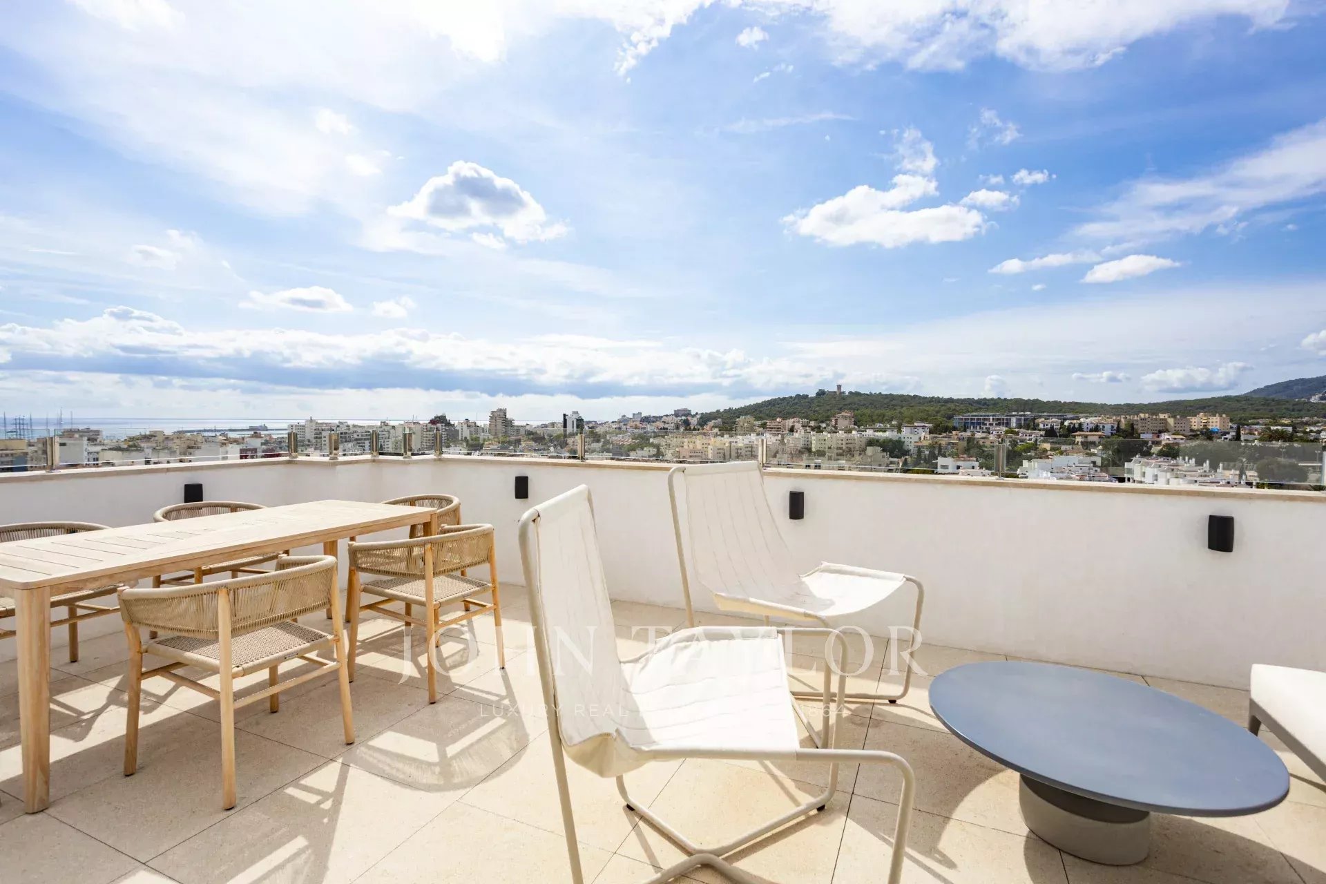 La azotea alberga lo más destacado de esta excepcional propiedad: una gran terraza con zona de comedor y un salón chill-out con sofá y sillones, ideal para relajarse, recibir invitados o disfrutar de las magníficas puestas de sol sobre Palma y el mar Mediterráneo.