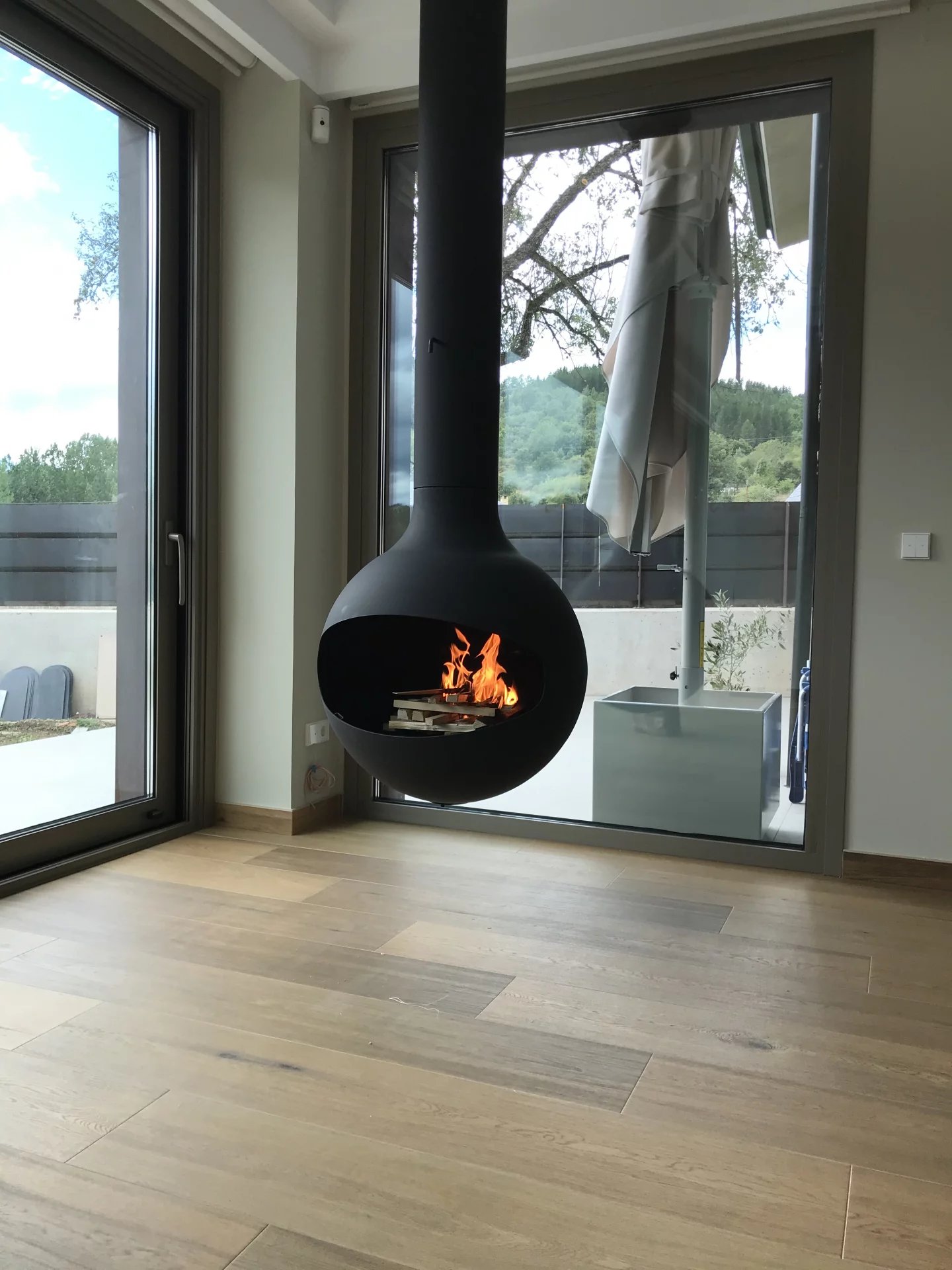 - Chimenea Focus BATHYSCAFOCUS negra, descolgada del techo. Parachispas y guante.