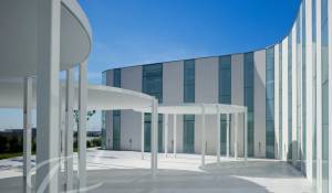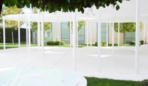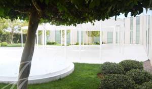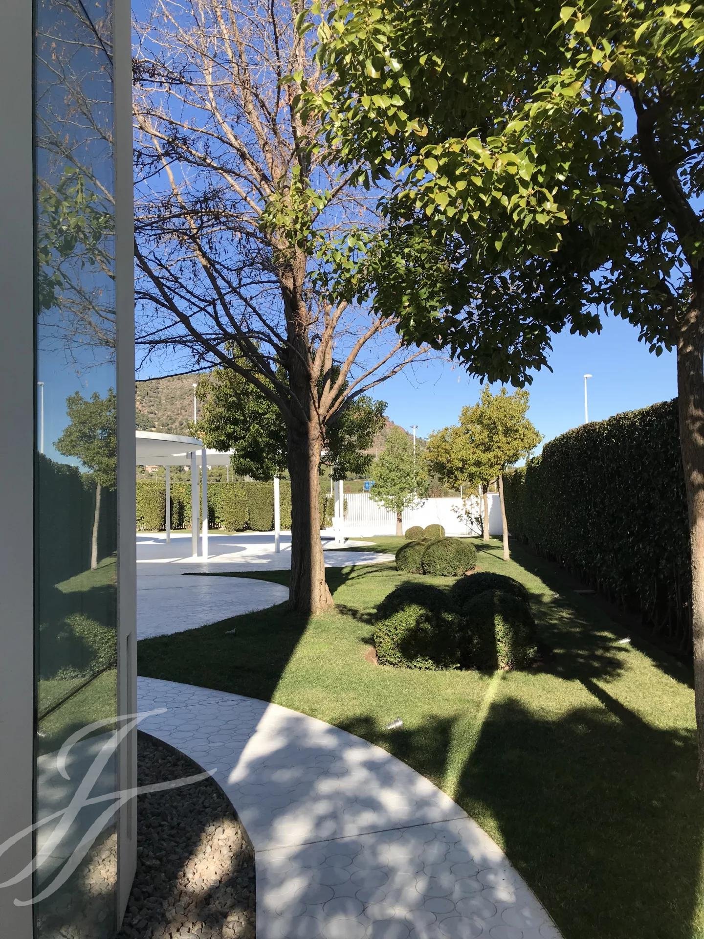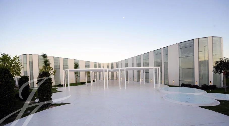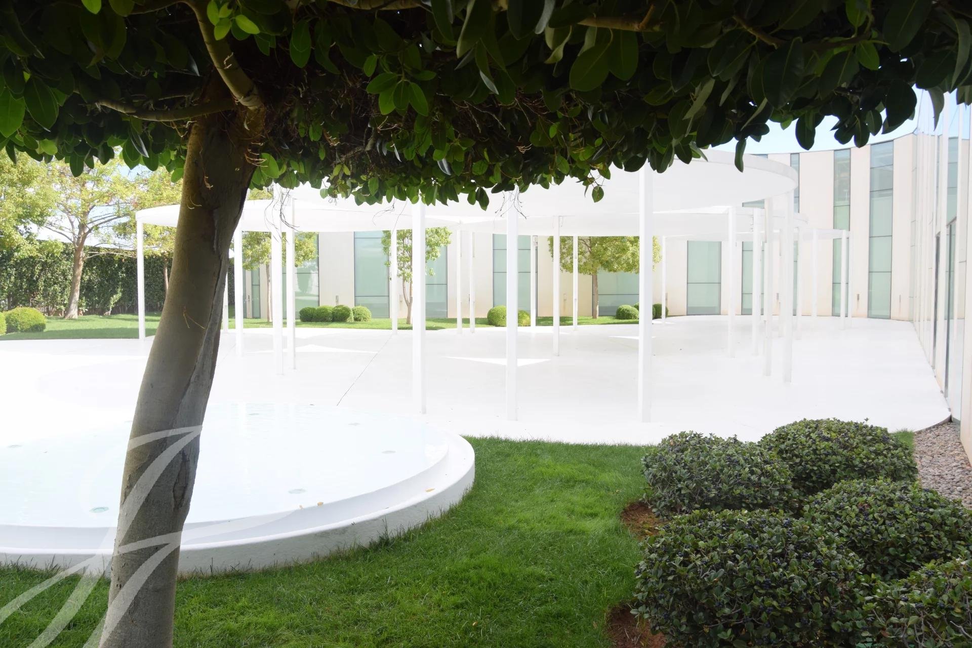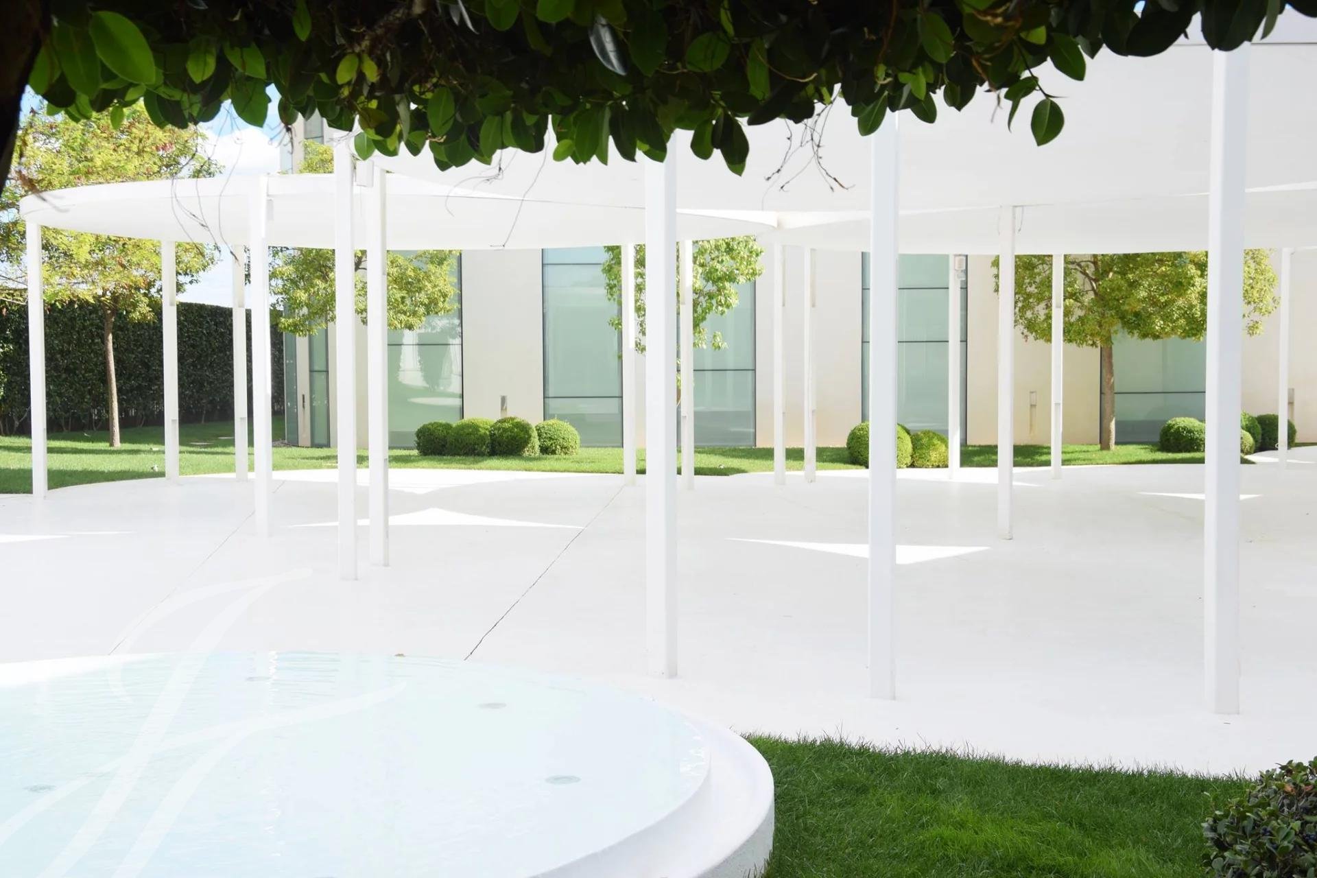 La zona exterior ajardinada está integrada en la arquitectura moderna del edificio siendo el jardín de inspiración mediterránea y con zonas de agua, diseñado con composiciones en verde y blanco. Además, cuenta con 2 terrazas exteriores de 550 y 650 metros cuadrados como complemento de las salas interiores.