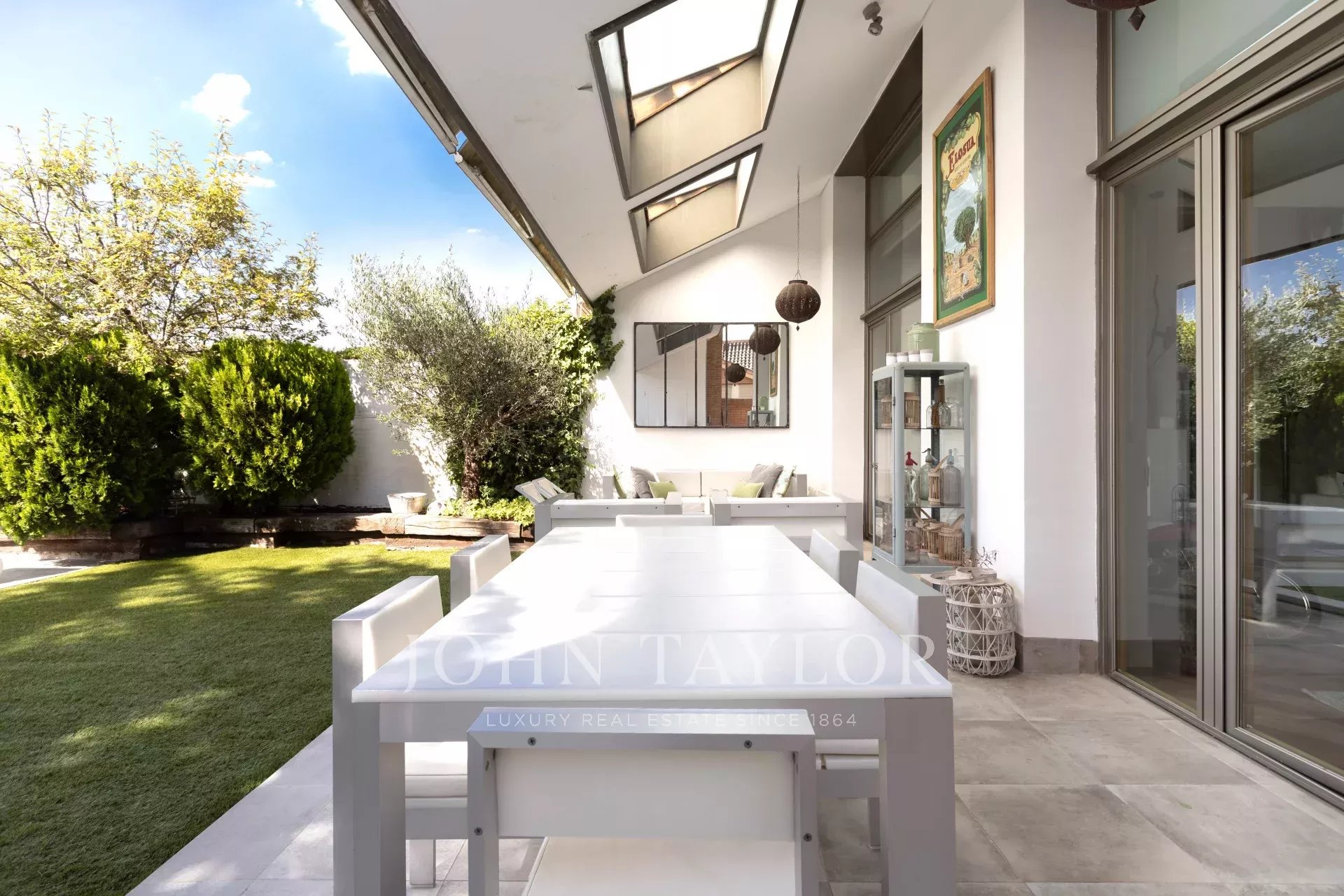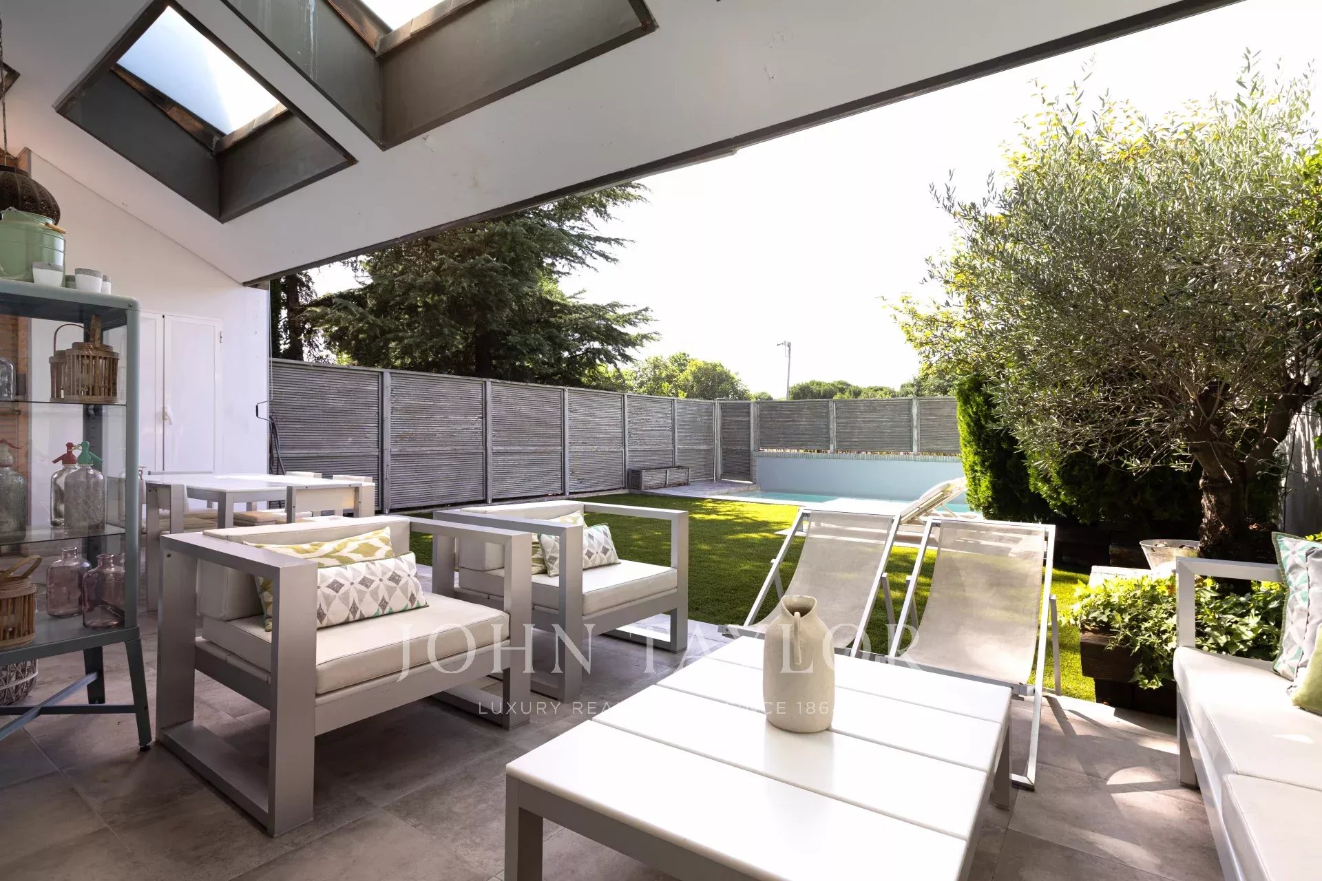 El exterior de la casa cuenta con piscina privada, revestida para evitar fugas de agua y jardín privado con césped artificial de máxima calidad. Y en cuanto a zonas comunes, encontramos grandes espacios verdes, áreas de ocio con zonas "chill out", pistas de pádel y senderos agradables para pasear.