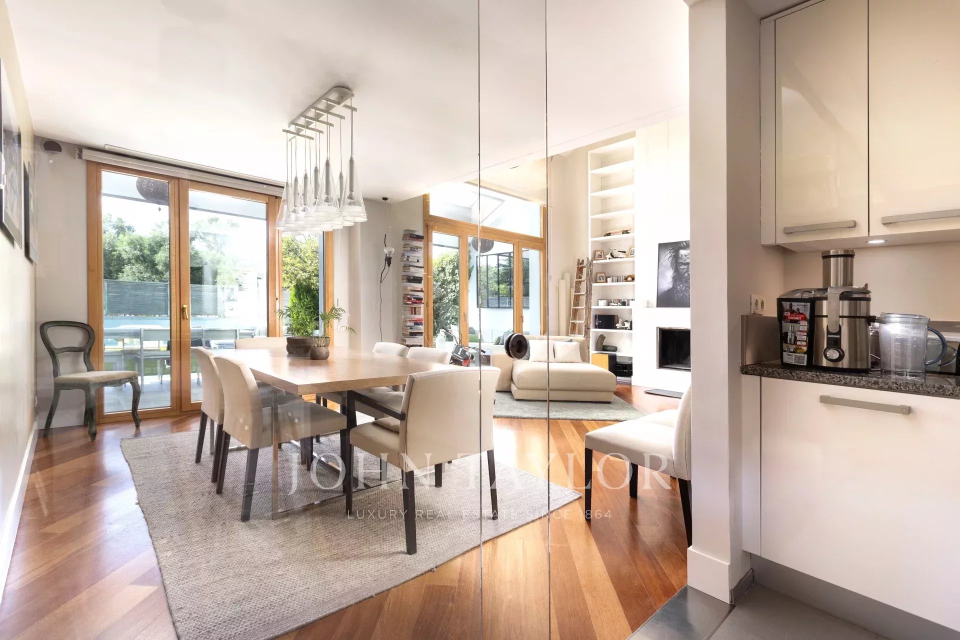 Al entrar en la casa encontramos un amplio hall con acceso a un amplio salón y despacho. Siguiendo hacia arriba tenemos un segundo salón-comedor luminoso con vistas a la piscina y jardín privado; y una extensa cocina. En el siguiente piso encontramos tres habitaciones llenas de luz y dos cuartos de baños que dan servicio a éstos. Y más arriba llegamos al dormitorio principal, que cuenta con baño en suite, vestidor contiguo a éste y balcón.