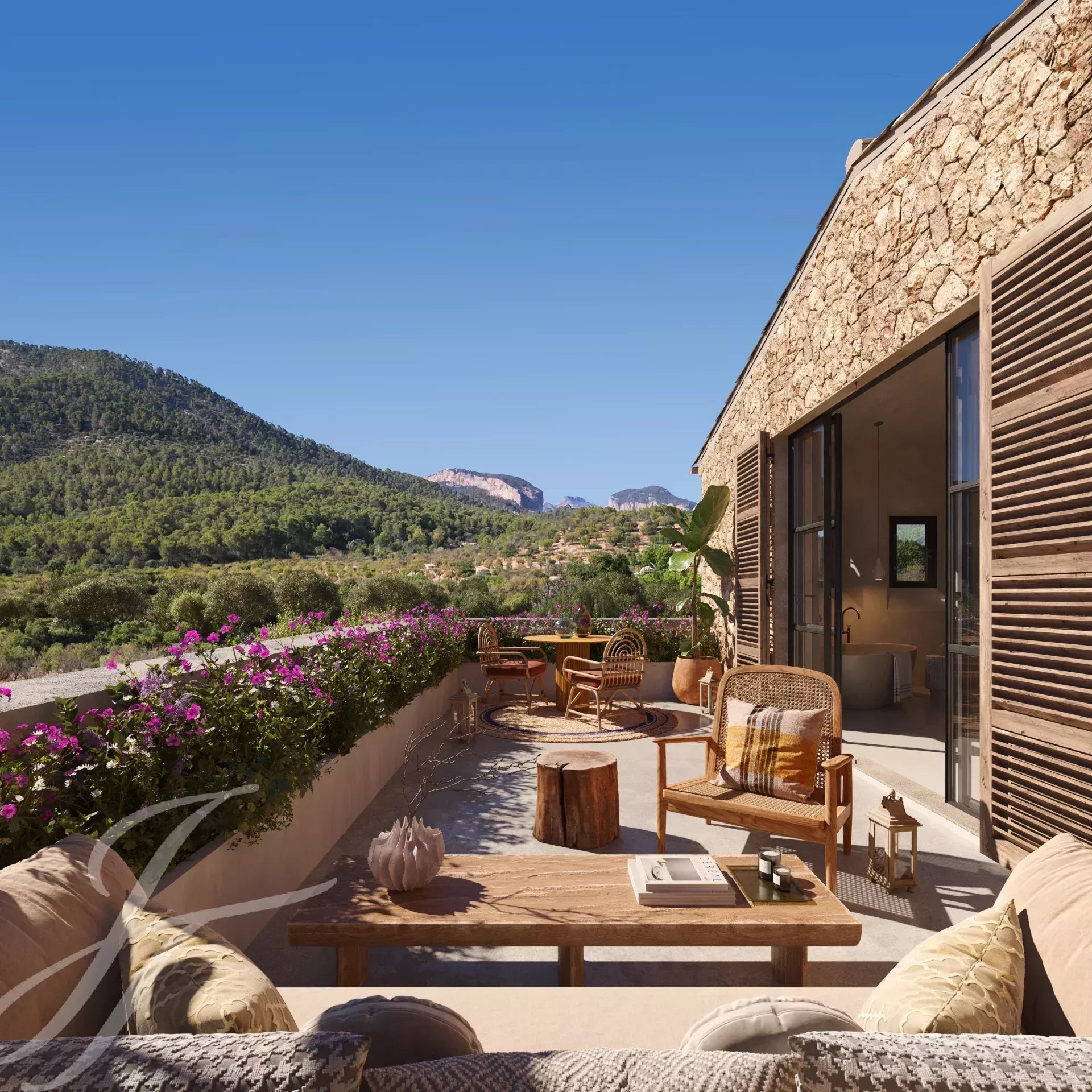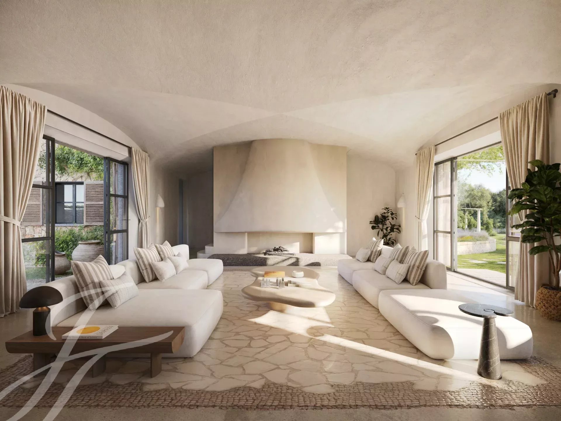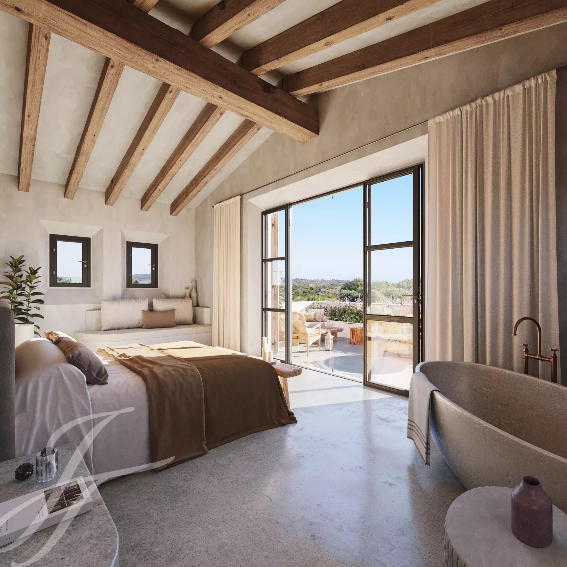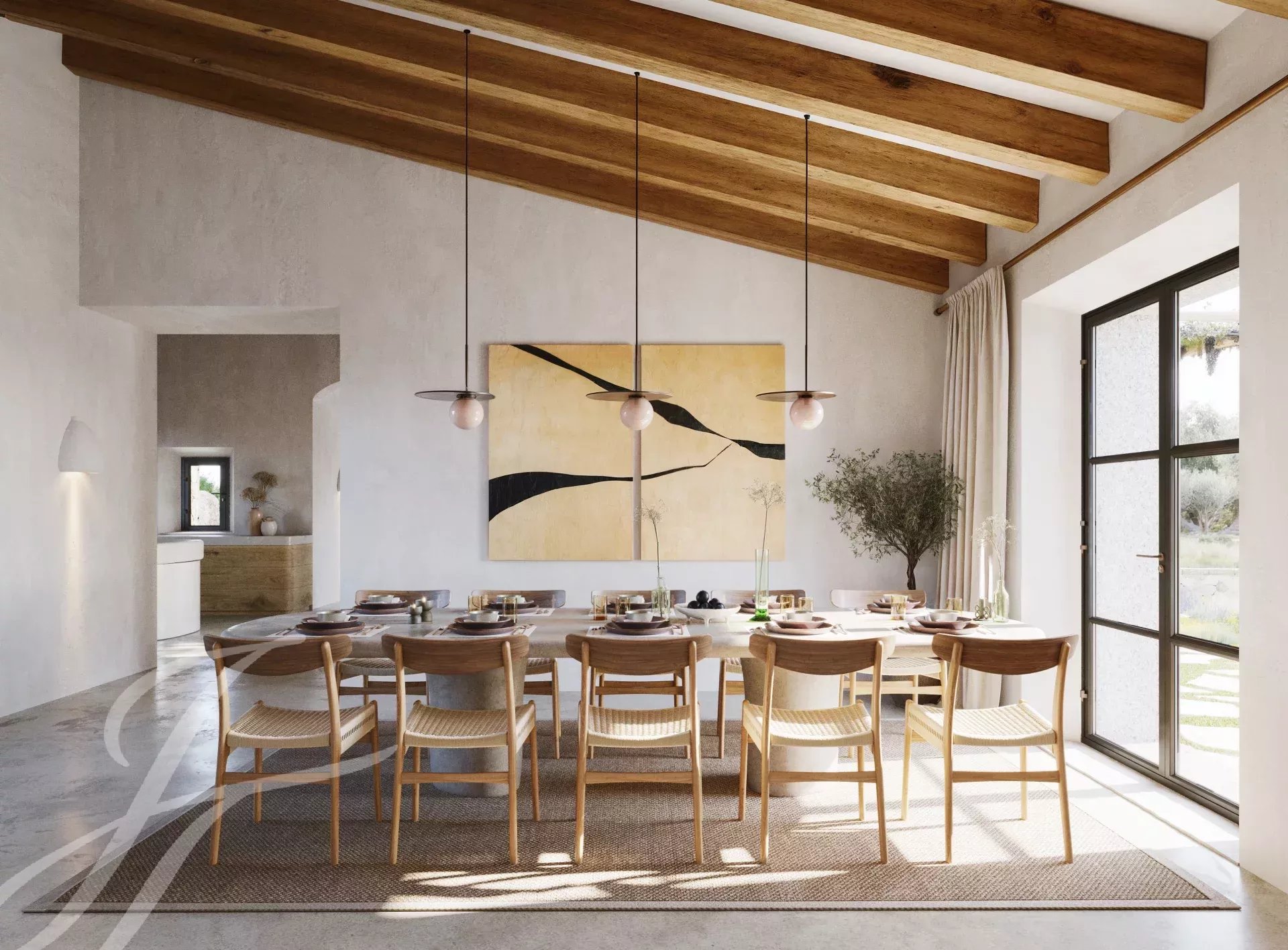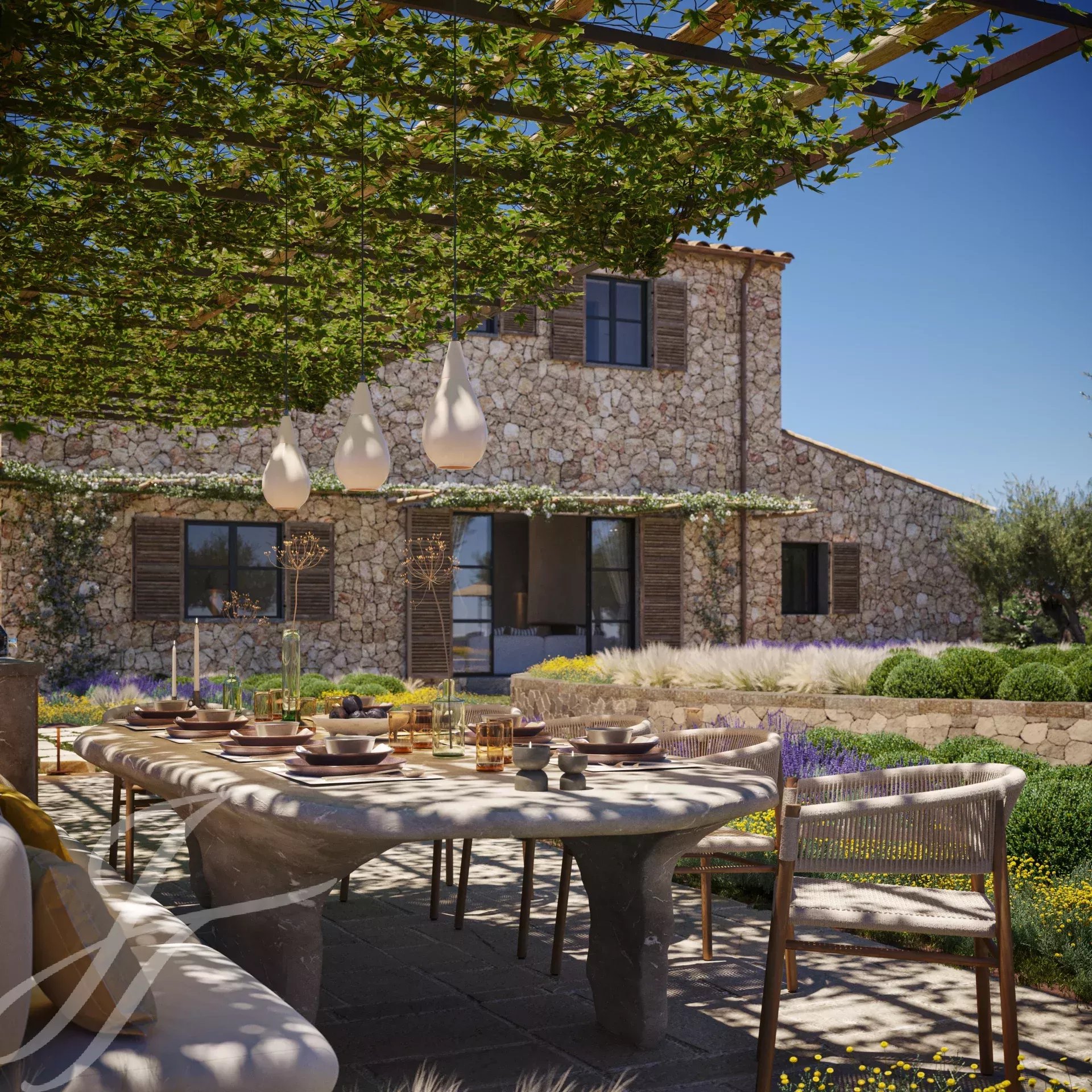 Casa Valle de los Almendros - Esta hermosa casa de campo boho-chic está en construcción en la actualidad, con finalización prevista durante Q4/2027. Situada en uno de los lugares más deseados del campo, cerca de la ciudad y del aeropuerto, asegura un acceso fácil y cómodo a la propiedad. El patio de entrada de la propiedad, la fachada de piedra, las contraventanas de madera, los techos altos con vigas de madera y también los techos abovedados junto con los suelos de piedra, las ventanas de suelo a techo y el paisaje mediterráneo crean una energía fantástica y un flujo natural en toda la casa.