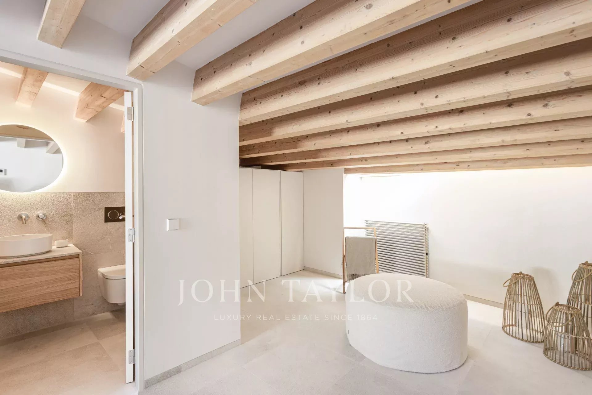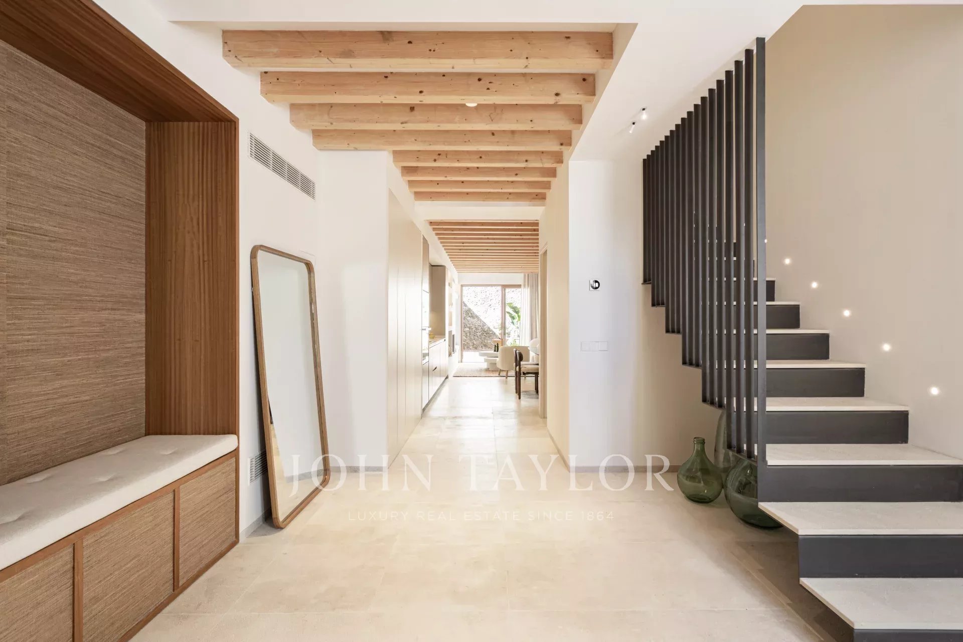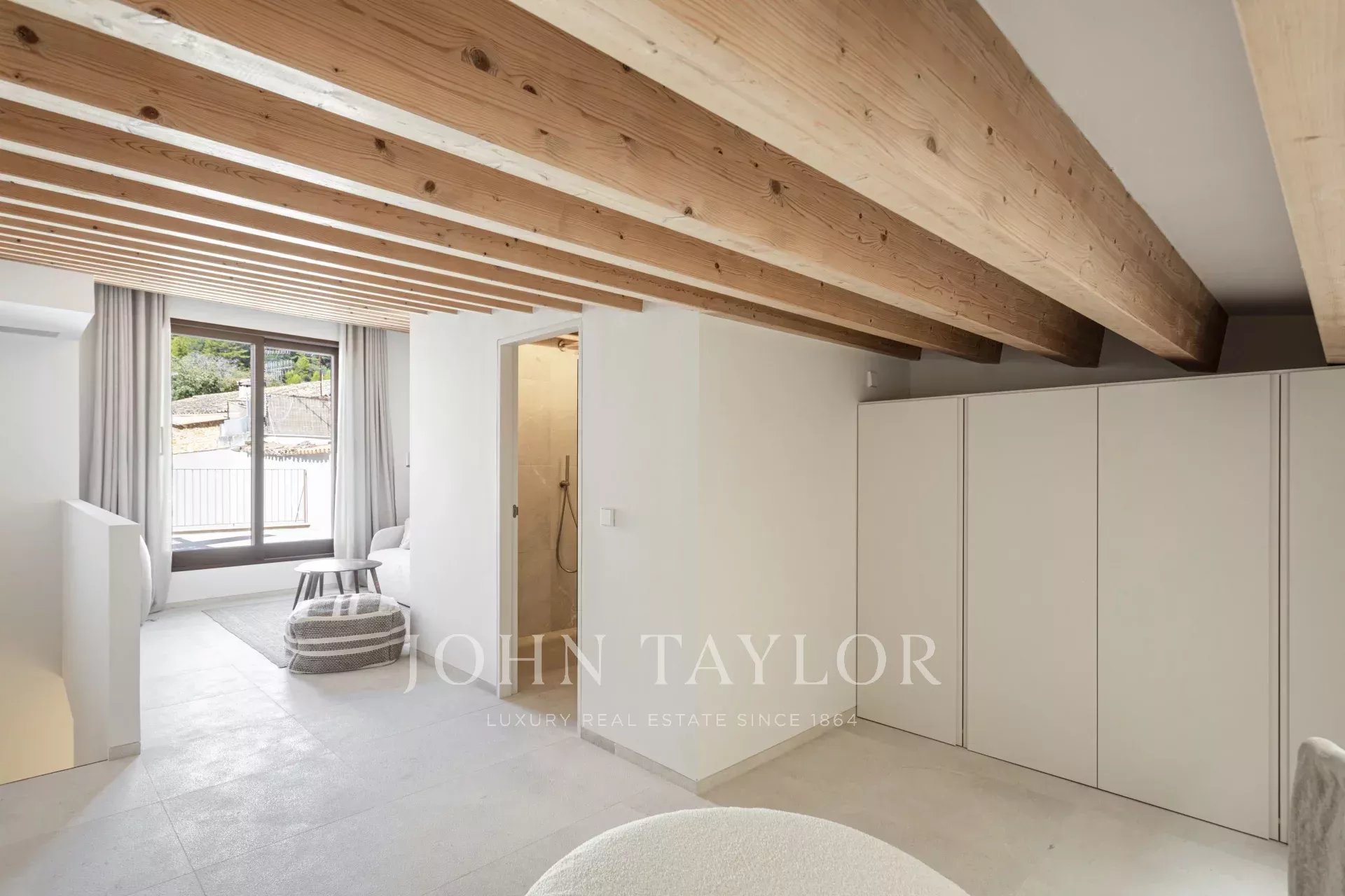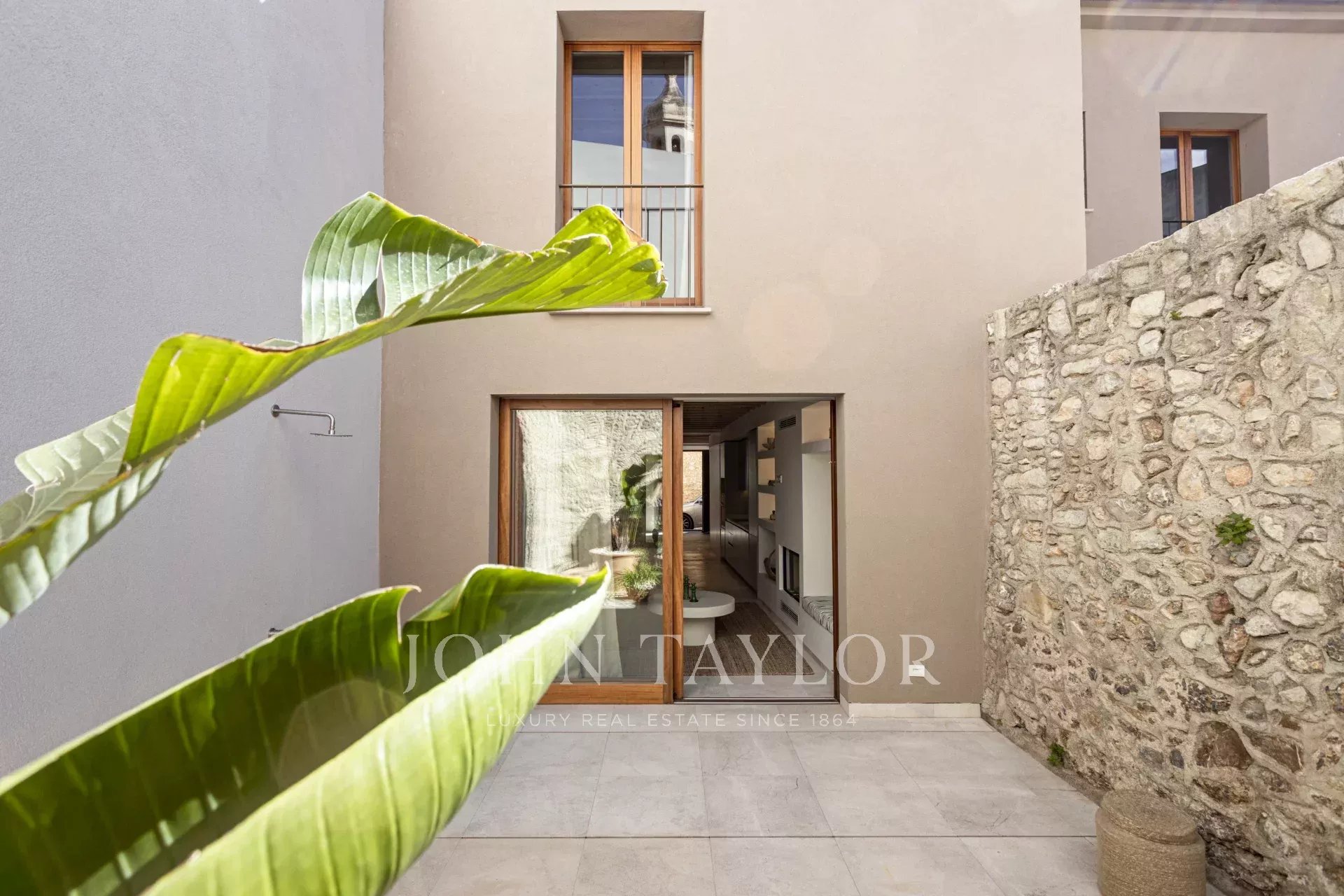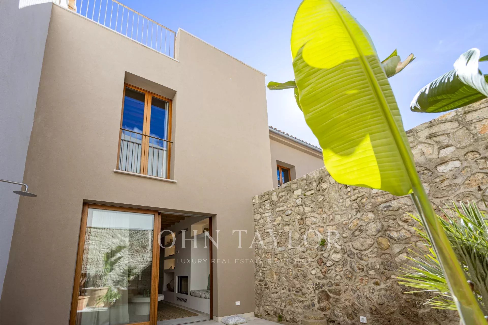Esta impresionante casa adosada de tres dormitorios, tres baños y un aseo ha sido sometida a una renovación completa, transformándola en un espacio moderno y lujoso con un toque de encanto rústico. Con una ubicación privilegiada en el centro del pueblo, a solo dos minutos a pie de la icónica iglesia, esta propiedad ofrece lo mejor de ambos mundos: comodidad urbana y el ambiente tranquilo de un entorno rural. Al ingresar a la casa, serás recibido por una sensación de calidez y elegancia. Las paredes de piedra y las vigas de madera aportan carácter y autenticidad a los espacios, mientras que los materiales de alta gama utilizados en toda la propiedad garantizan un nivel incomparable de calidad y confort. La planta baja alberga en un solo espacio la sala de estar provista de chimenea, así como un comedor y una cocina de diseño totalmente equipada con electrodomésticos de última generación y acabados de primera calidad. Desde aquí, se accede a una de las dos terrazas, donde podrás disfrutar de comidas al aire libre o simplemente relajarte bajo el cálido sol mediterráneo. La propiedad dispone de radiadores en todas las estancias además de aire acondicionado por conducto.