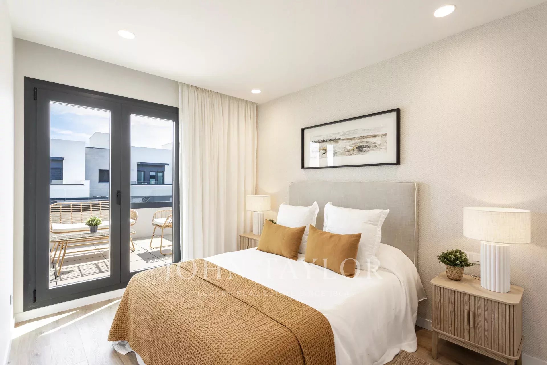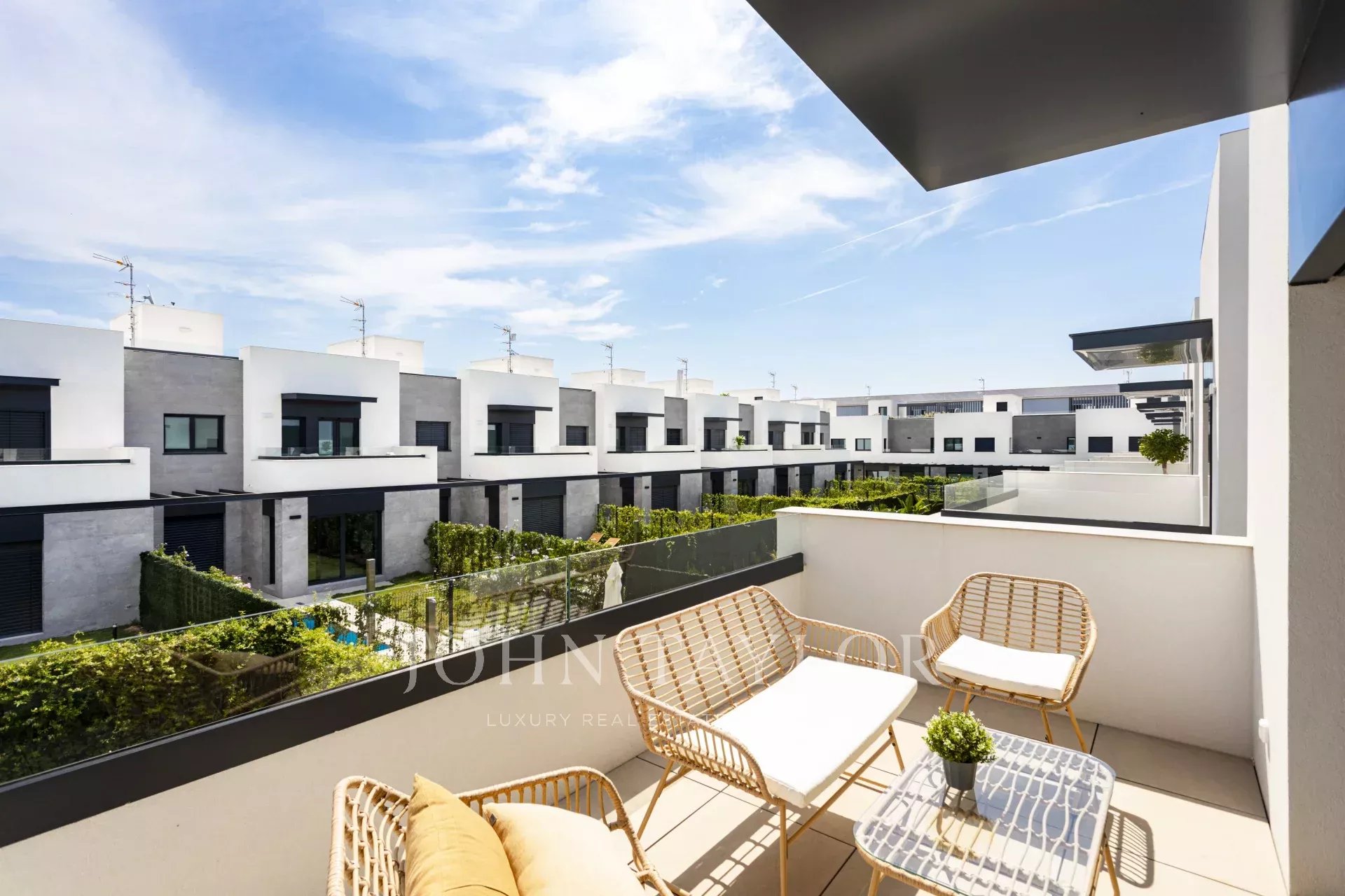 En la planta superior, el dormitorio principal se abre a un balcón acogedor con sofá y mesa, un espacio privado para desconectar o empezar el día con inspiración.