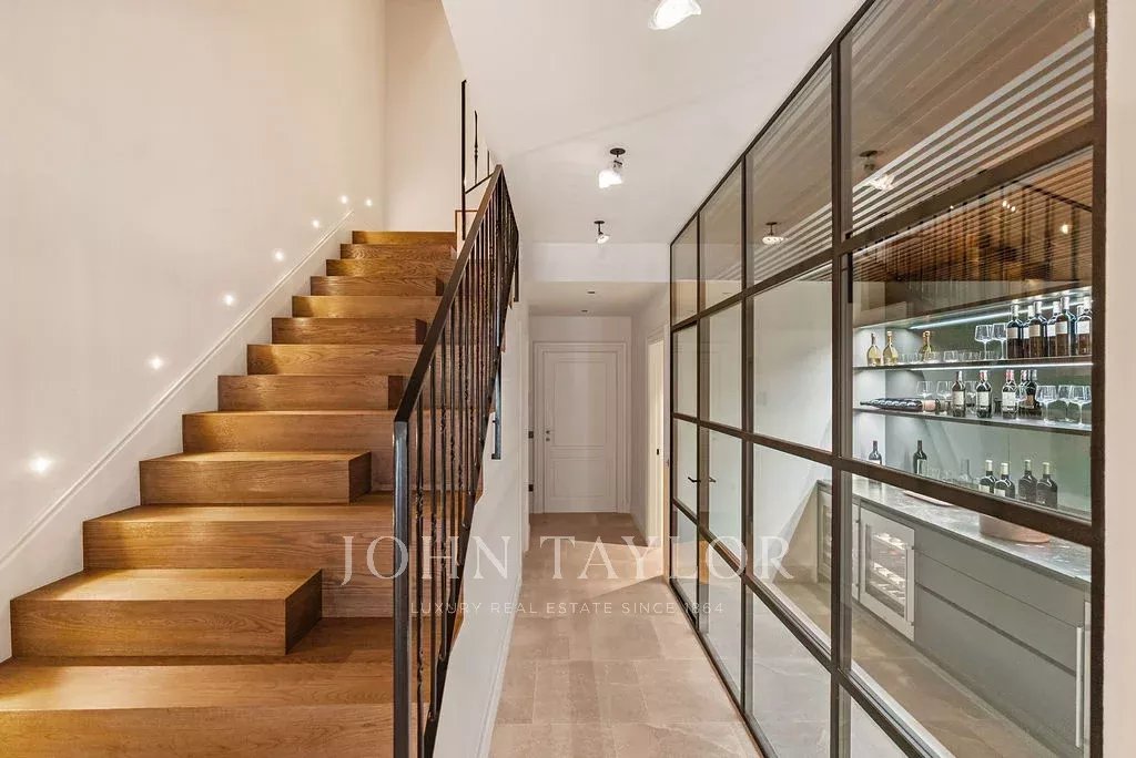 La planta baja da la bienvenida con un vestíbulo acogedor, una chimenea representativa, altos techos de madera y unas escaleras únicas. También en esta planta hay una magnífica vinoteca, lavandería y un garaje con mucho espacio para coches y bicicletas.