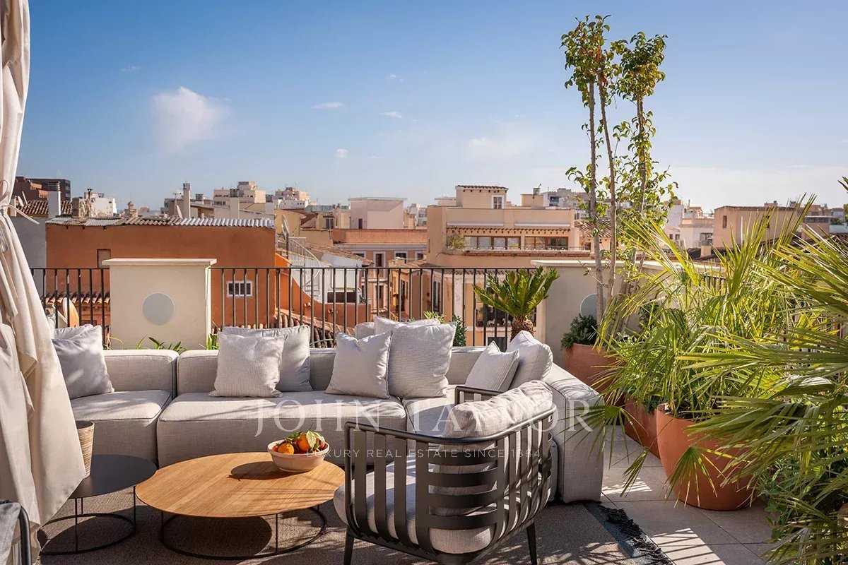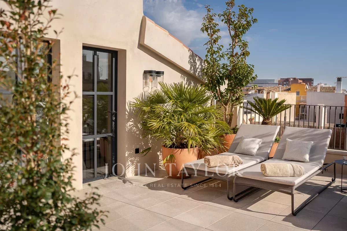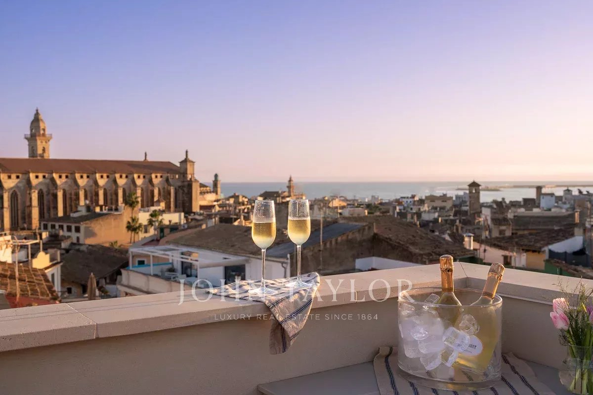 Este diseño a medida ofrece una transición perfecta de la planta baja a la terraza de la azotea, donde podrá disfrutar de unas vistas panorámicas de la catedral y el azul del Mediterráneo mientras toma el sol en las tumbonas o degusta una comida preparada en la cocina exterior totalmente amueblada. En el bar Champagne de la azotea adicional, podrá disfrutar de una vista de 360 grados, desde la bahía de Palma hasta el impresionante telón de fondo montañoso. Es realmente una de las vistas más espectaculares del casco antiguo de Palma.
