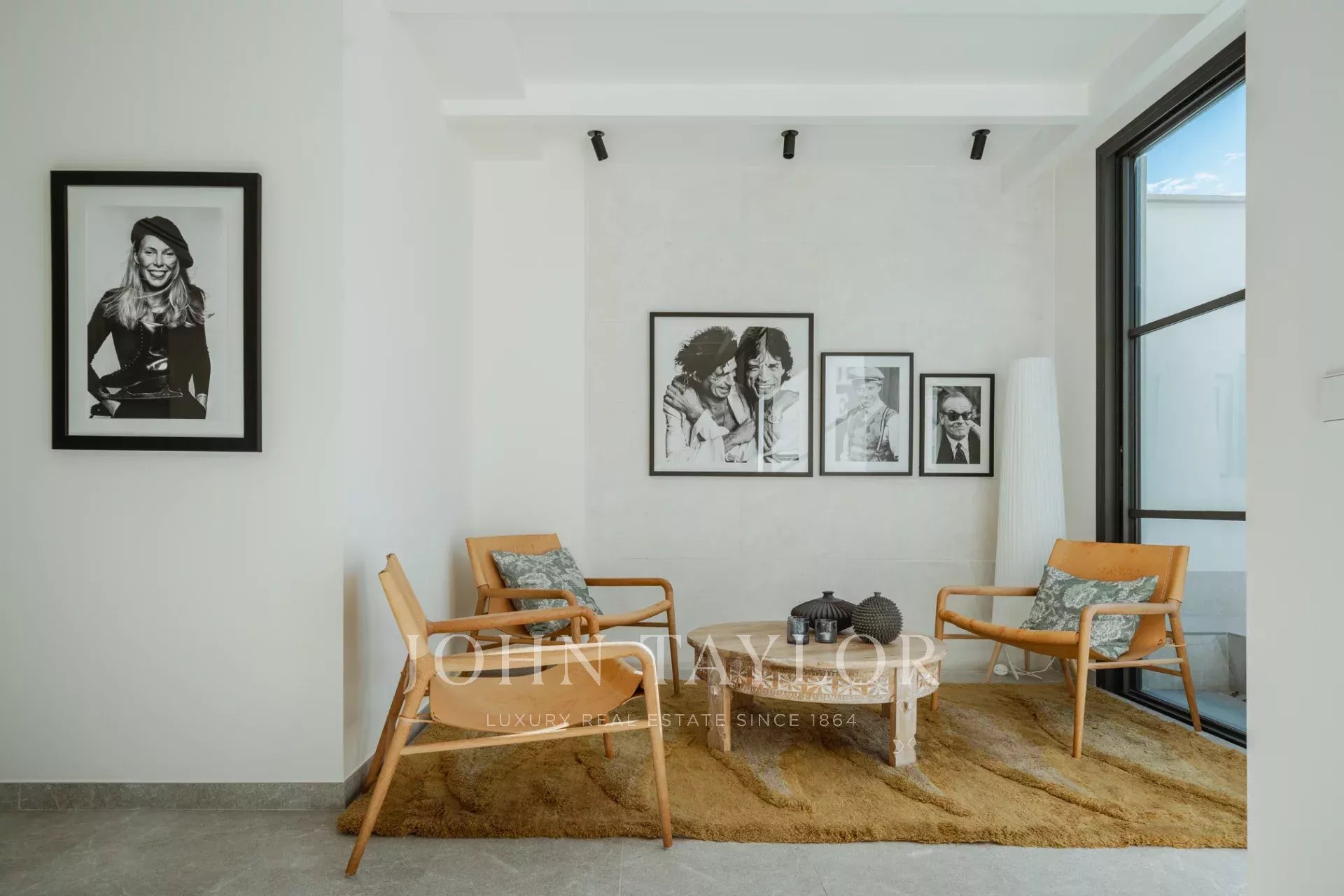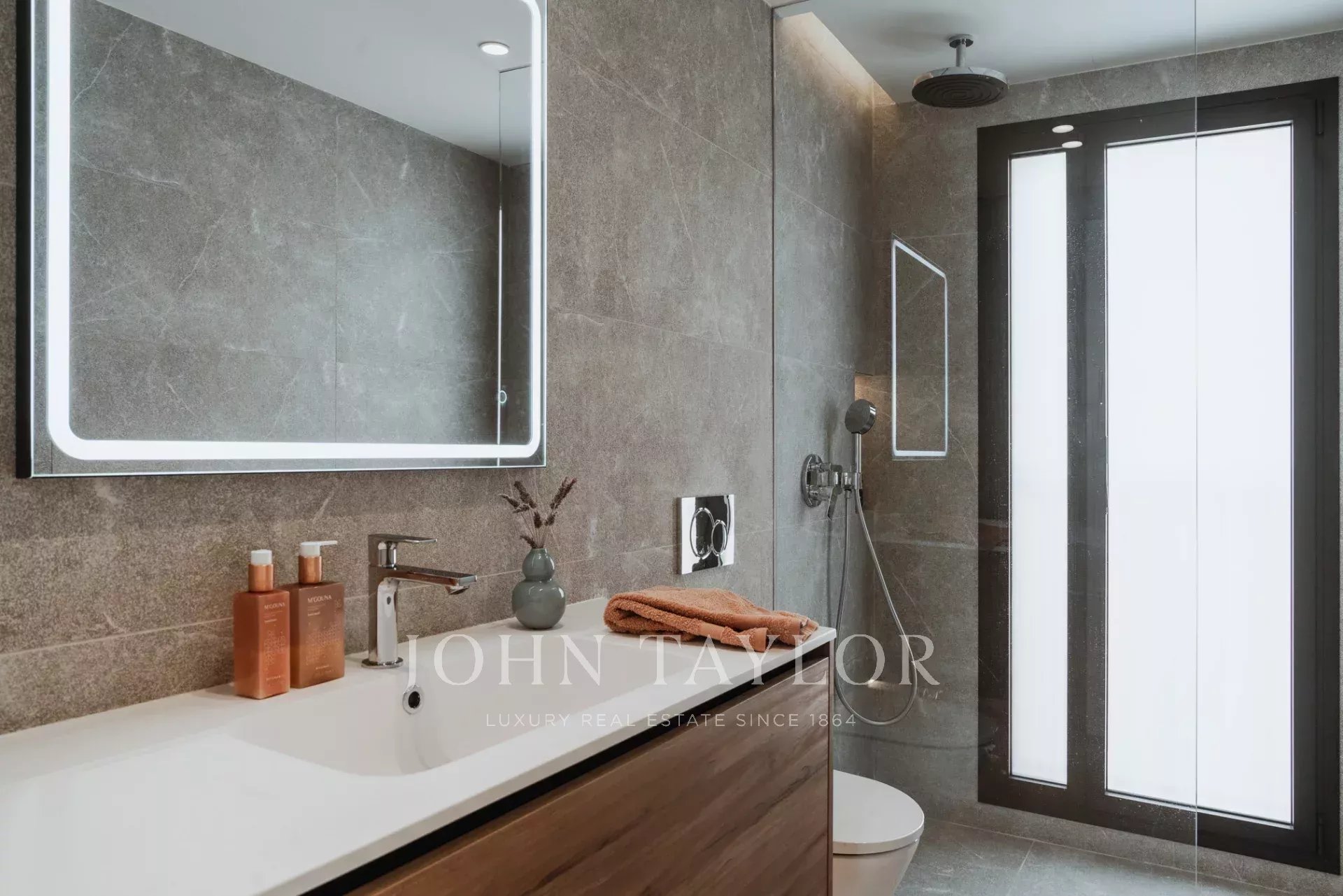 En la planta superior, dos amplios dormitorios comparten un cuarto de baño bellamente decorado, mientras que la suite principal cuenta con un cuarto de baño en suite y una terraza privada con impresionantes vistas. Una terraza en la azotea de 44 m² ofrece espacio adicional para entretenerse, tomar el sol o crear la cocina exterior de sus sueños.