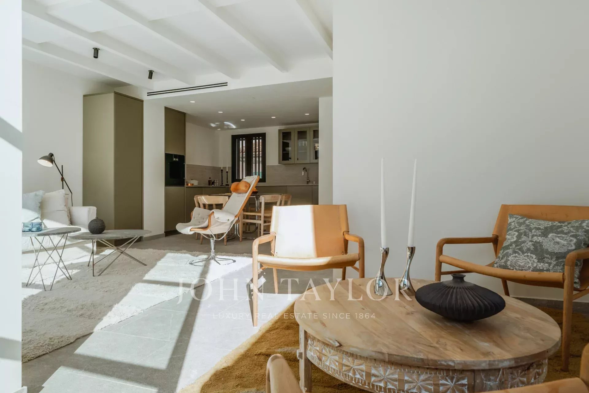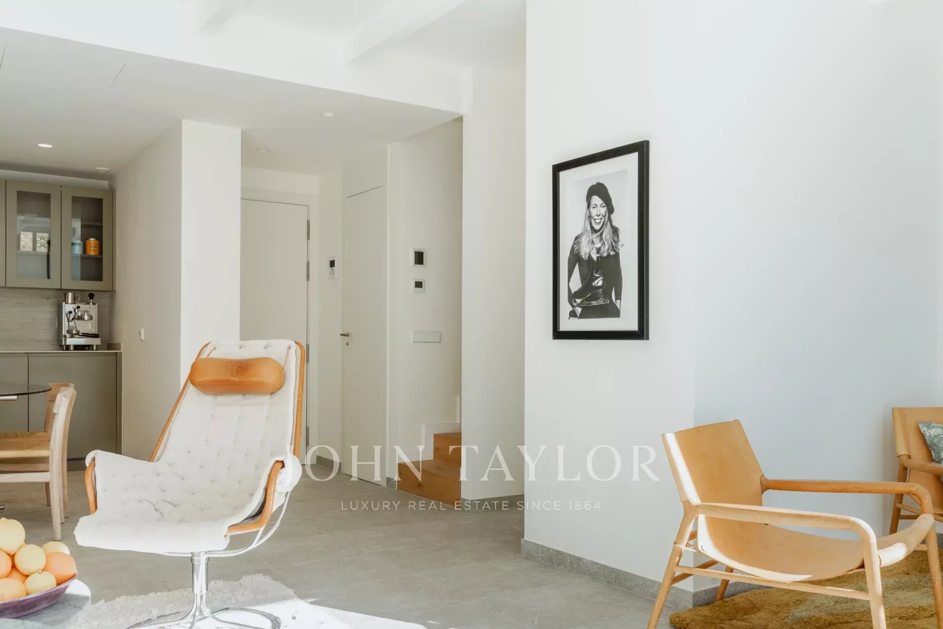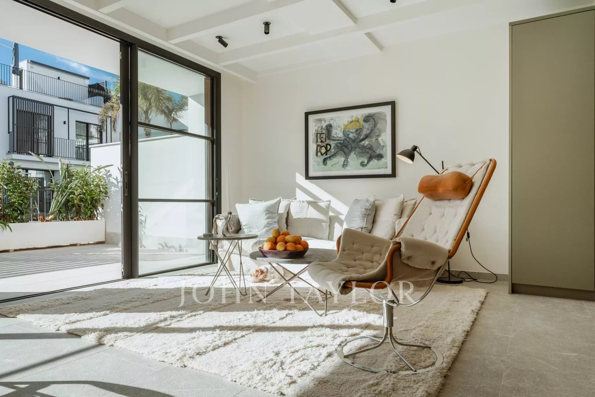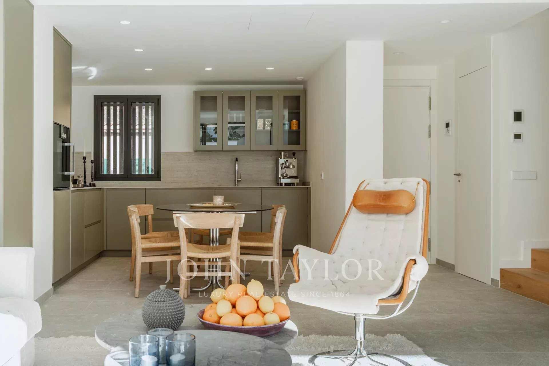Con 161 m² distribuidos en dos plantas, esta casa cuenta con un amplio salón con acceso directo a una terraza de 22 m² orientada al sur, perfecta para tomar el sol con total privacidad. La cocina Gaggenau, espaciosa, abierta y totalmente equipada, es el sueño de cualquier chef, con filtración de agua avanzada, agua con gas instantánea y un frigorífico de tamaño completo. La cocina conecta a la perfección con la zona de estar y el rincón de lectura, y al abrir completamente las ventanas de la terraza, el interior se funde con el exterior.