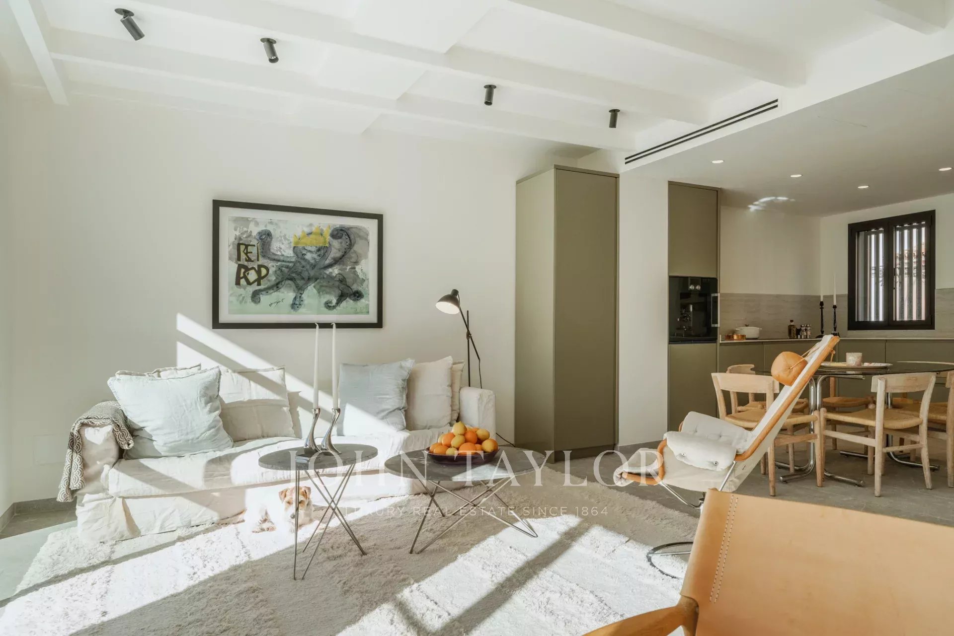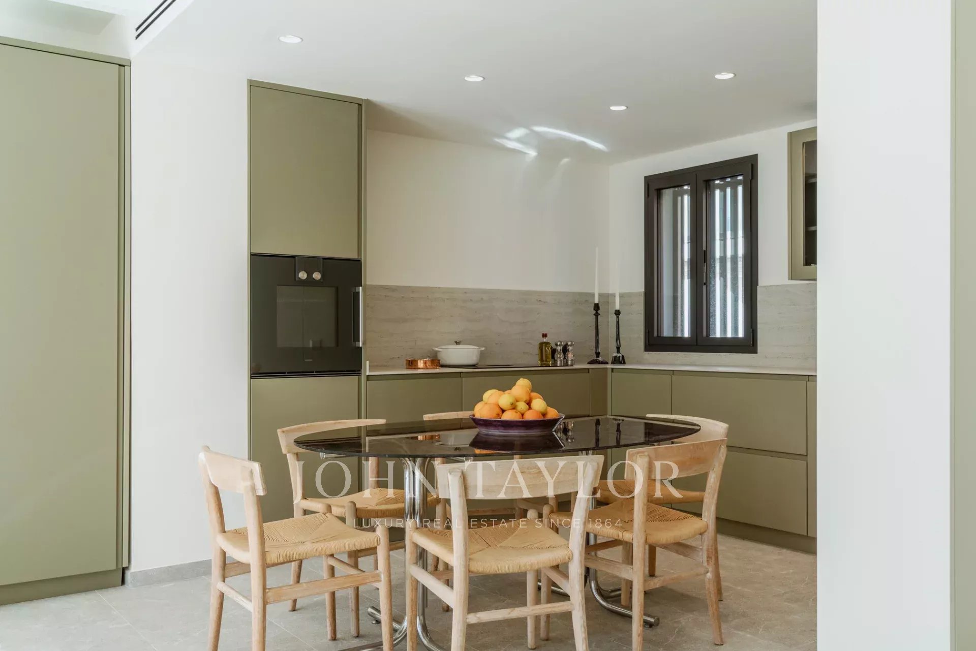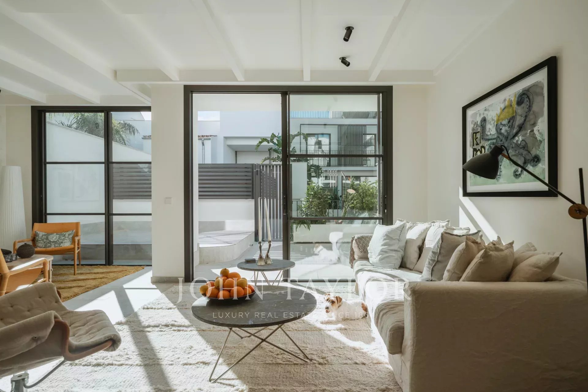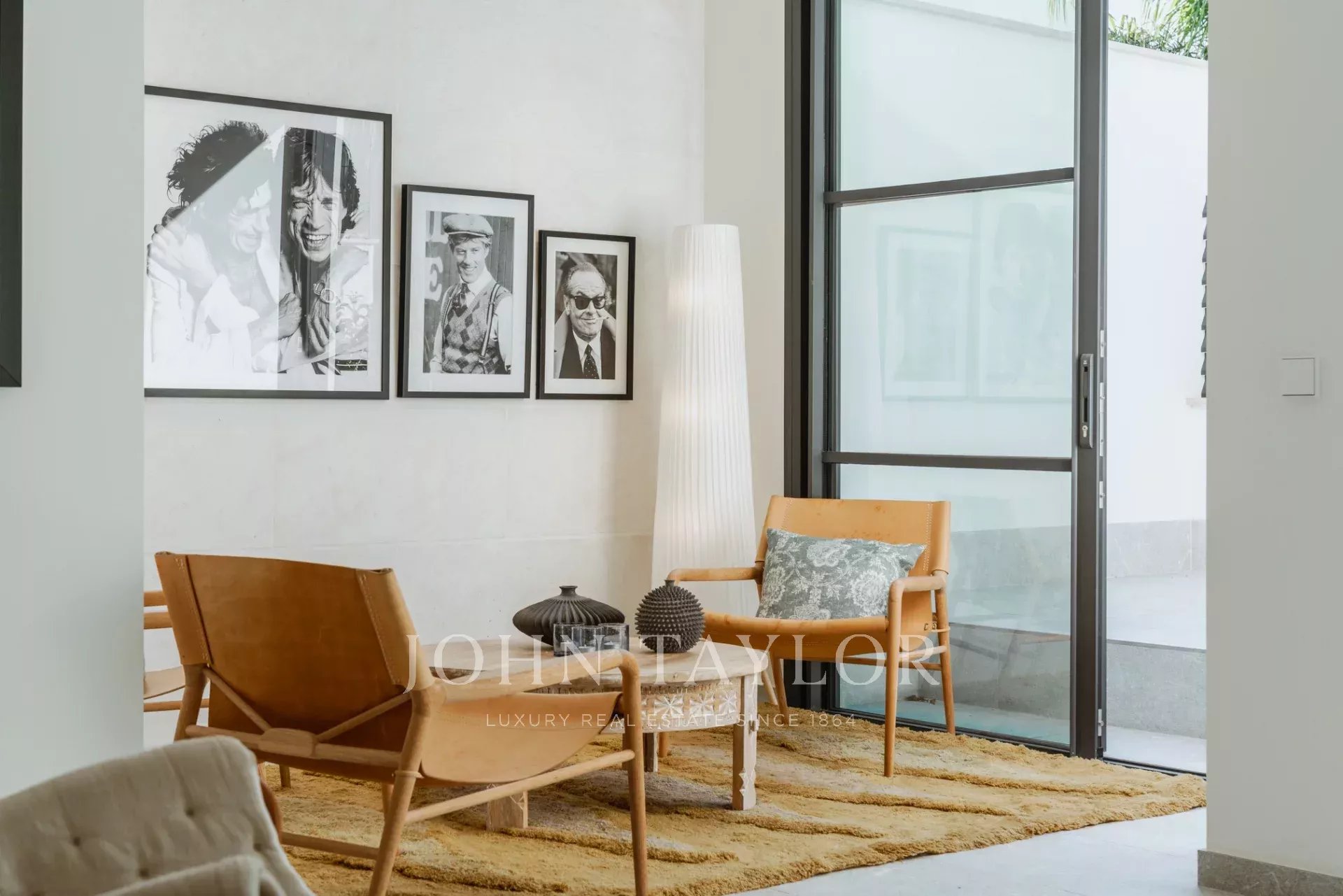 Con 161 m² distribuidos en dos plantas, esta casa cuenta con un amplio salón con acceso directo a una terraza de 22 m² orientada al sur, perfecta para tomar el sol con total privacidad. La cocina Gaggenau, espaciosa, abierta y totalmente equipada, es el sueño de cualquier chef, con filtración de agua avanzada, agua con gas instantánea y un frigorífico de tamaño completo. La cocina conecta a la perfección con la zona de estar y el rincón de lectura, y al abrir completamente las ventanas de la terraza, el interior se funde con el exterior.