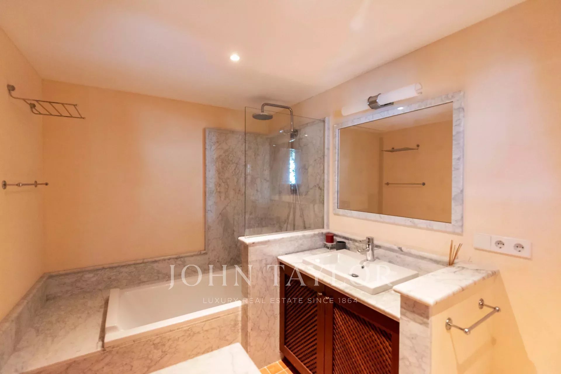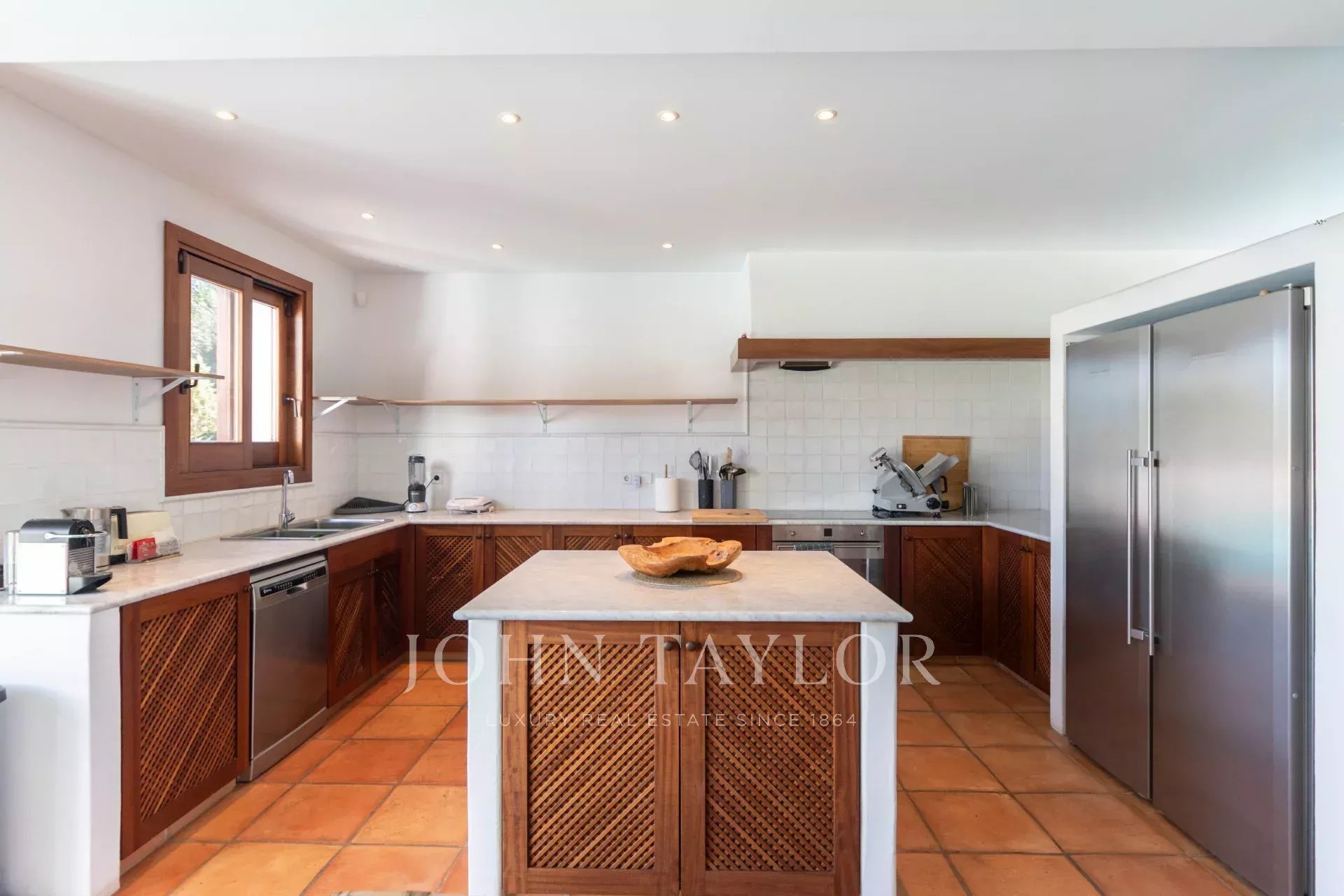 Junto a la casa principal, una encantadora casa de invitados se alza frente a la piscina. En su planta superior alberga una segunda suite principal con baño en suite, vestidor y terraza privada. La planta baja dispone de un espacio versátil con su propio baño, que puede utilizarse como un sexto dormitorio.