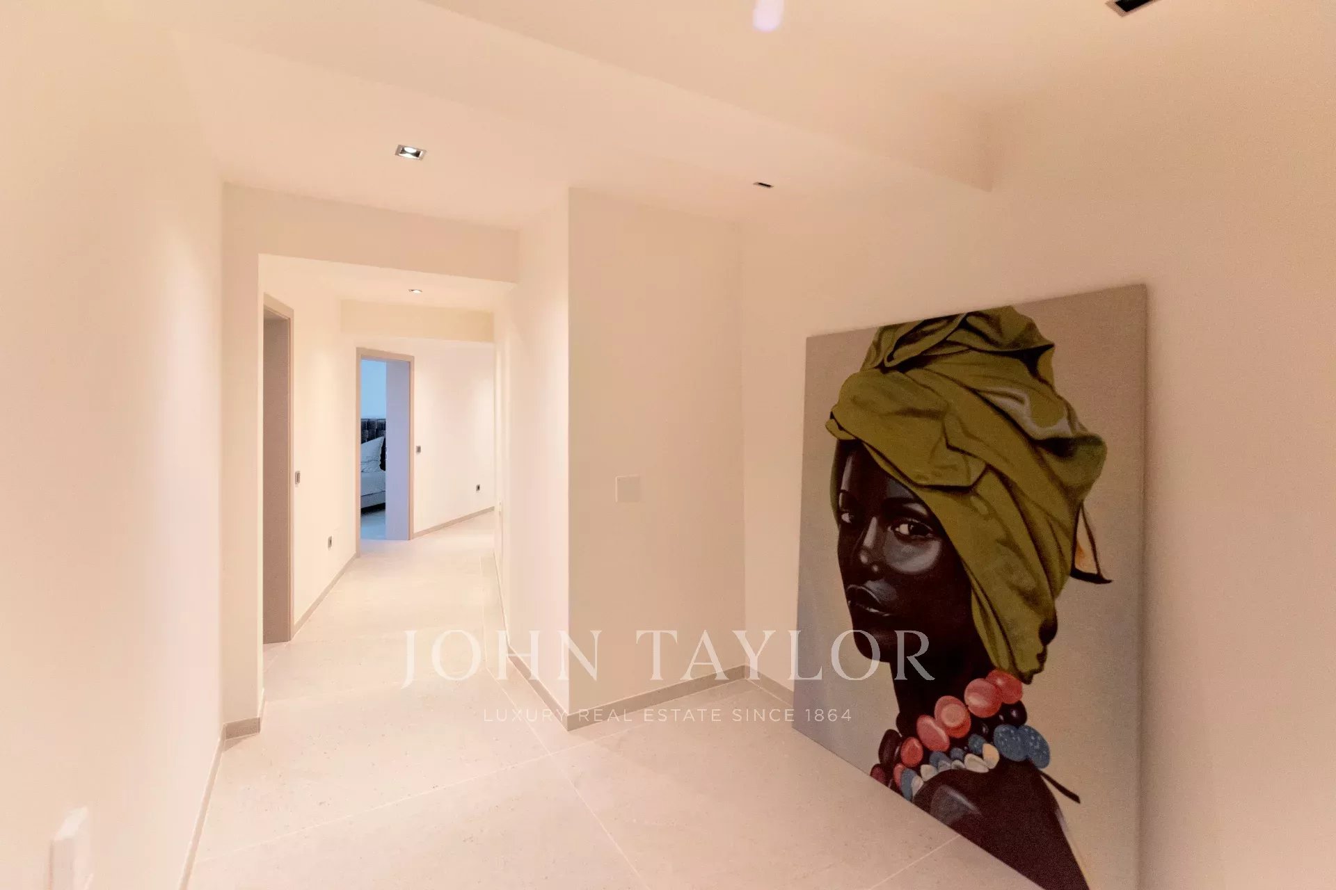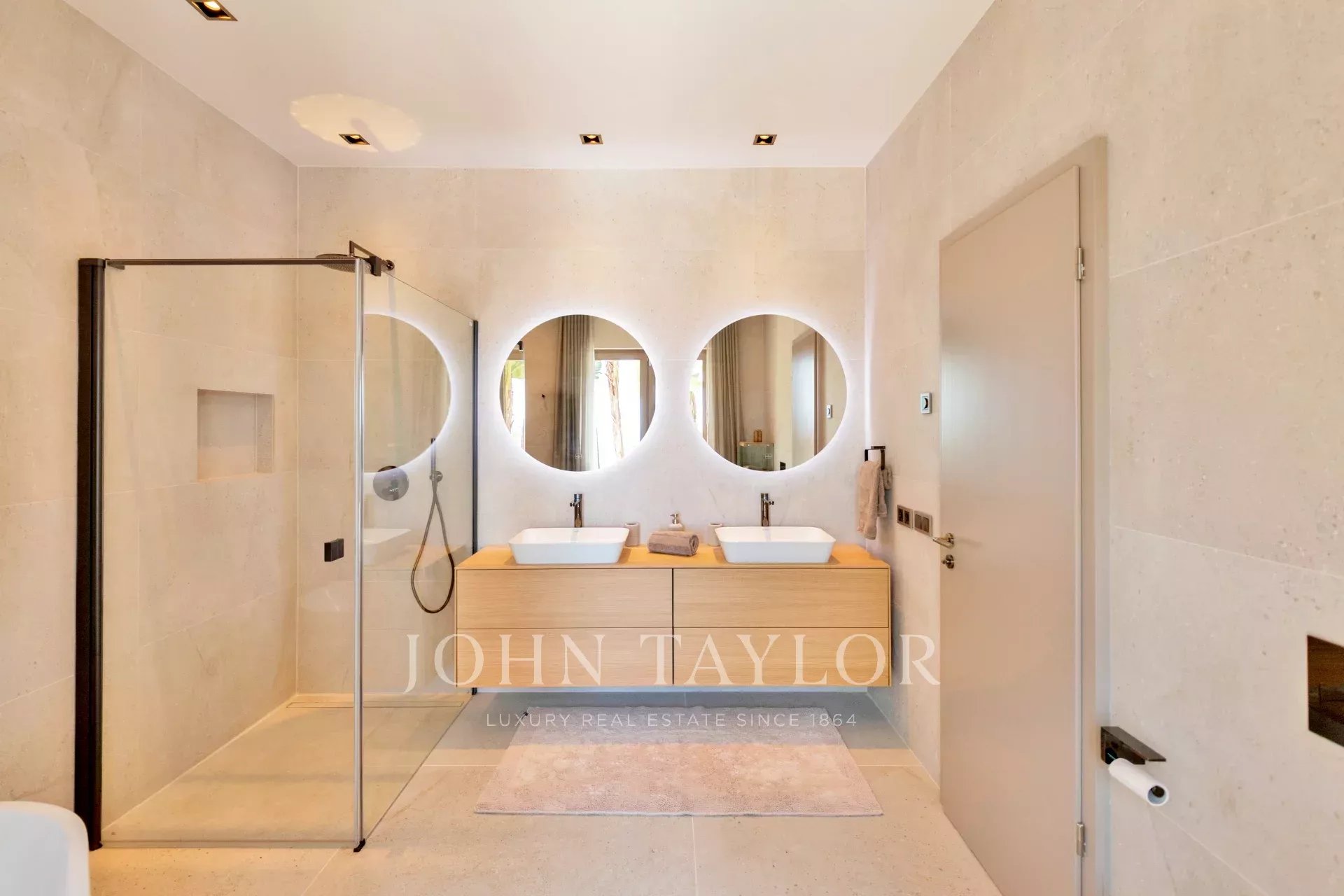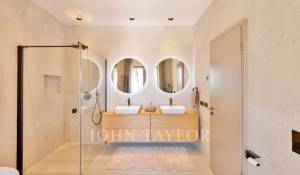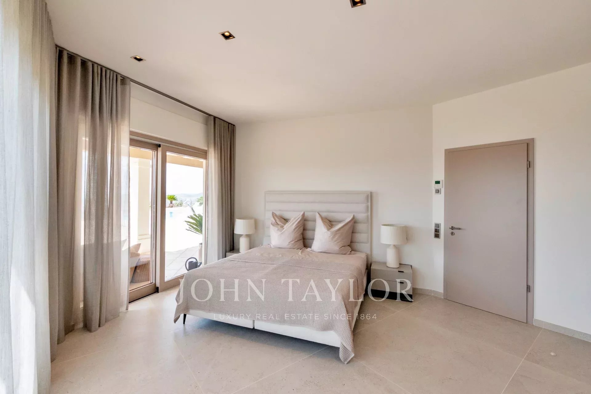 En el nivel superior, la villa dispone de cuatro dormitorios espaciosos, todos con baño en suite y vestidor. Dos de ellos son amplias suites principales con acceso directo a terrazas privadas que ofrecen vistas espectaculares de la ciudad de Ibiza y la bahía de Talamanca.