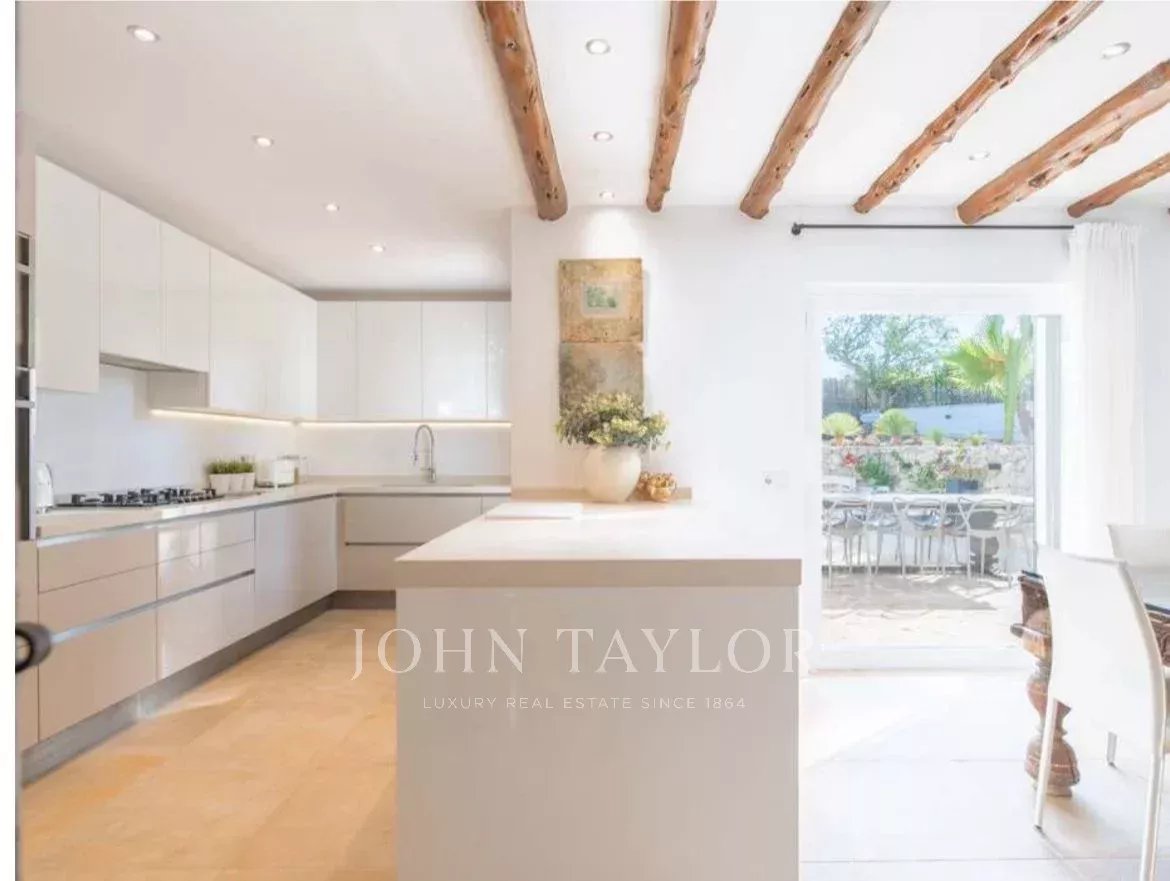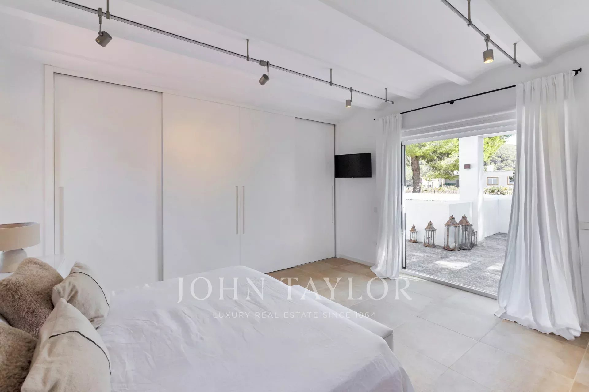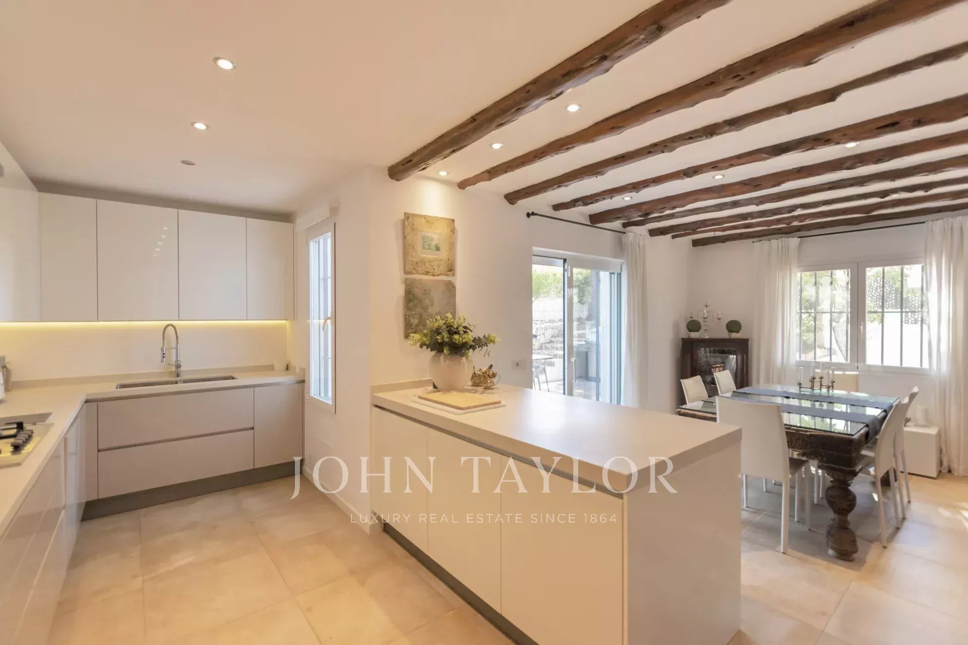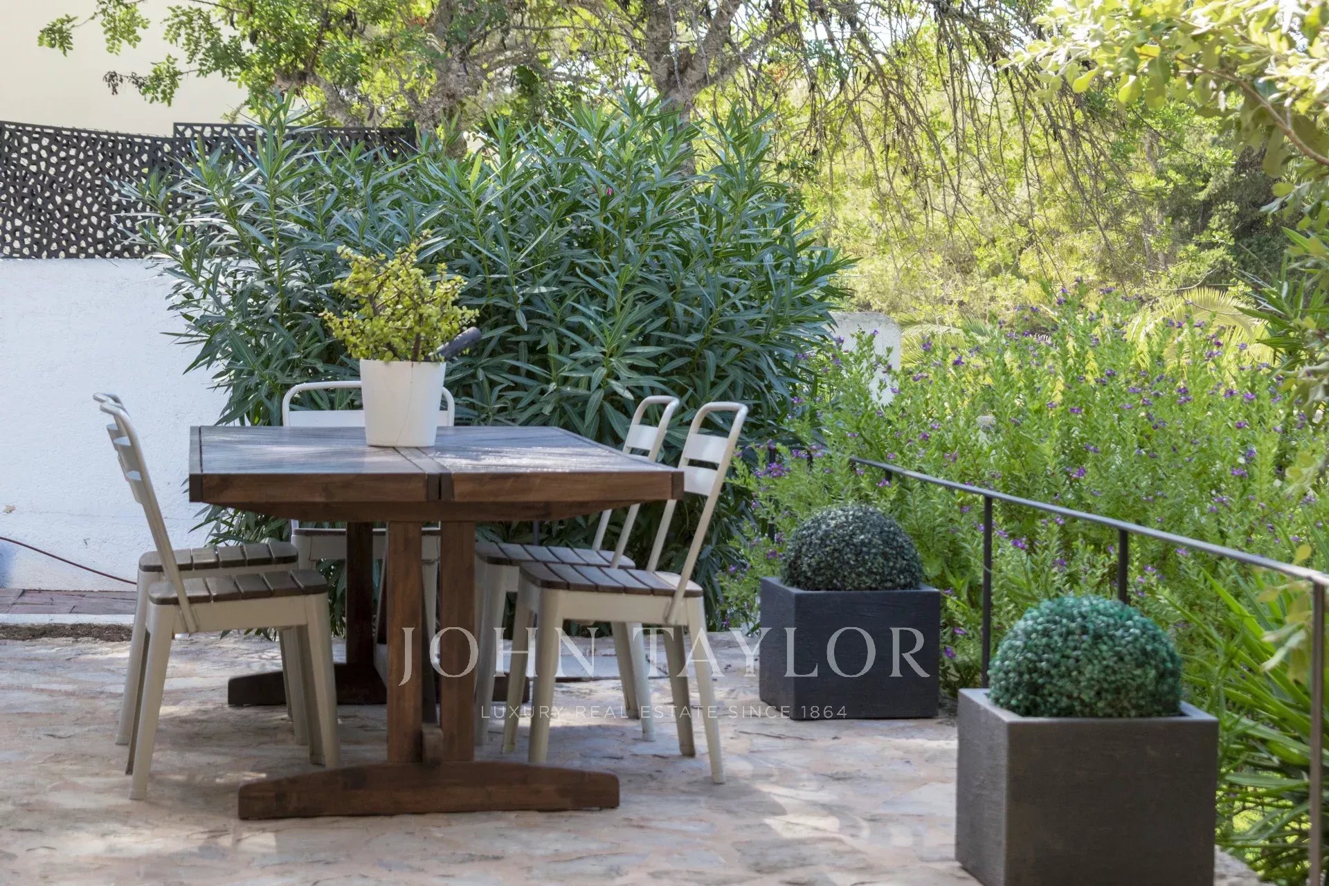 La villa principal, de 340 m², te recibe con un luminoso salón con chimenea y grandes ventanales que se abren a los jardines cuidados. La cocina recientemente renovada combina estilo y funcionalidad, con un amplio comedor y acceso directo a una gran terraza con barbacoa, ideal para disfrutar de comidas al aire libre. En la planta baja hay una suite con baño en suite y despacho, fácilmente adaptable como suite de invitados, junto a dos dormitorios adicionales que comparten un baño, un cuarto de lavandería y un aseo de invitados. En la planta superior, la suite principal ofrece vestidor, baño privado y una gran terraza con vistas a la montaña. Cada detalle está pensado para vivir todo el año, incluyendo calefacción por suelo radiante y ventanas de doble acristalamiento. Varias terrazas y zonas chill-out conducen a la encantadora zona de piscina, rodeada de un frondoso paisaje mediterráneo que garantiza total privacidad.